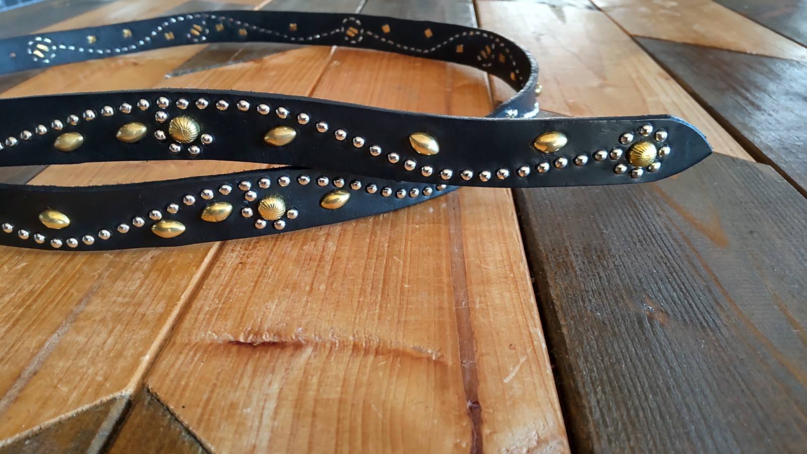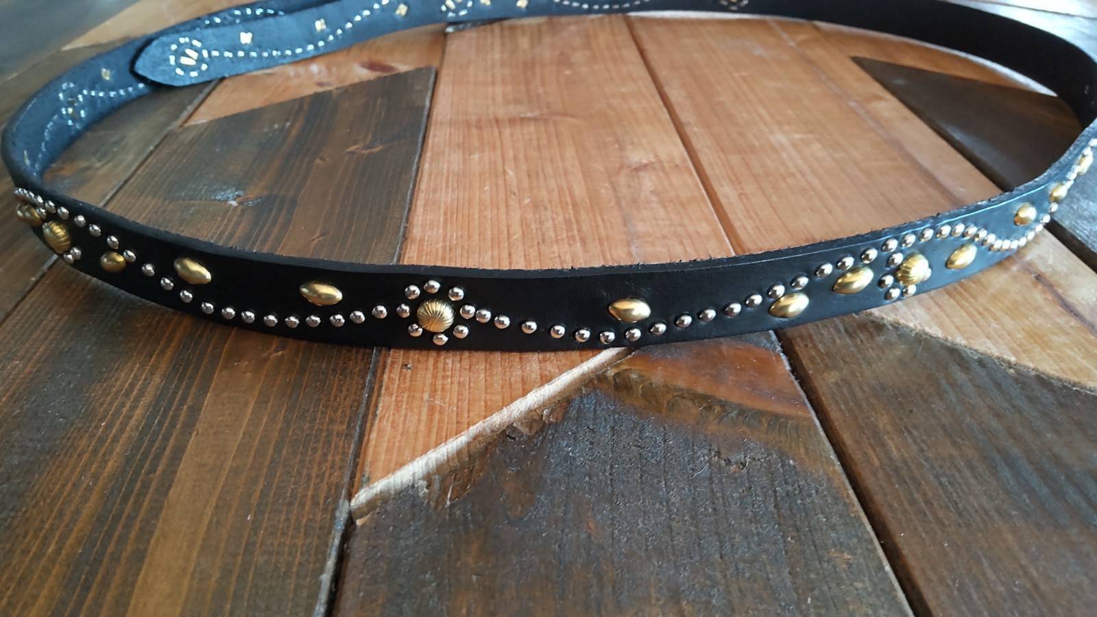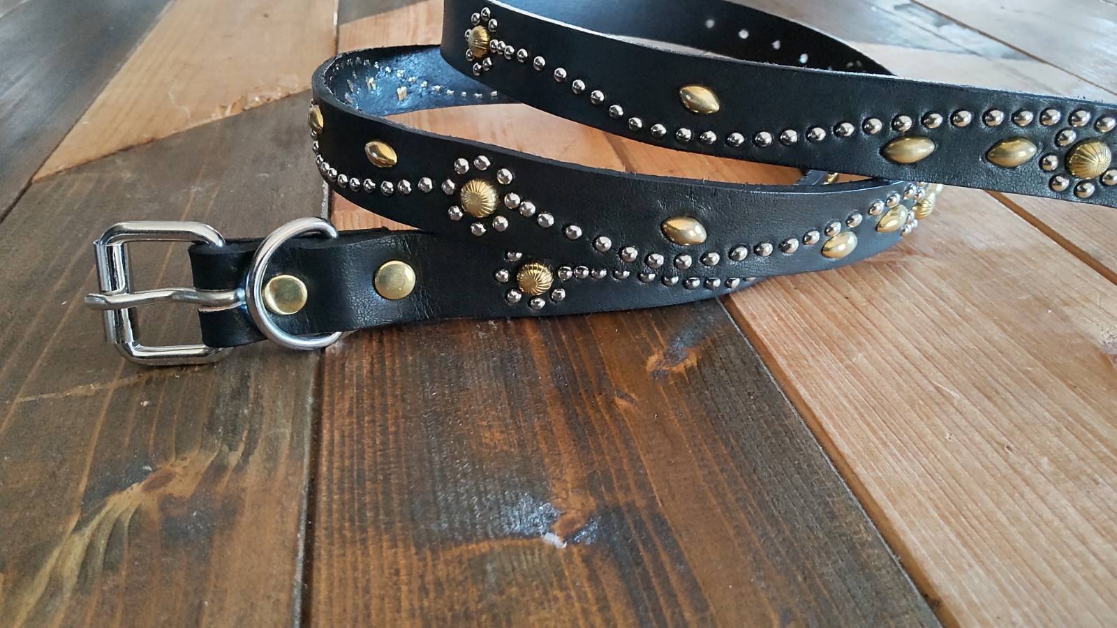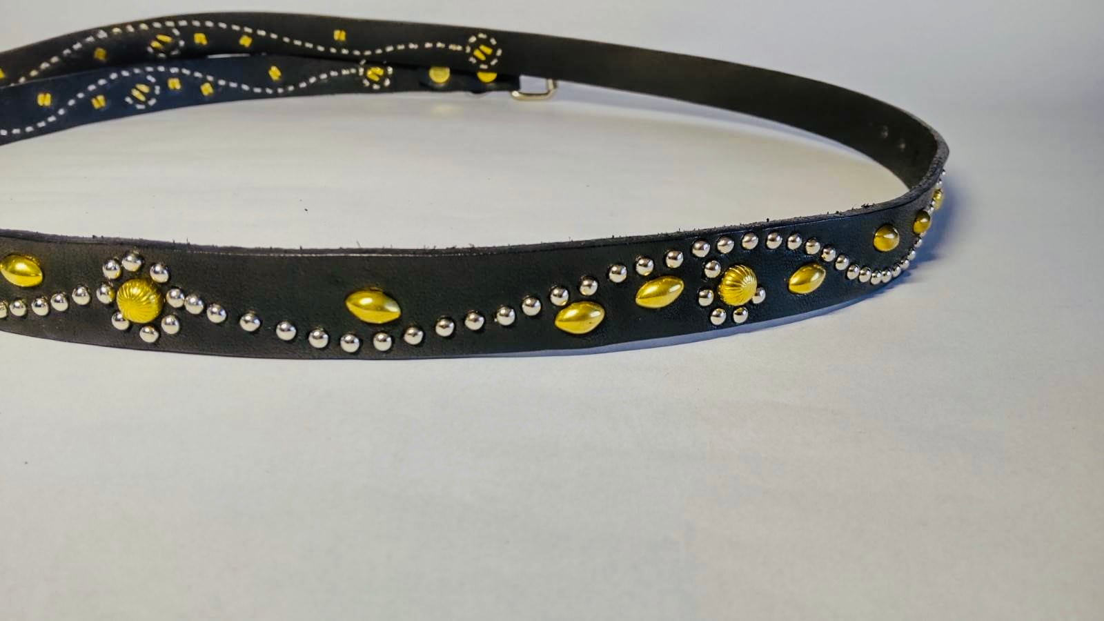 ベルト全体360度にフラワースタッズを施したナローベルト。着用画像の剣先はシャープになります。バックルの留め具がスナップボタン式ですのでバックルの取り外しが可能です。【ゴールドブラススタッズ】はクスミのない明るいゴールド色のスタッズです。
