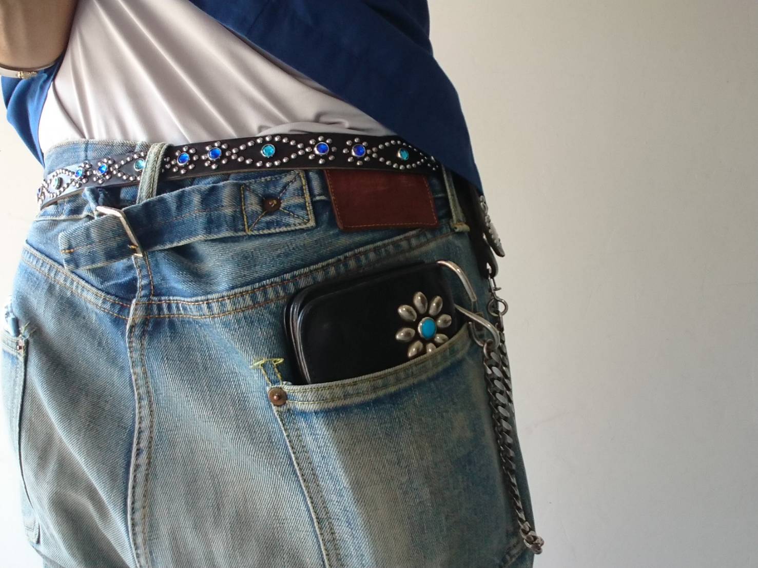 ベルト全体の360度にバタフライパターンスタッズを施したナローベルト。着用画像のケンサキスタイルはシャープです。