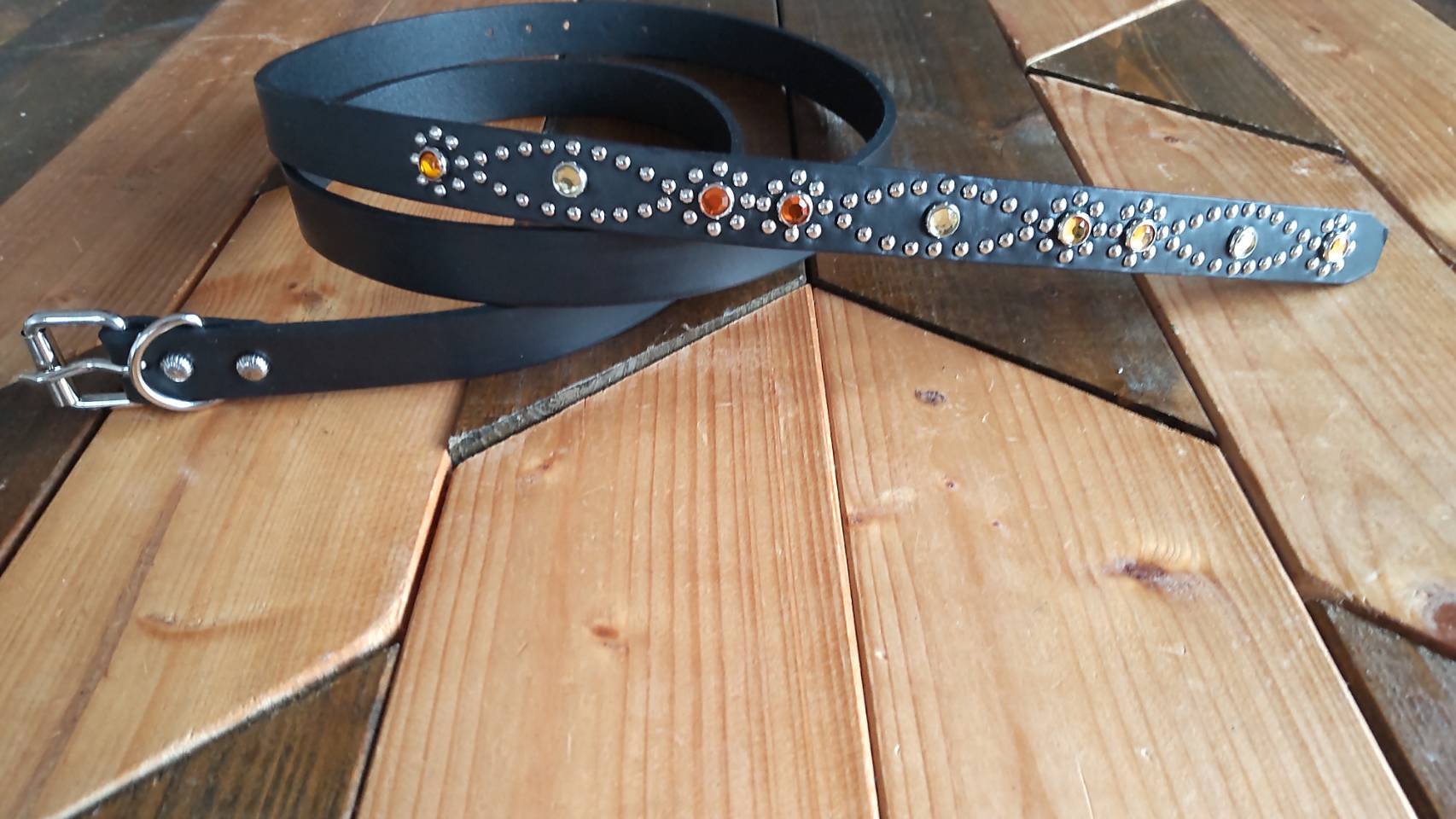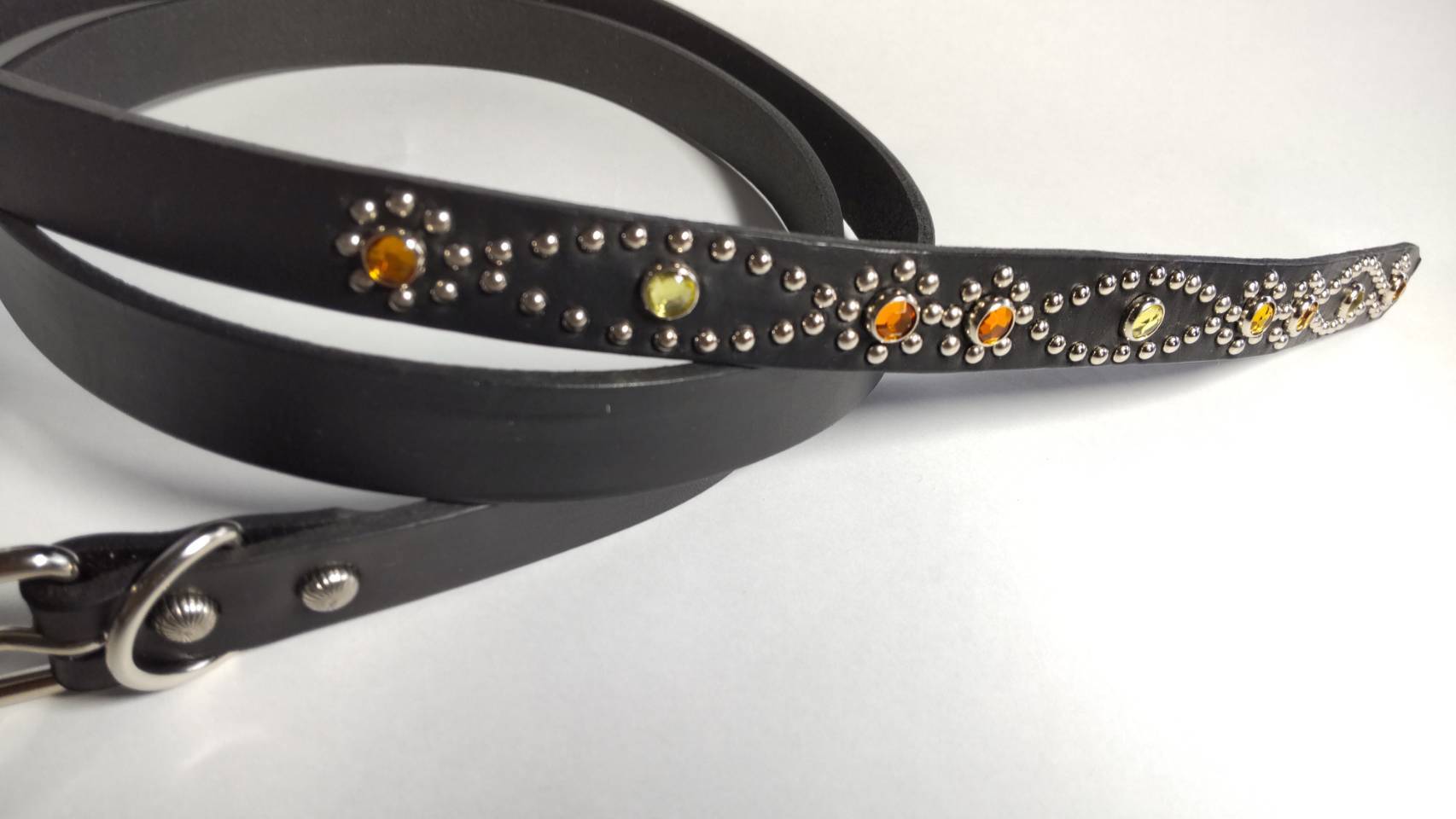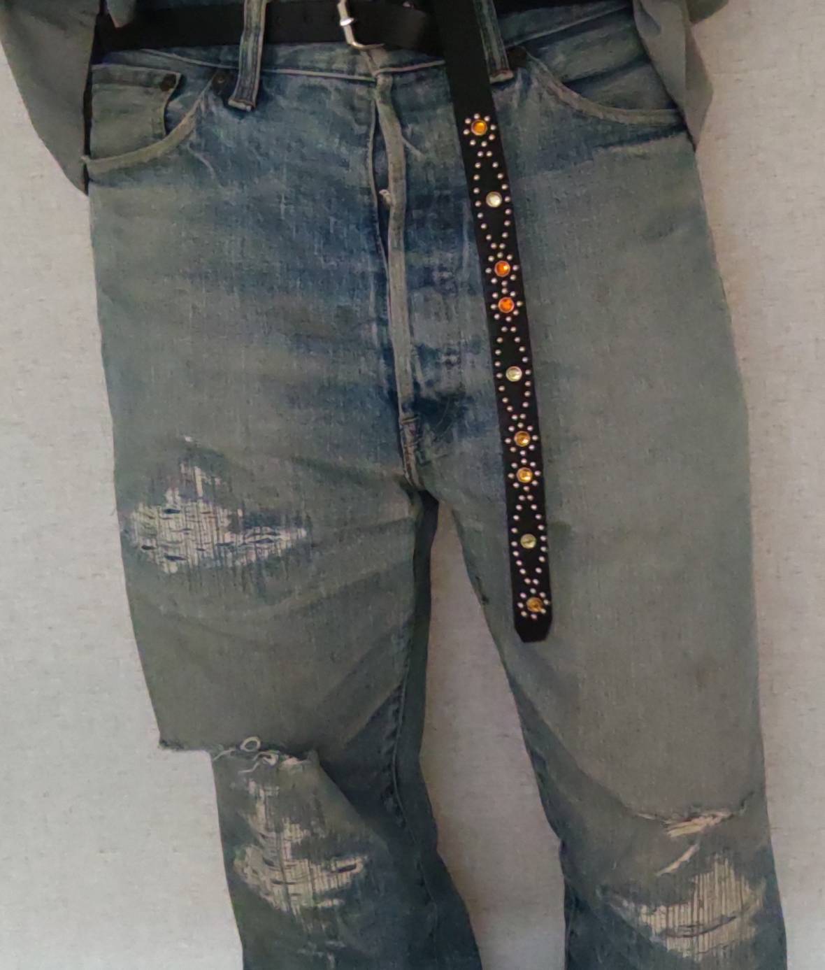 剣先にバタフライパターンスタッズを施したナローベルト。着用画像は剣先スクエア、スーパーナローを選択しクラシックノットスタイルで着用しております。スーパーナロー(クラシックノットスタイル)について詳しくはホームページブログにて掲載しております。