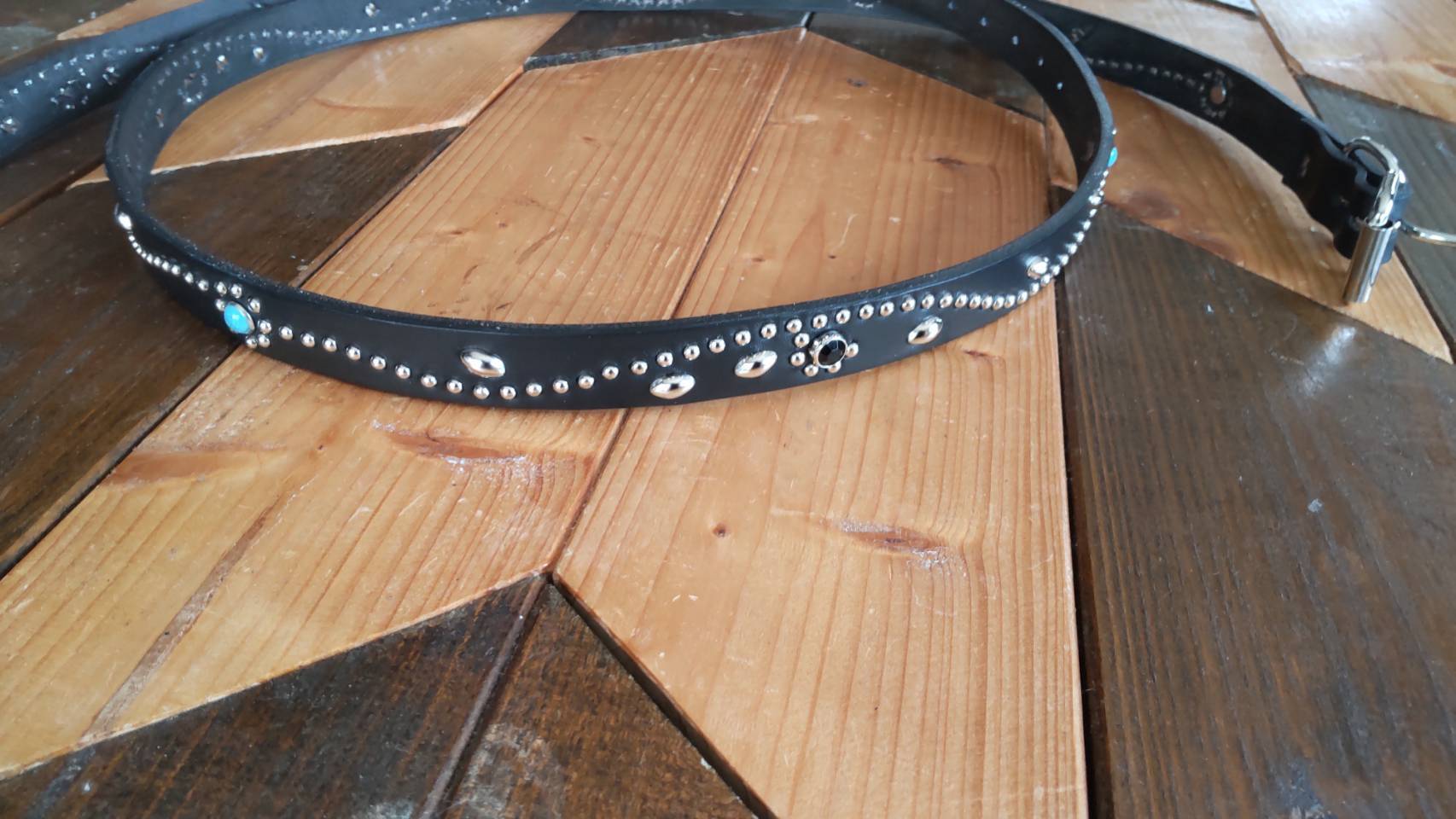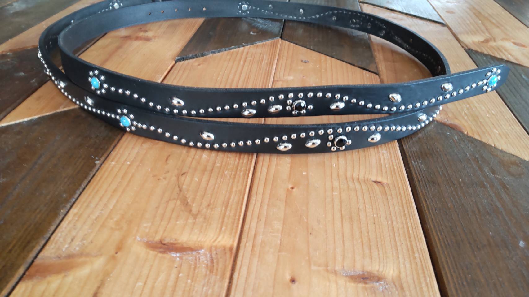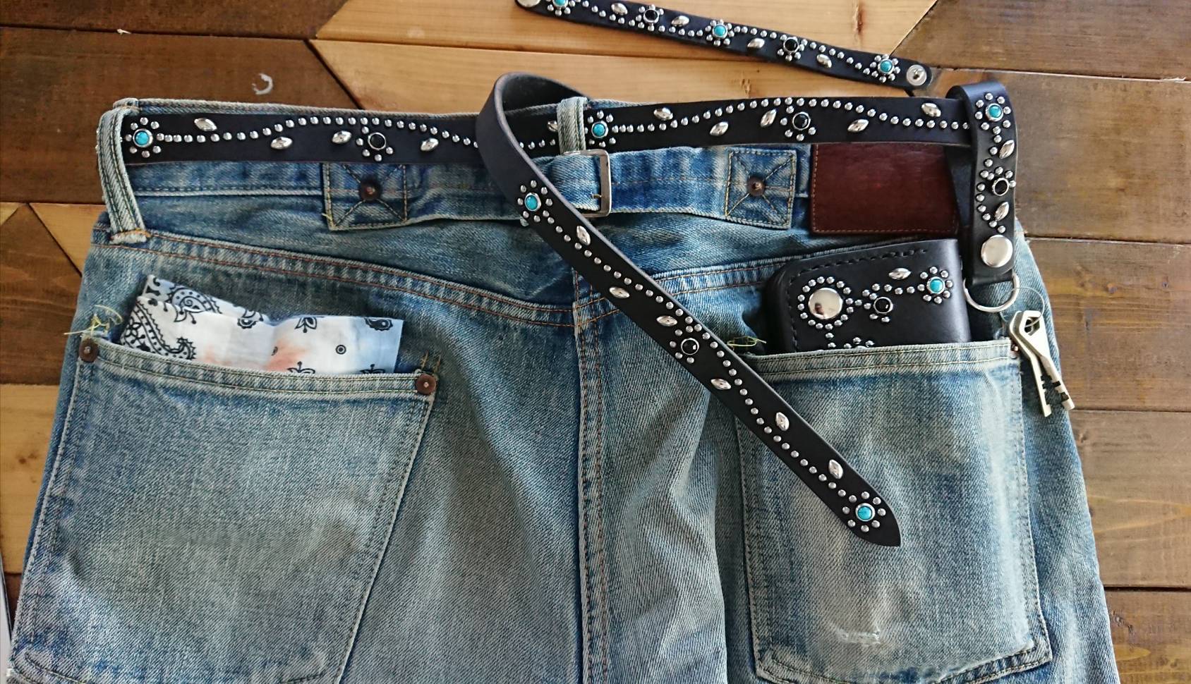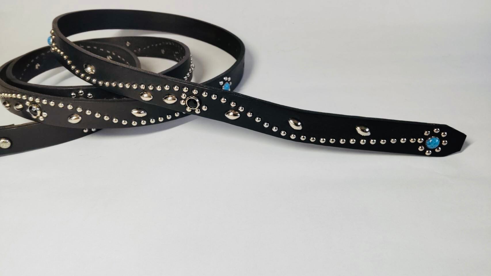 ベルト全体の360度にスタッズを施したナローベルト。ヒマラヤの高地に咲く花、ブルーポピーをモチーフとしています。モデル着用画像の先端の形はシャープ。