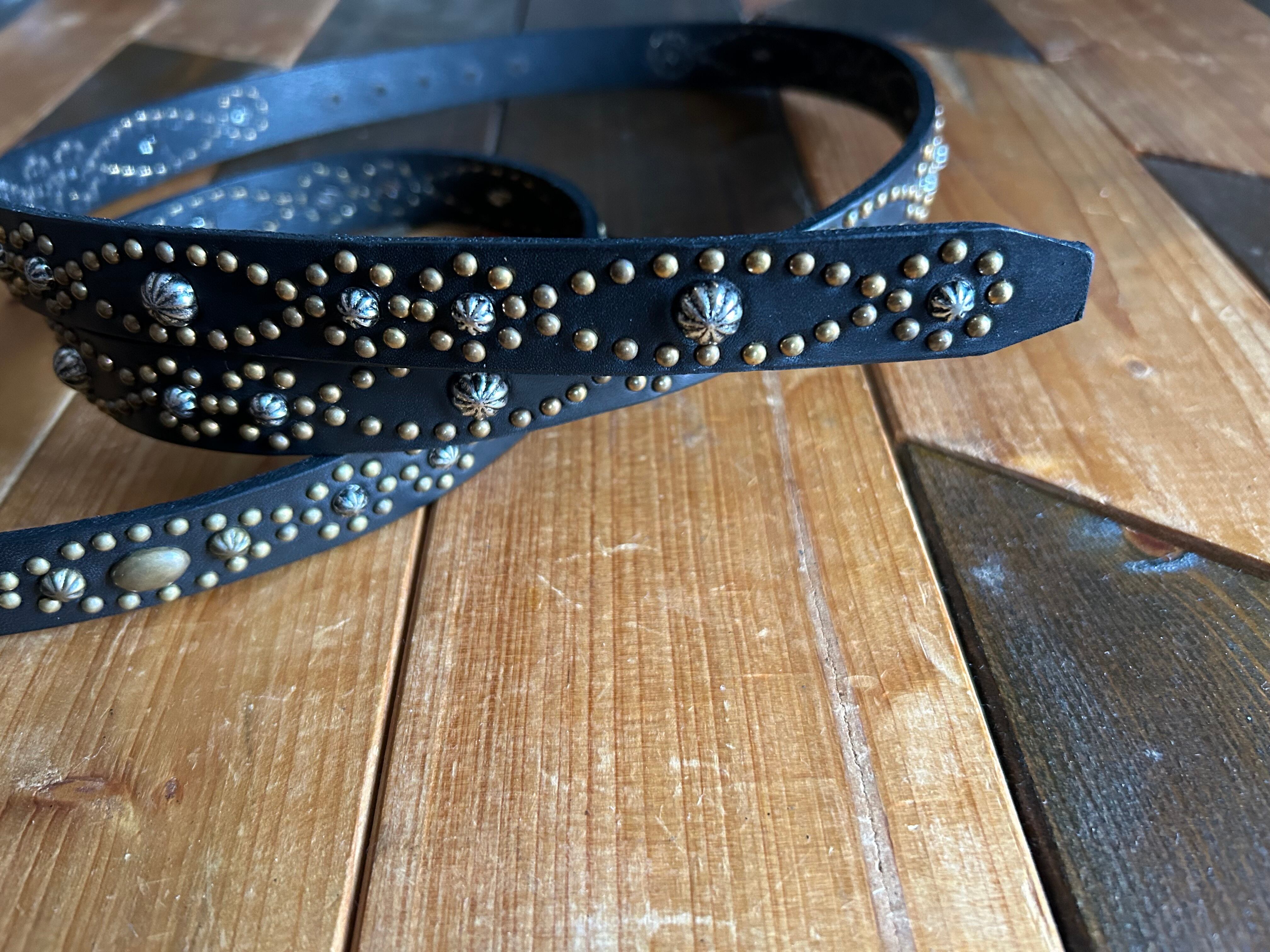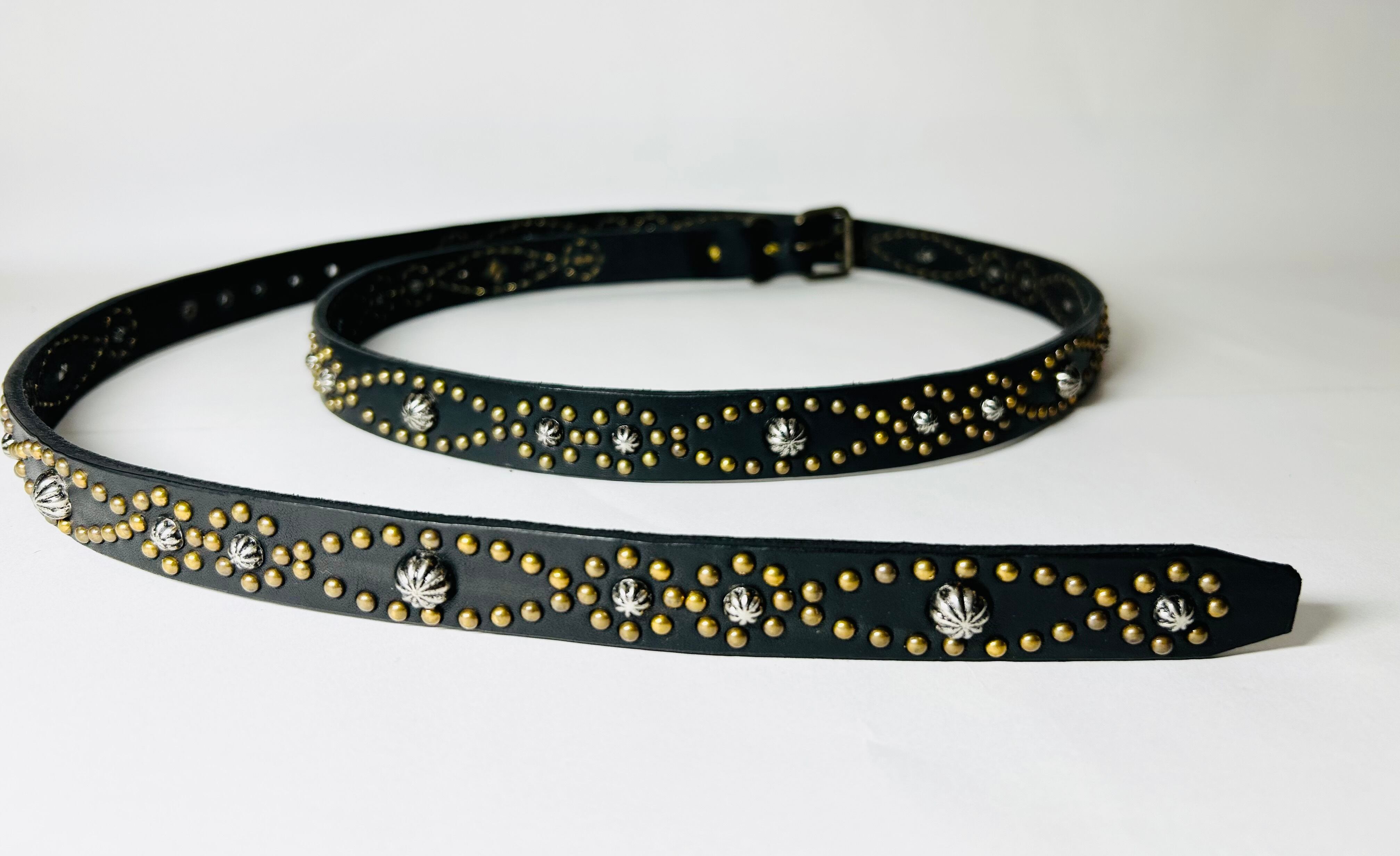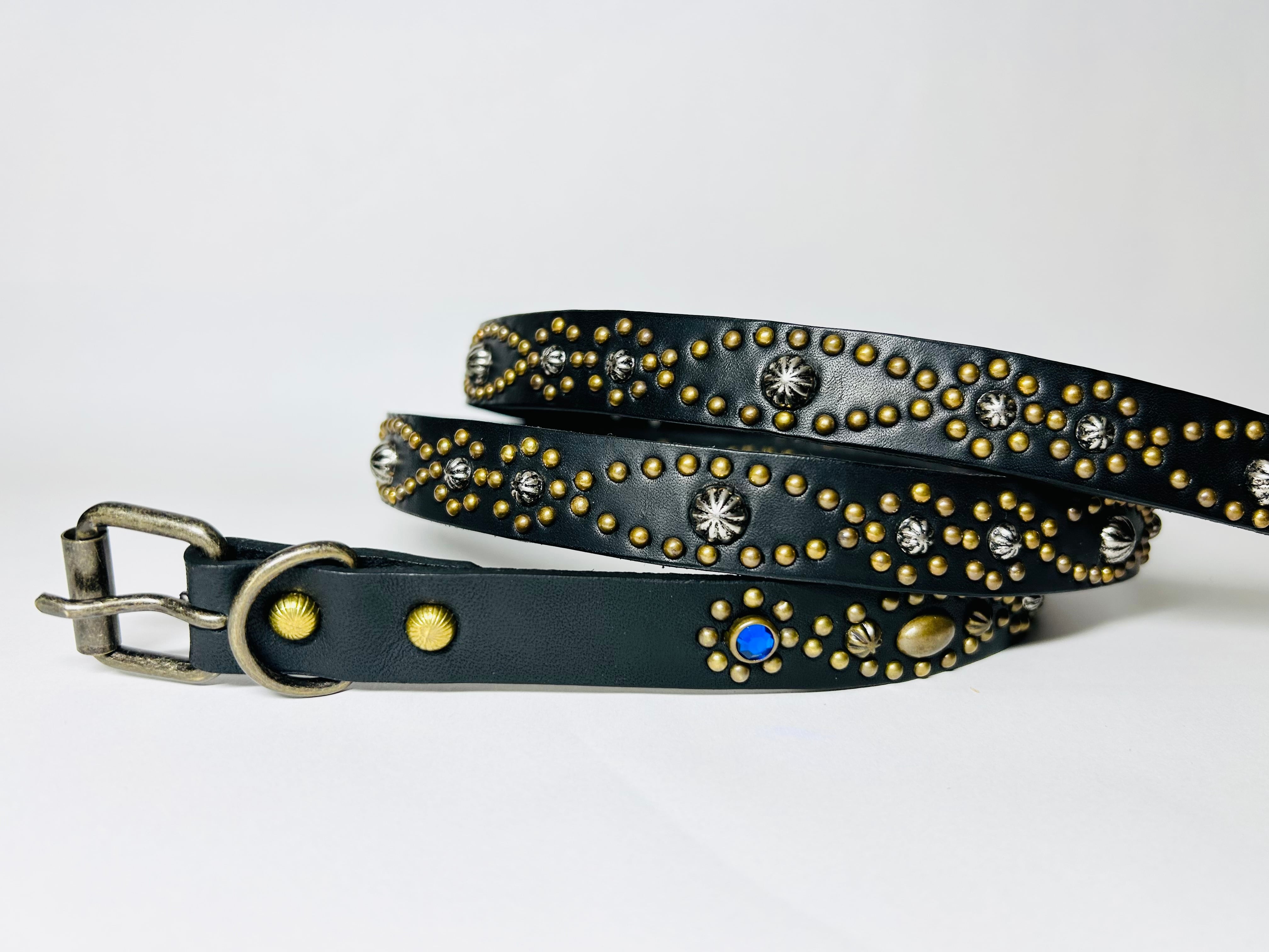 ベルト全体の360度にアンティークブラススタッズでバタフライパターンを施したナローベルト。