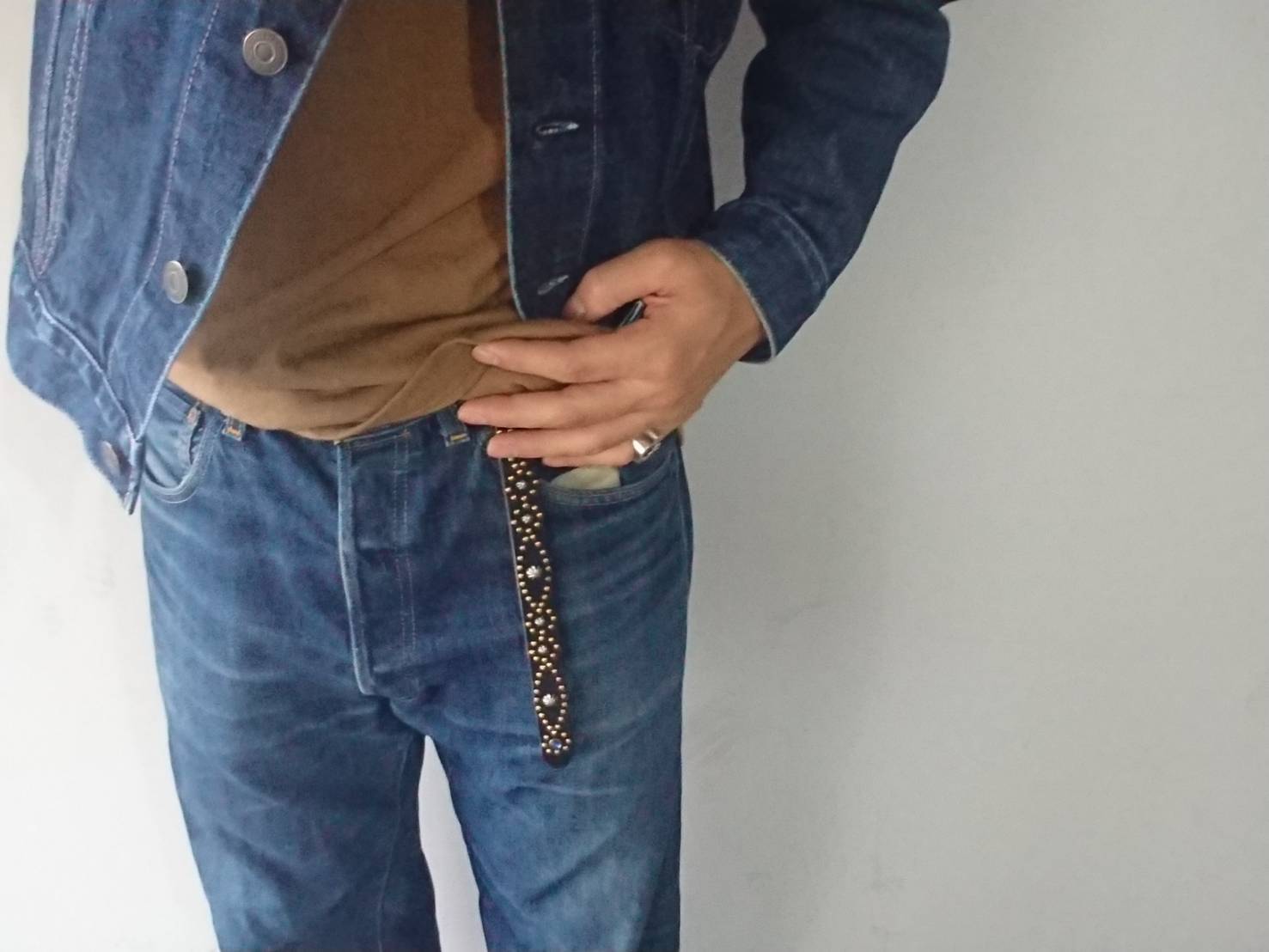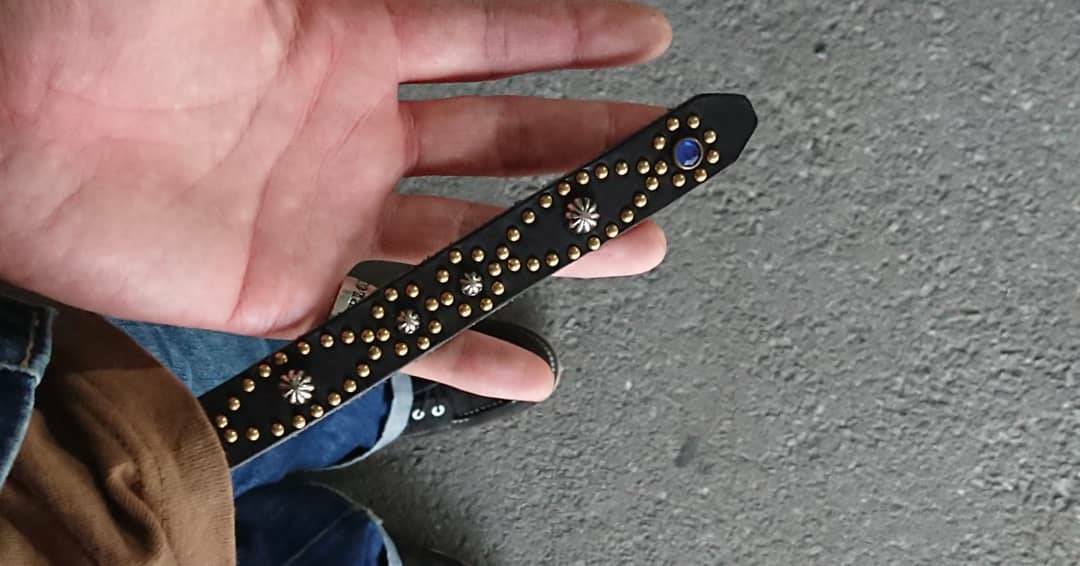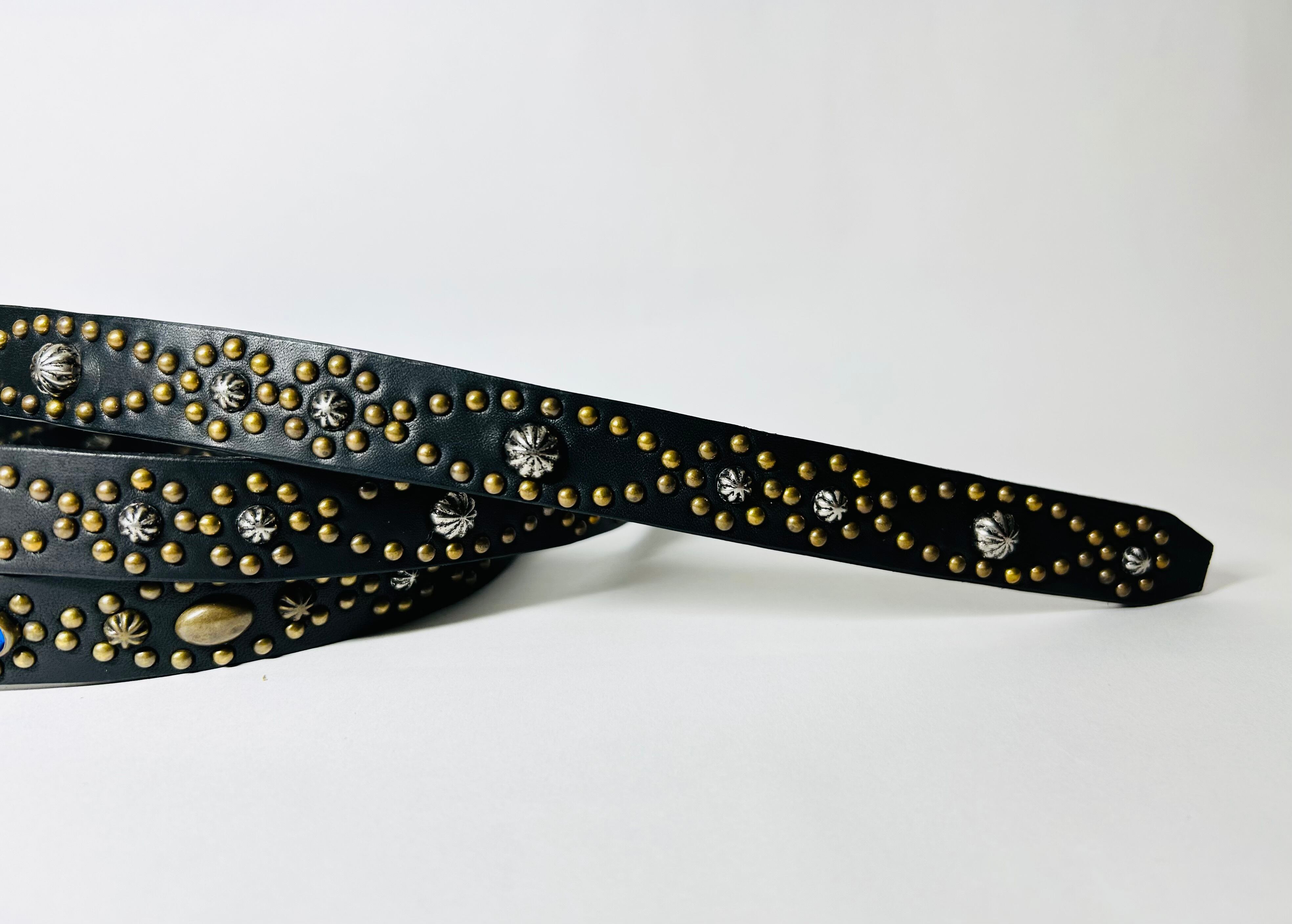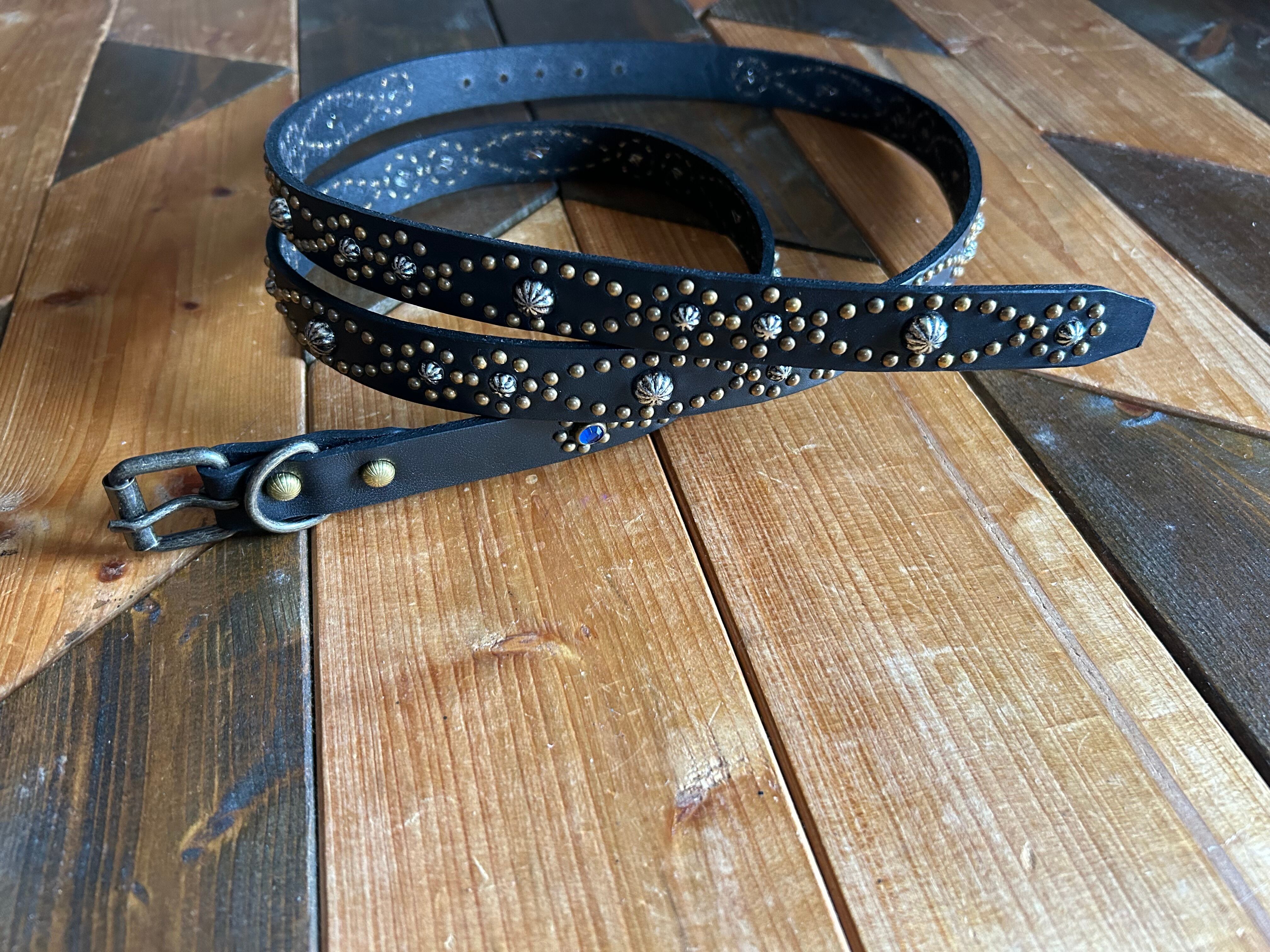 ベルト全体の360度にアンティークブラススタッズでバタフライパターンを施したナローベルト。