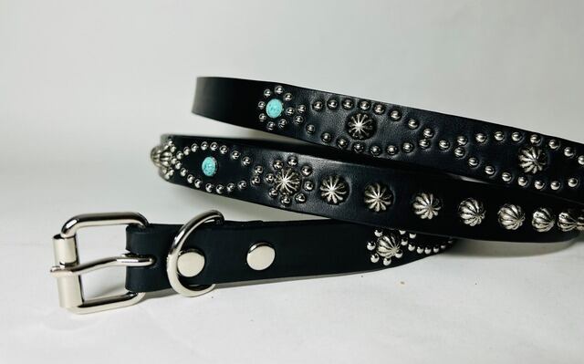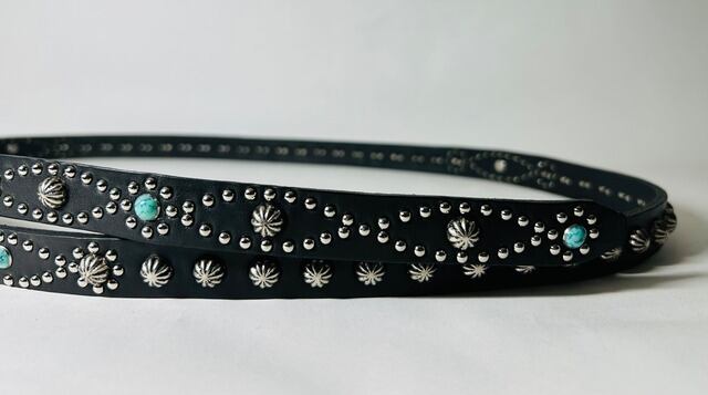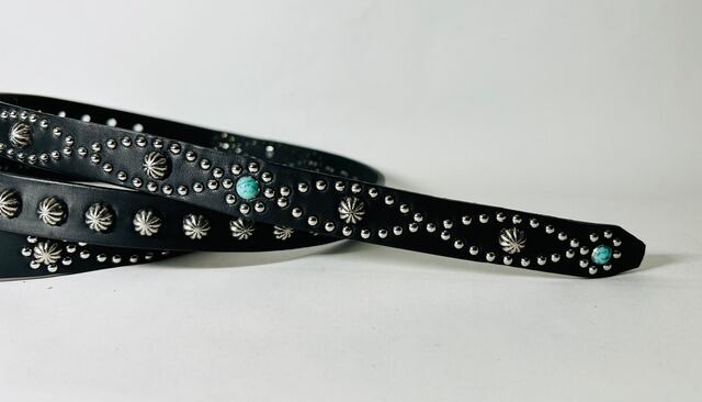 ベルト全体の360度にスタッズを施したナローベルト。ケンサキと胴回りで違うデザインパターンを使用しています。アポロスタッズは10ミリ。※バックルの留め具がスナップボタン式ですので取り外しが可能です。