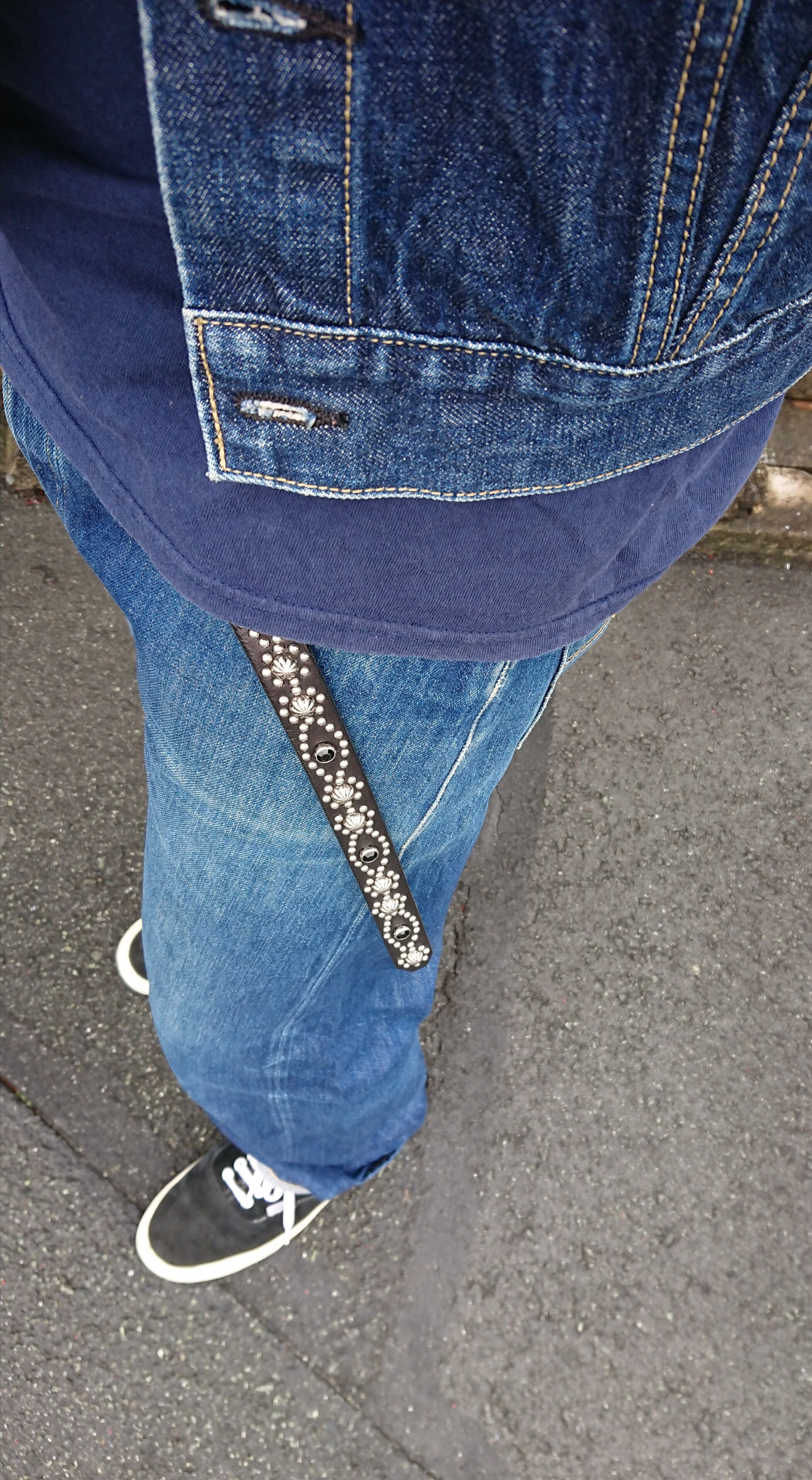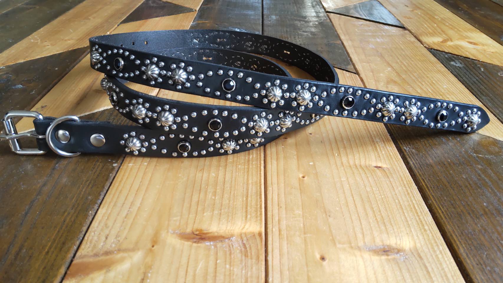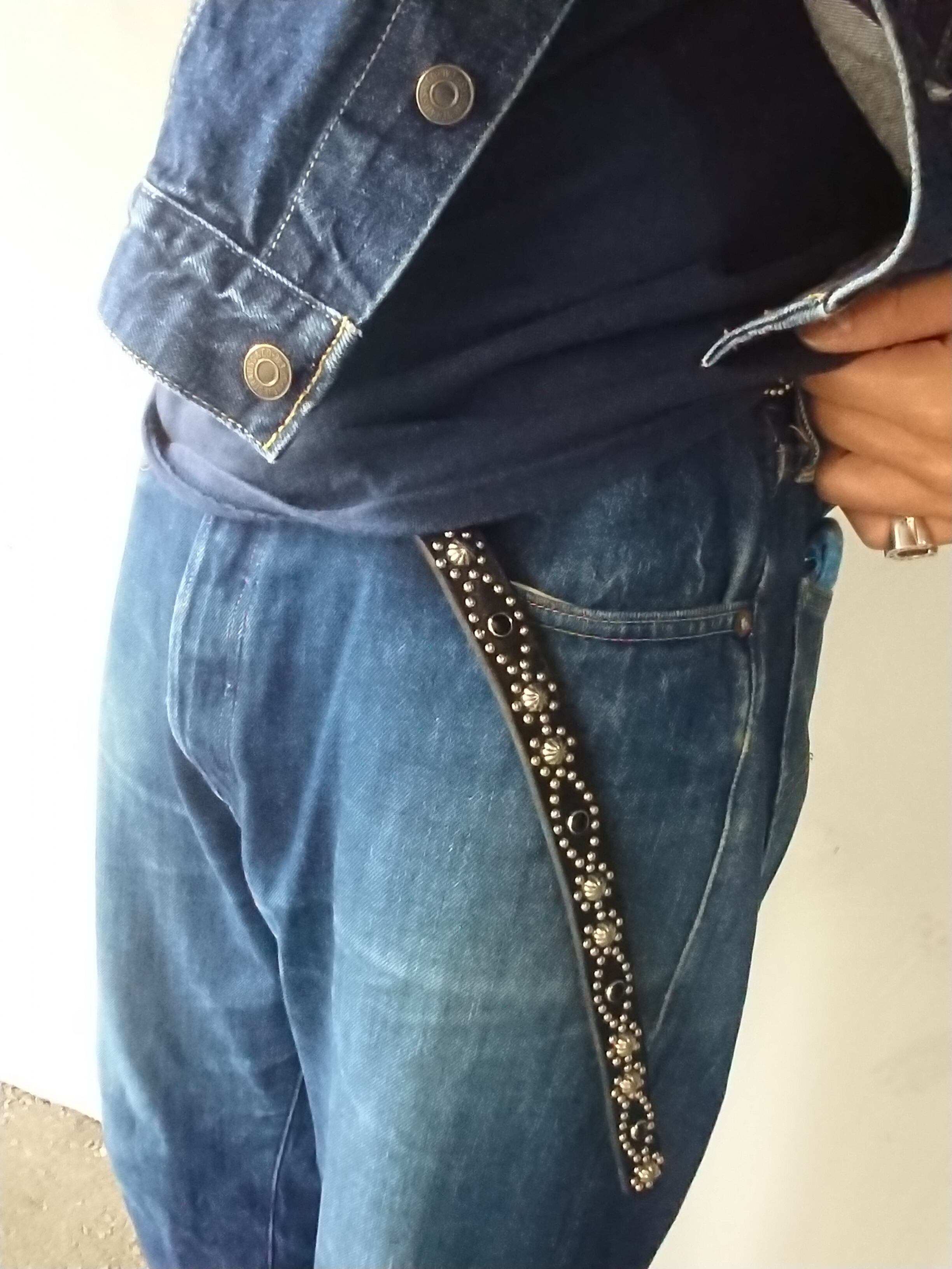 ベルトの全面360度にスタッズを施したナローベルト、着用画像はケンサキスクエアとなります。