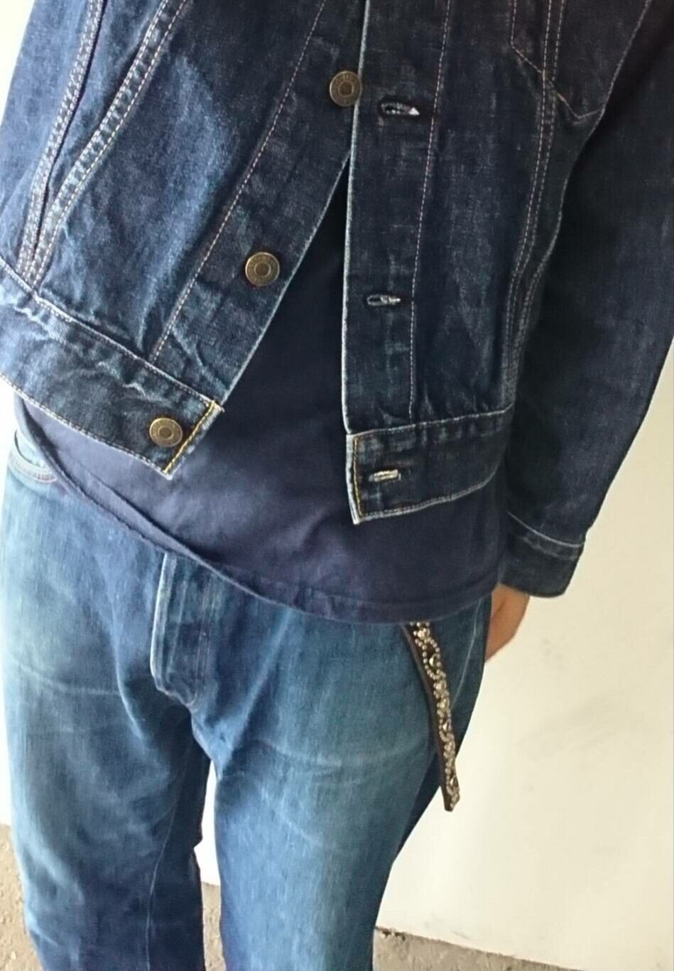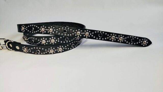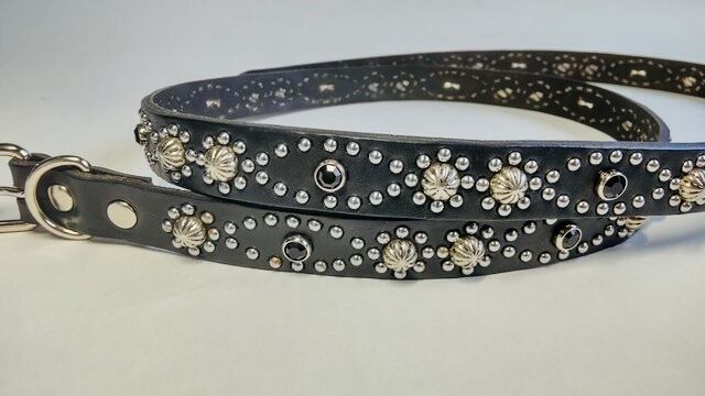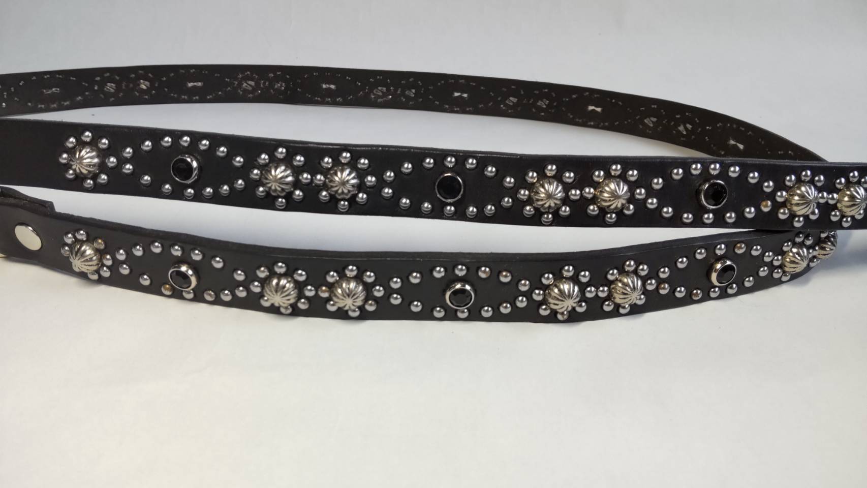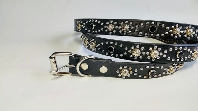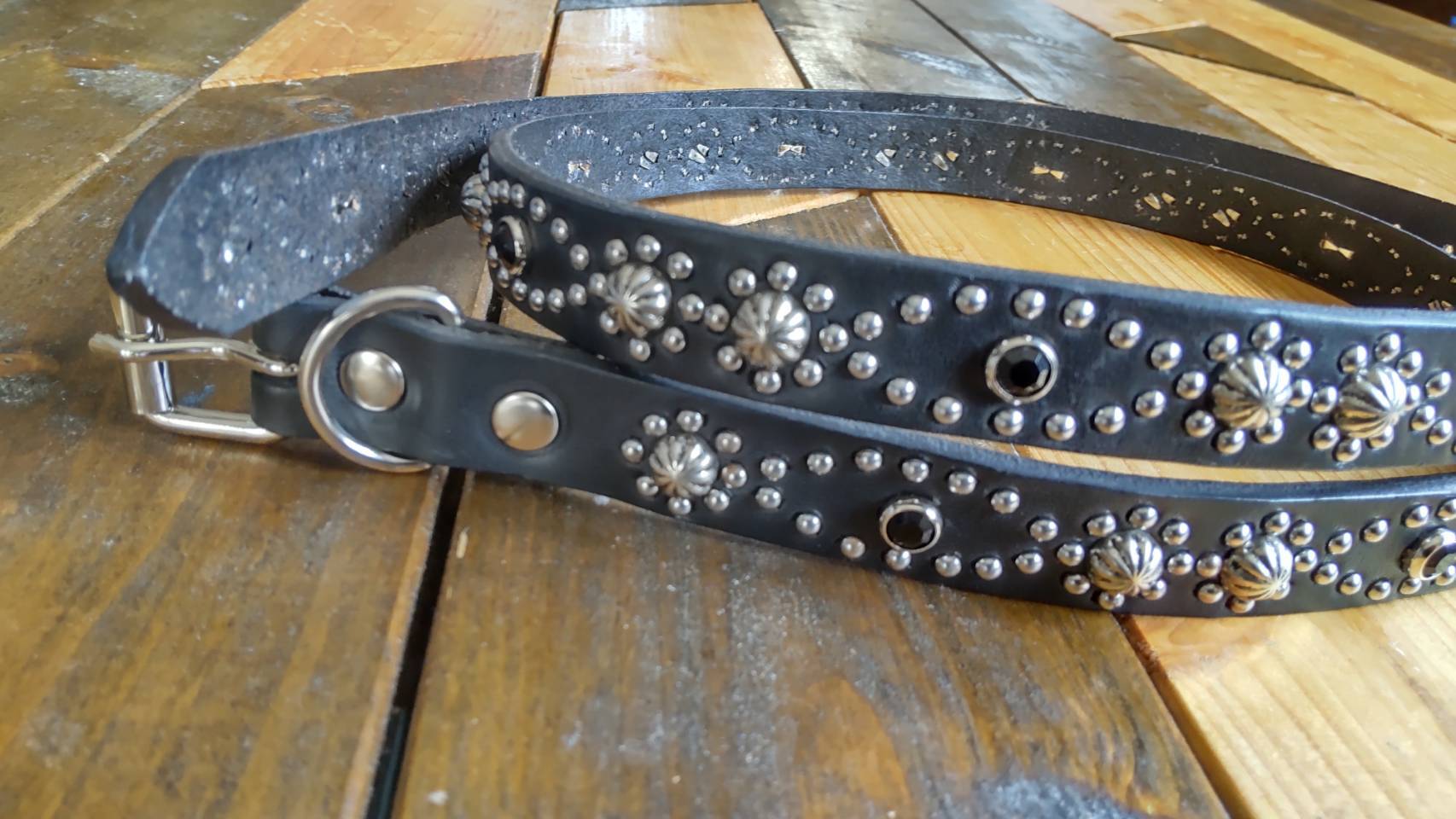 ベルトの全面360度にスタッズを施したナローベルト、着用画像はケンサキスクエアとなります。