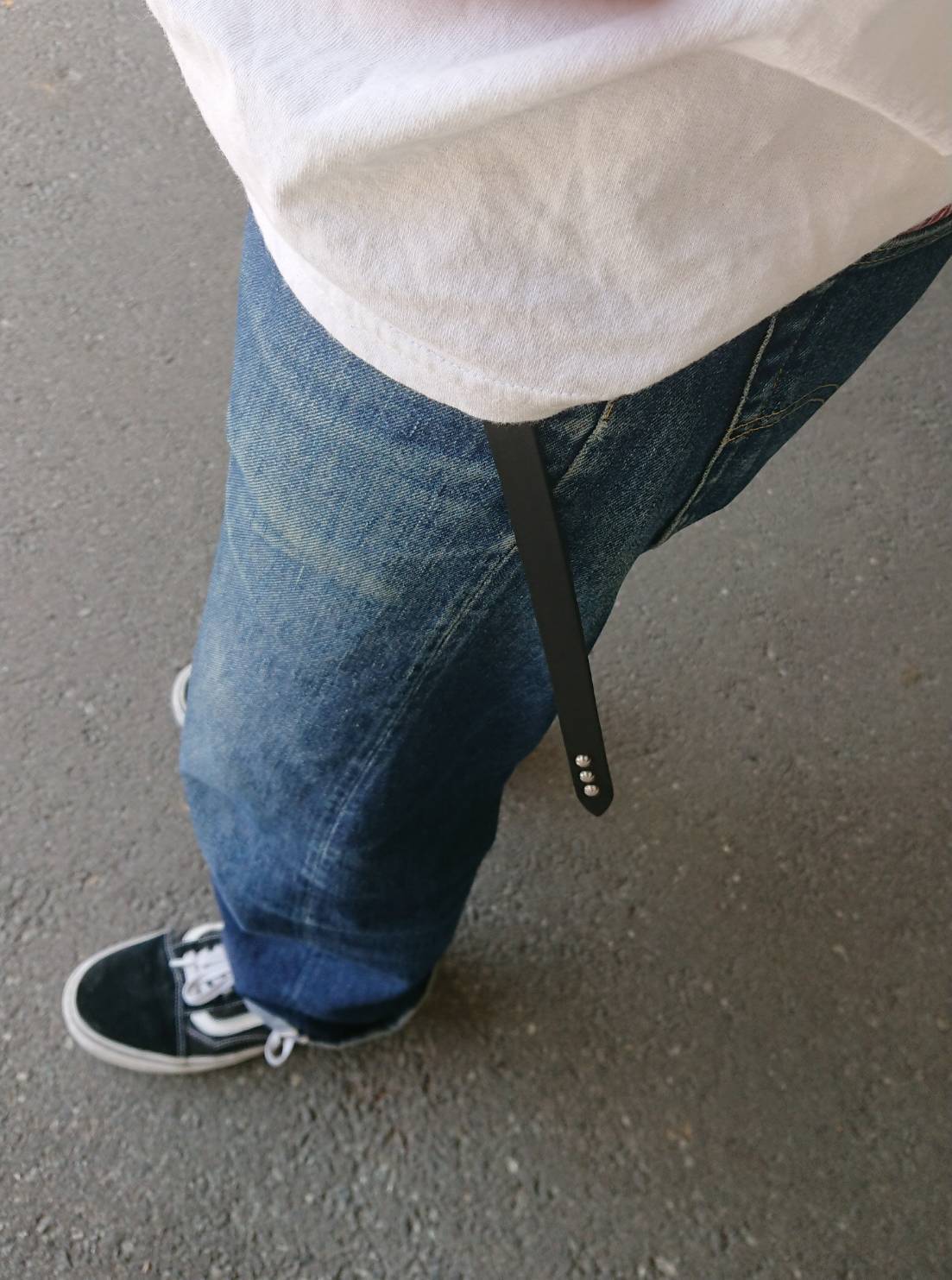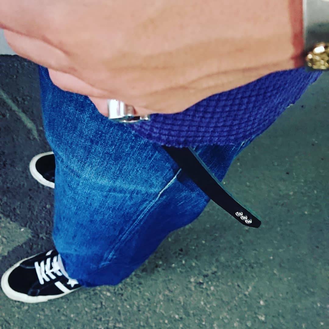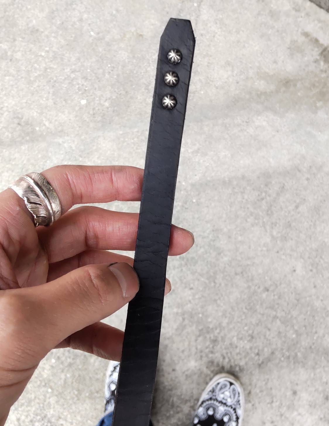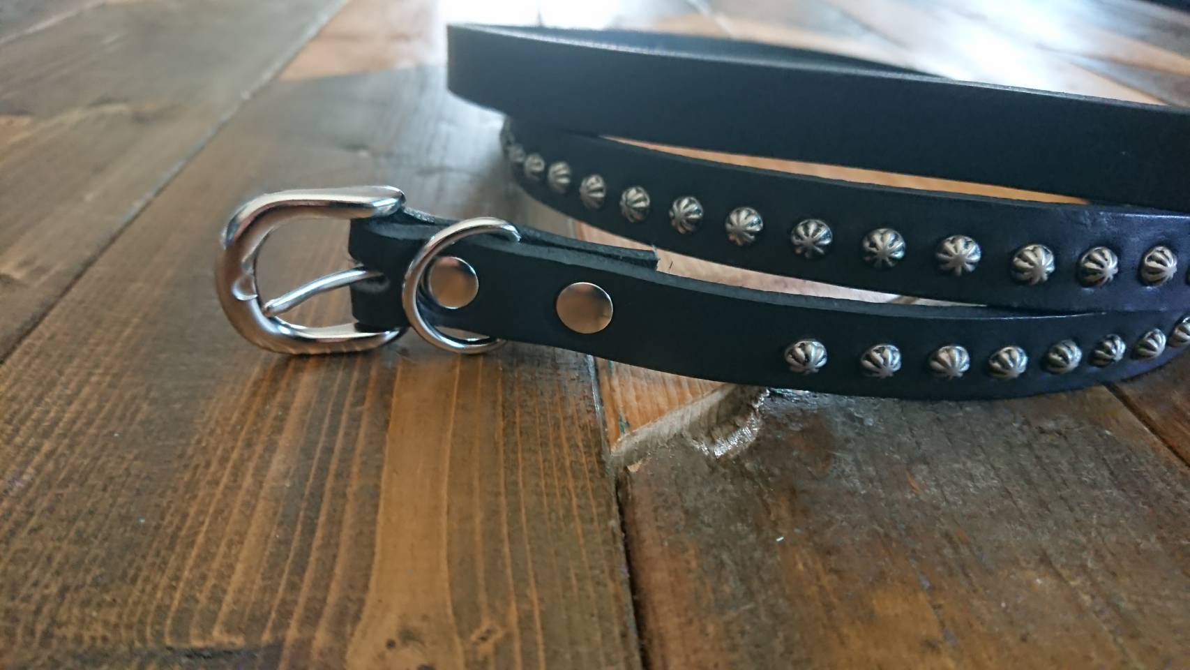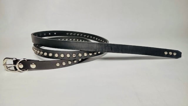 ベルト胴回りとケンサキにシルバーアポロスタッズを使用したナローベルト、アポロは直径約6ミリのスモールアポロを使用しています。ベルト先端の形はスタイルはシャープとスクエア両方の画像を載せています。バックルの留め具がスナップボタン式ですのでバックルの取り外しが可能です。