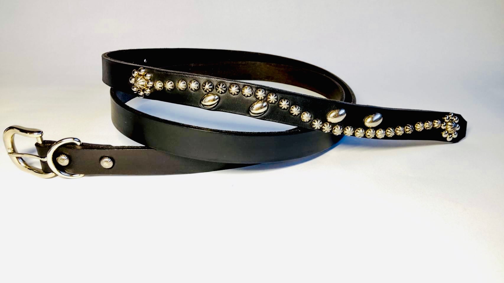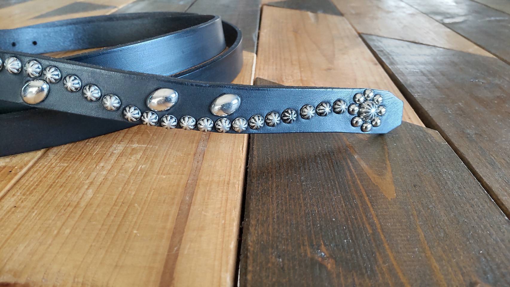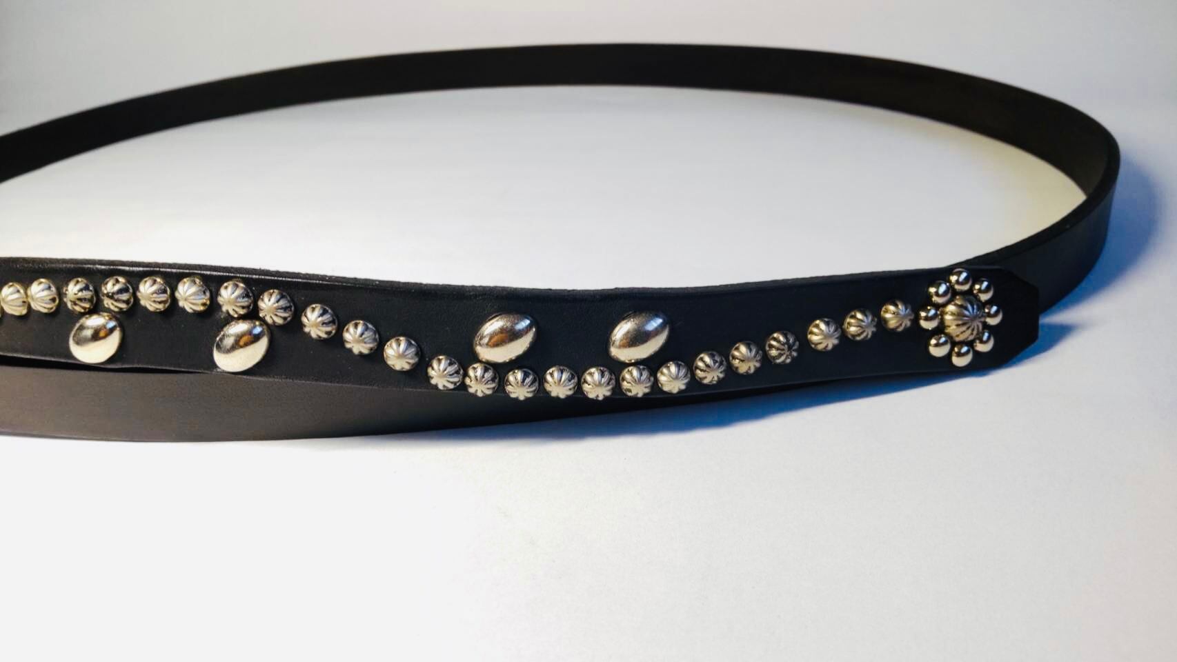 剣先にスモールアポロ6mmミリとリーフスタッズでフラワーを表現したナローベルト、剣先の長さは約30センチです。