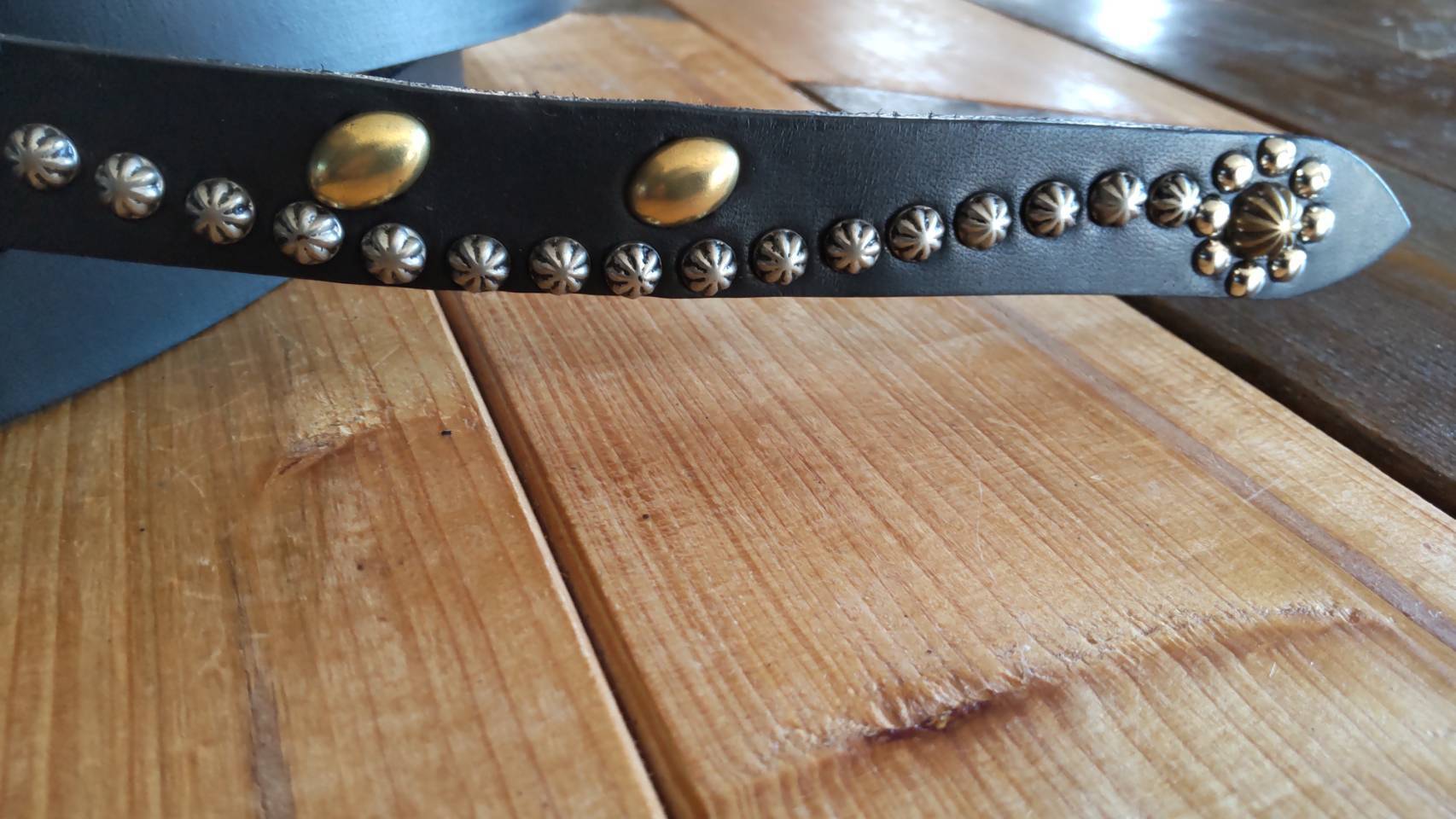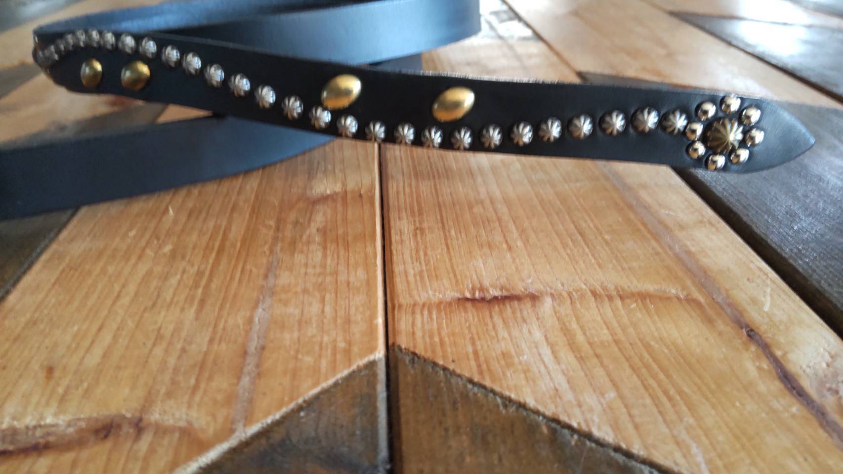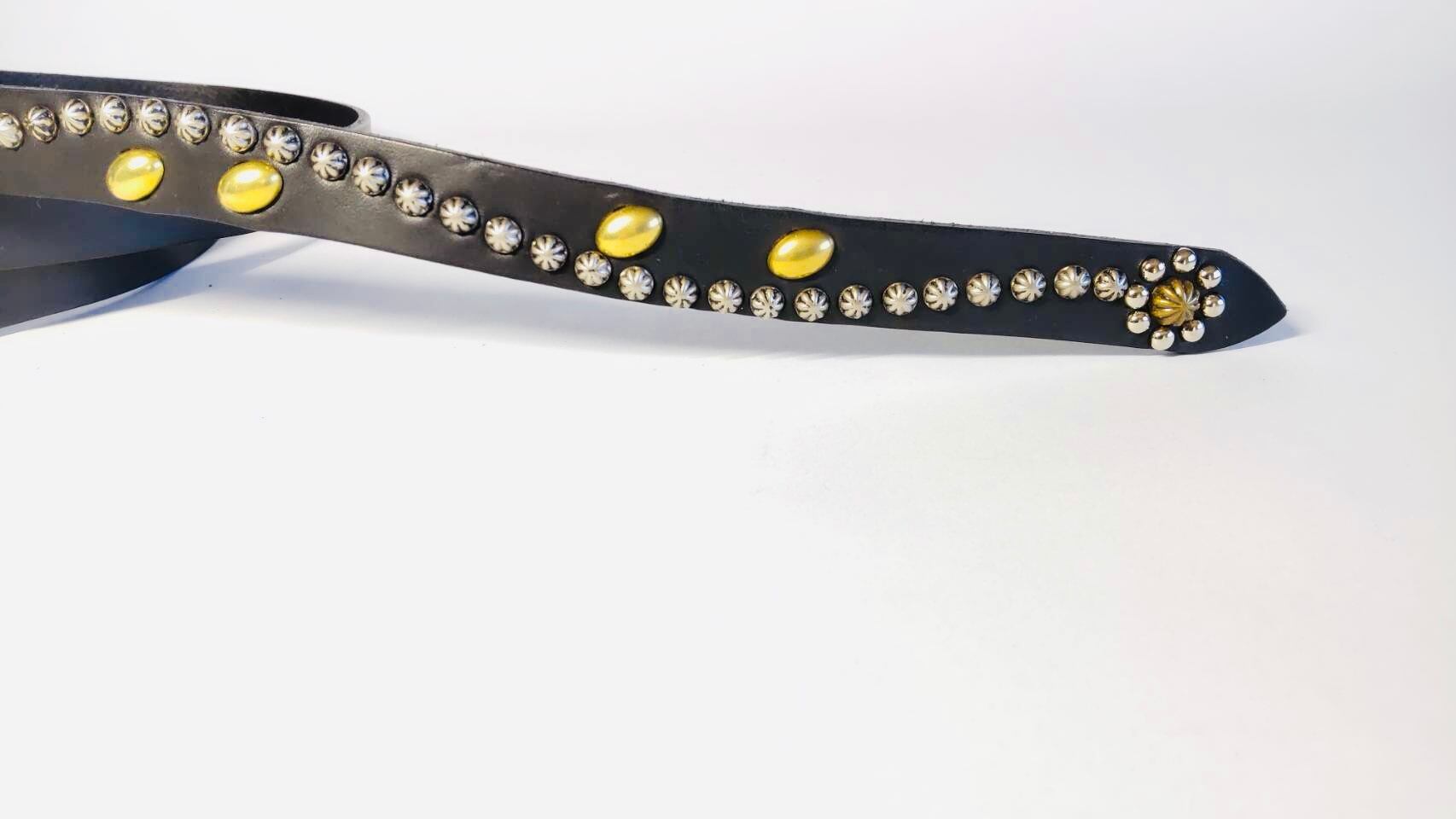 剣先にスモールアポロ6mmミリとゴールドリーフスタッズでフラワーを表現したナローベルト、剣先の長さは約30センチです。リーフ部分に使用している【ゴールドブラススタッズ】はクスミのない明るいゴールド色のスタッズです。
