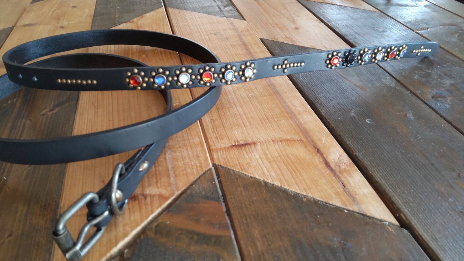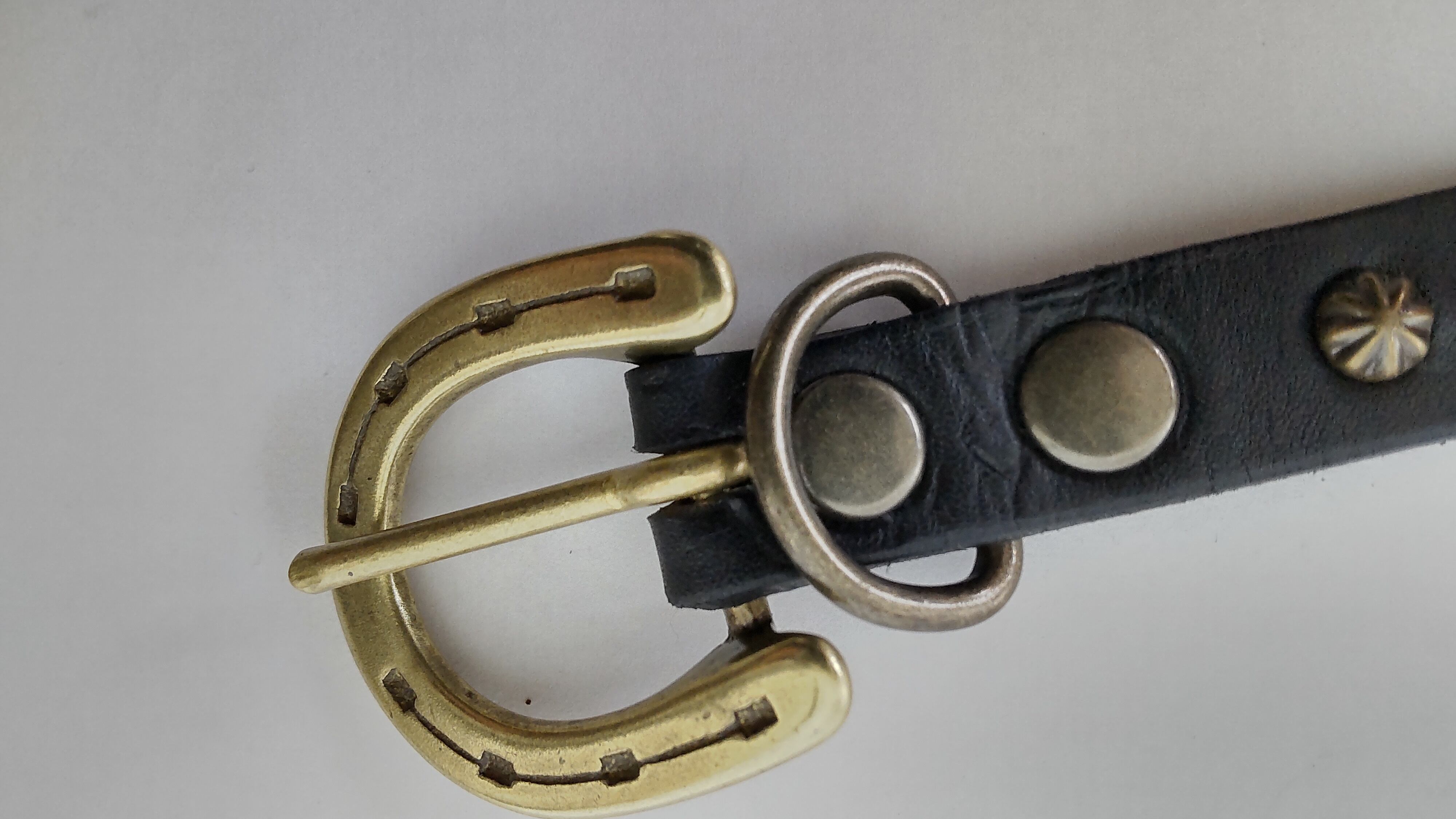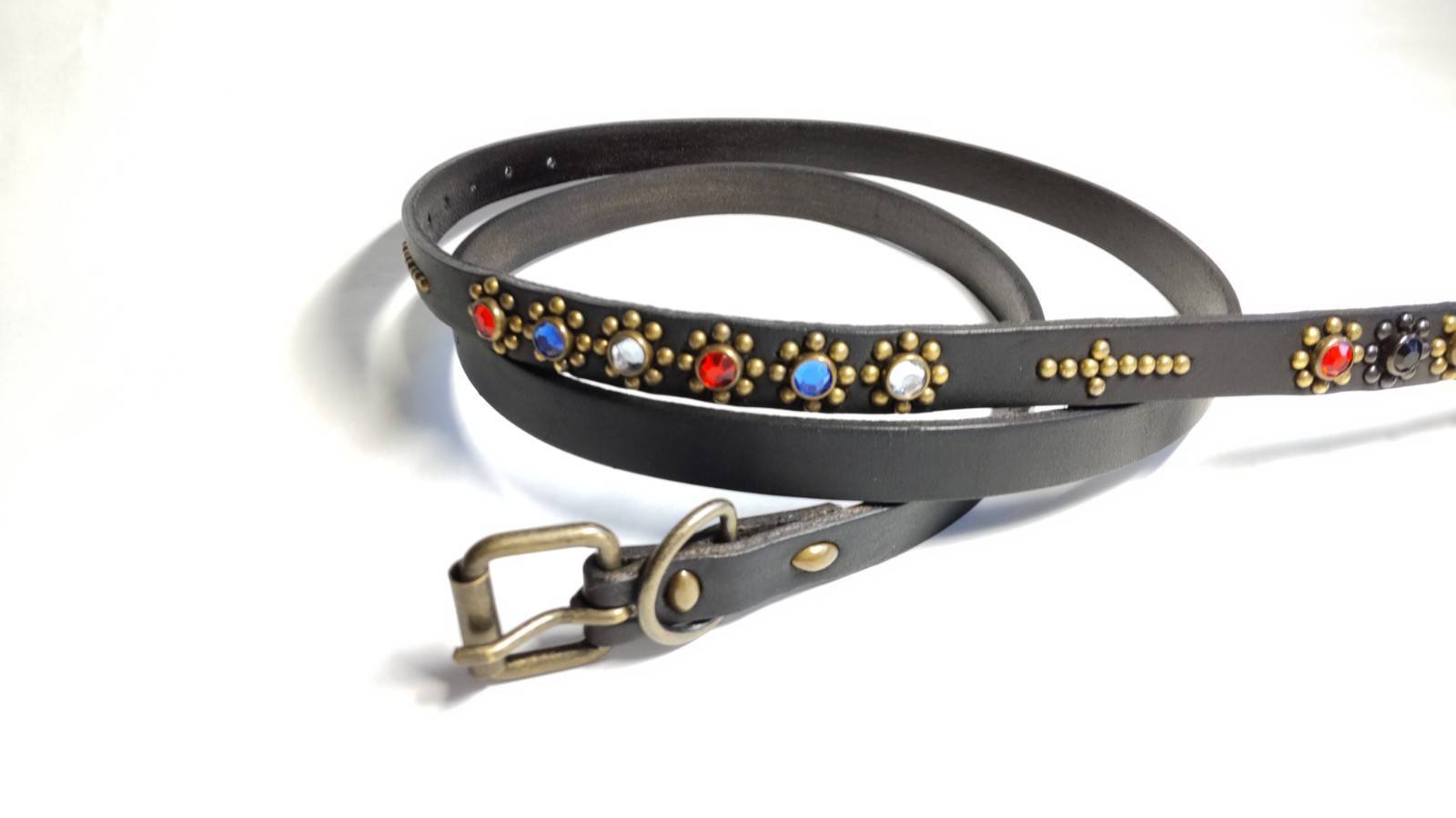 ケンサキのみにスタッズを施したナローベルト。アンティークブラススタッズを使用。