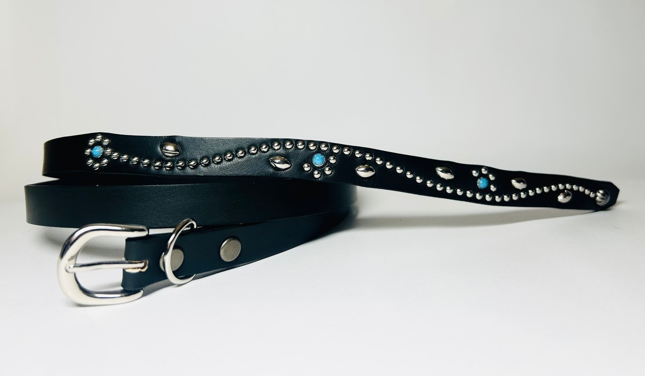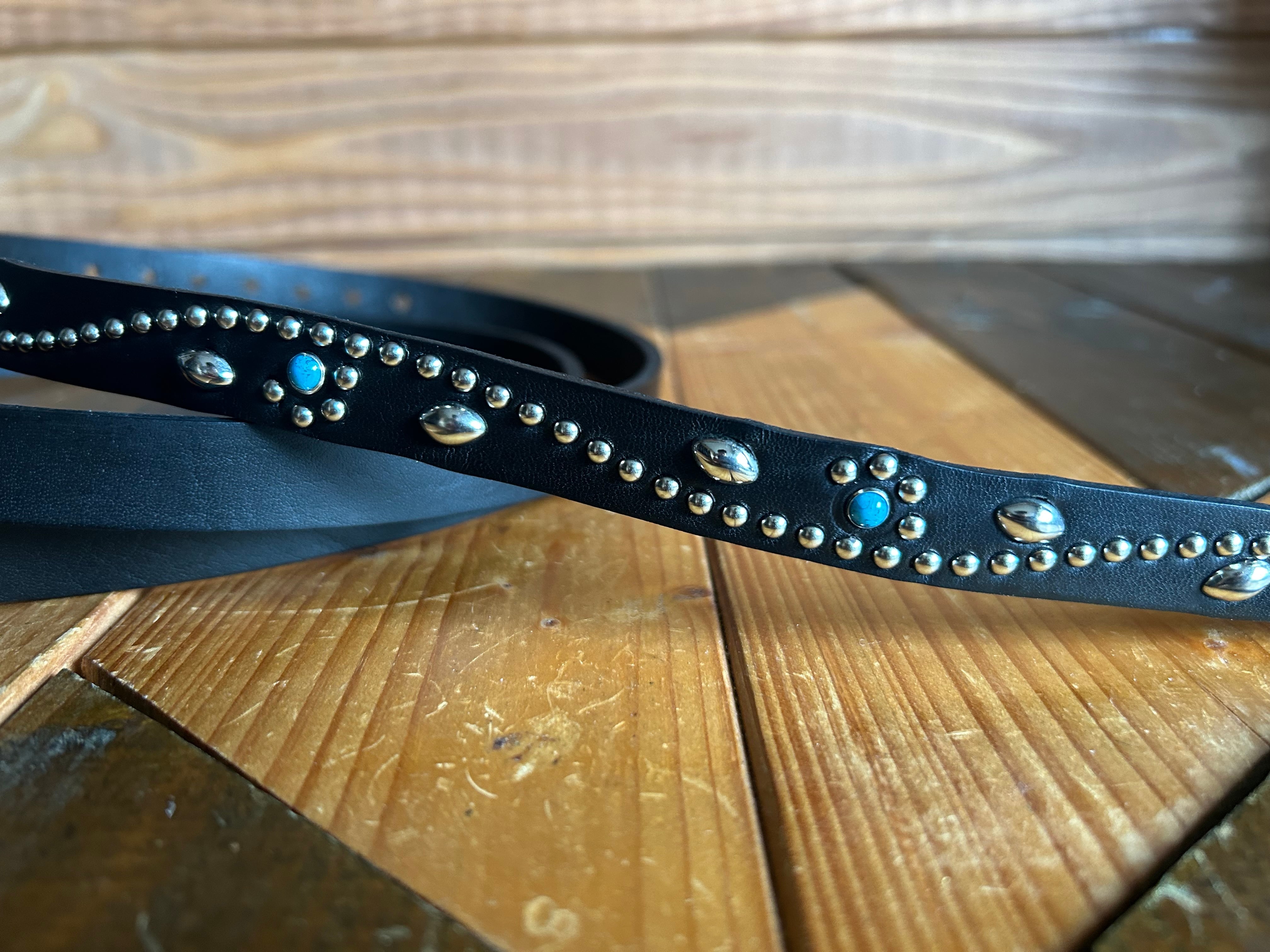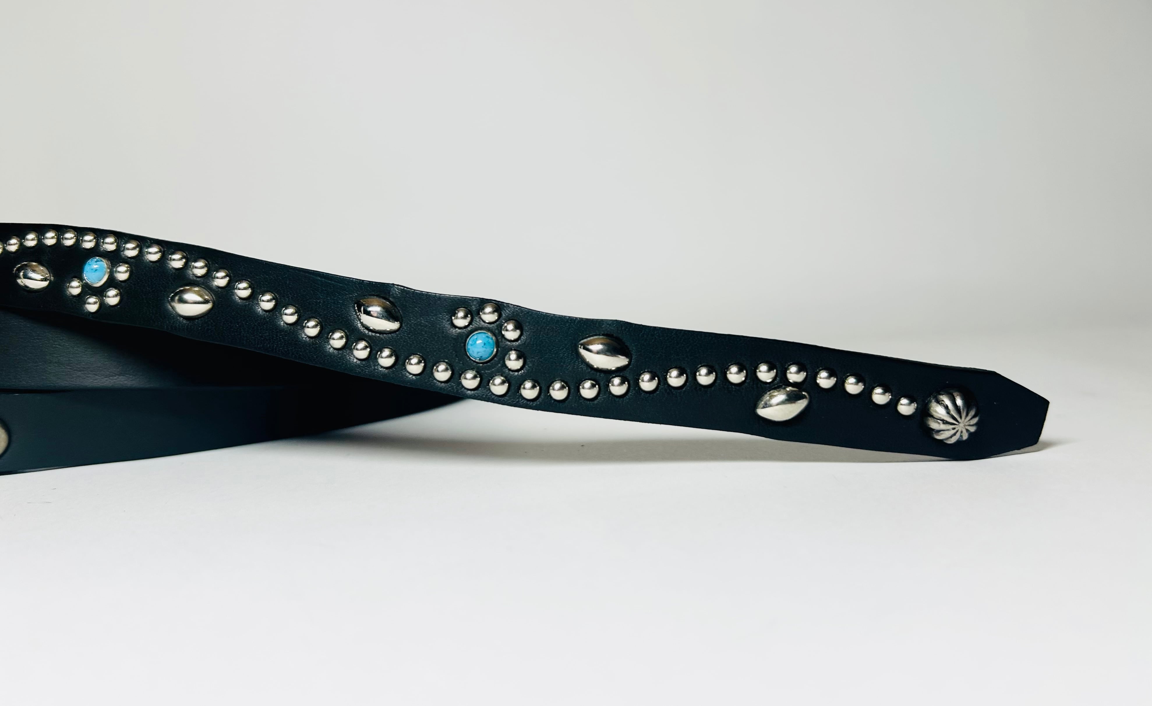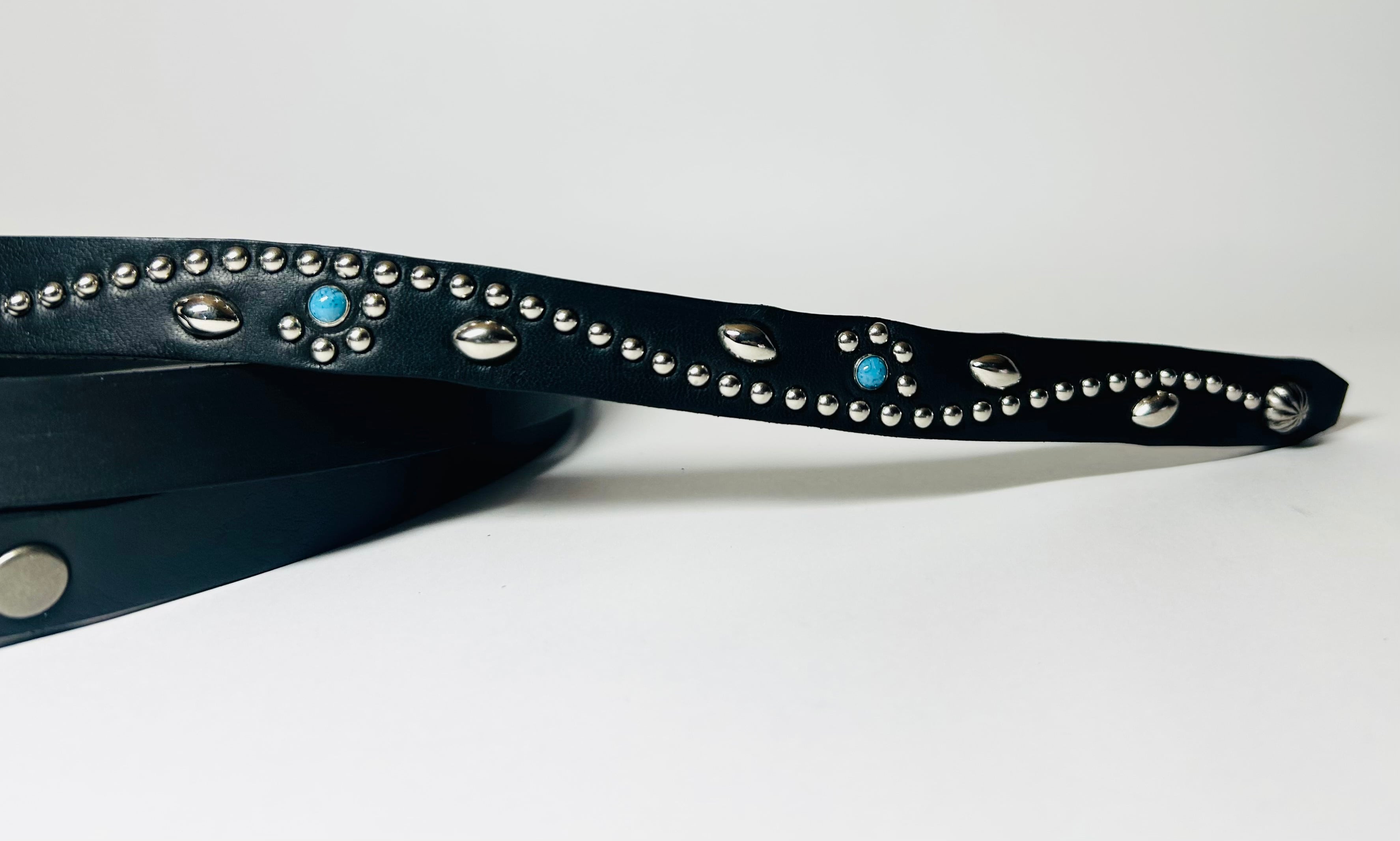 ケンサキにターコイズカラースタッズ先端にはアポロ大スタッズを使用したナローベルト。バックルの留め具がスナップボタン式ですのでバックルの取り外しが可能です。