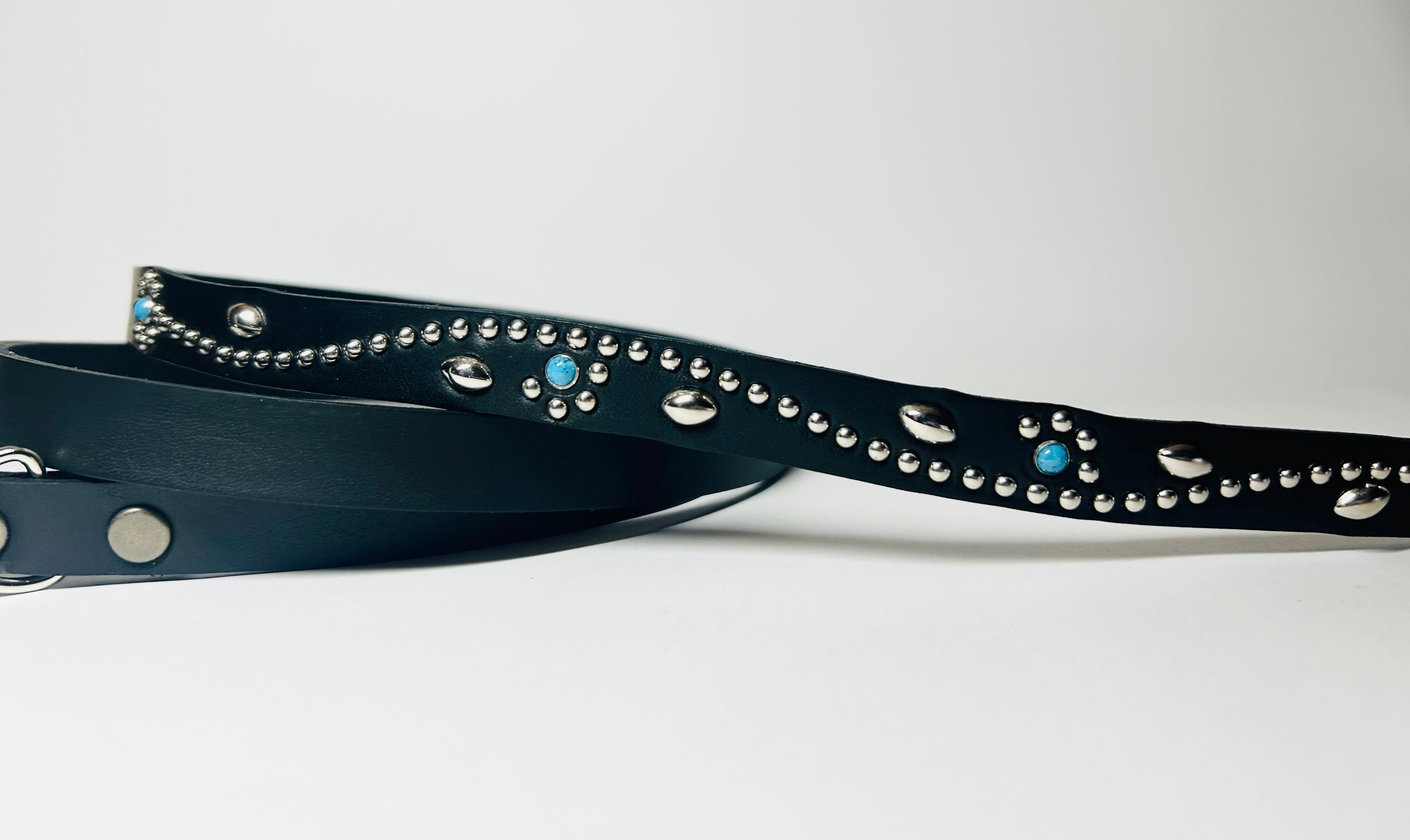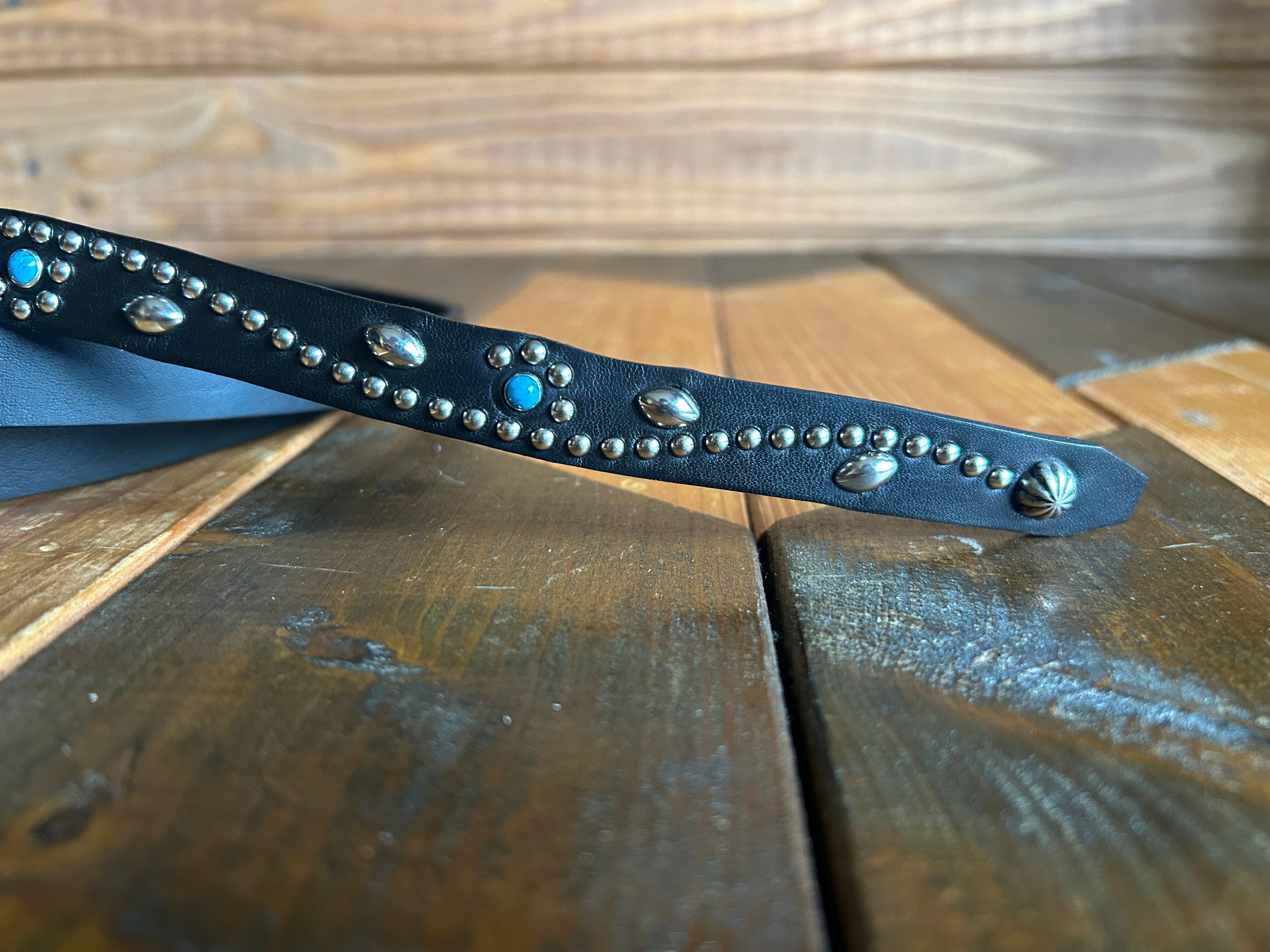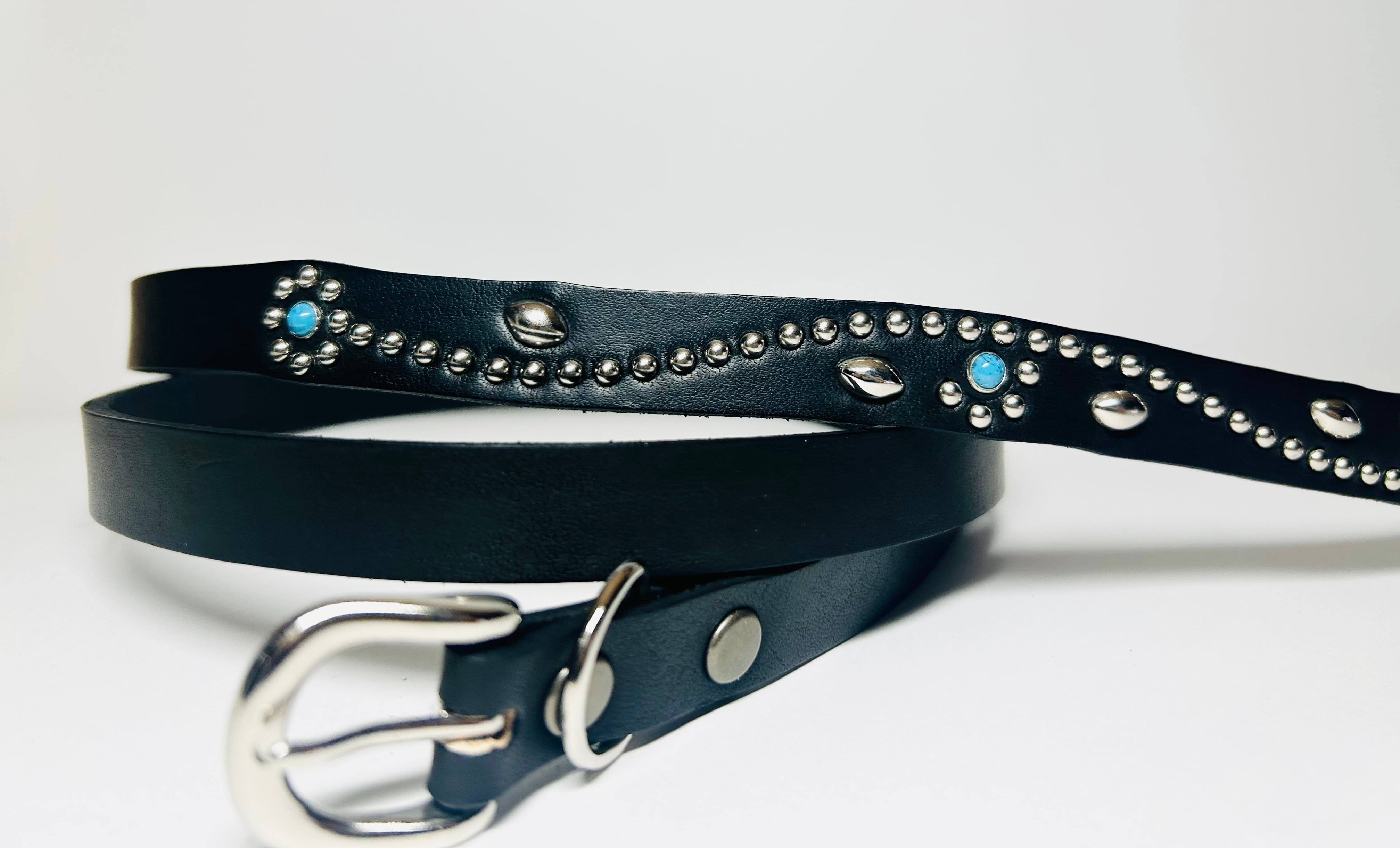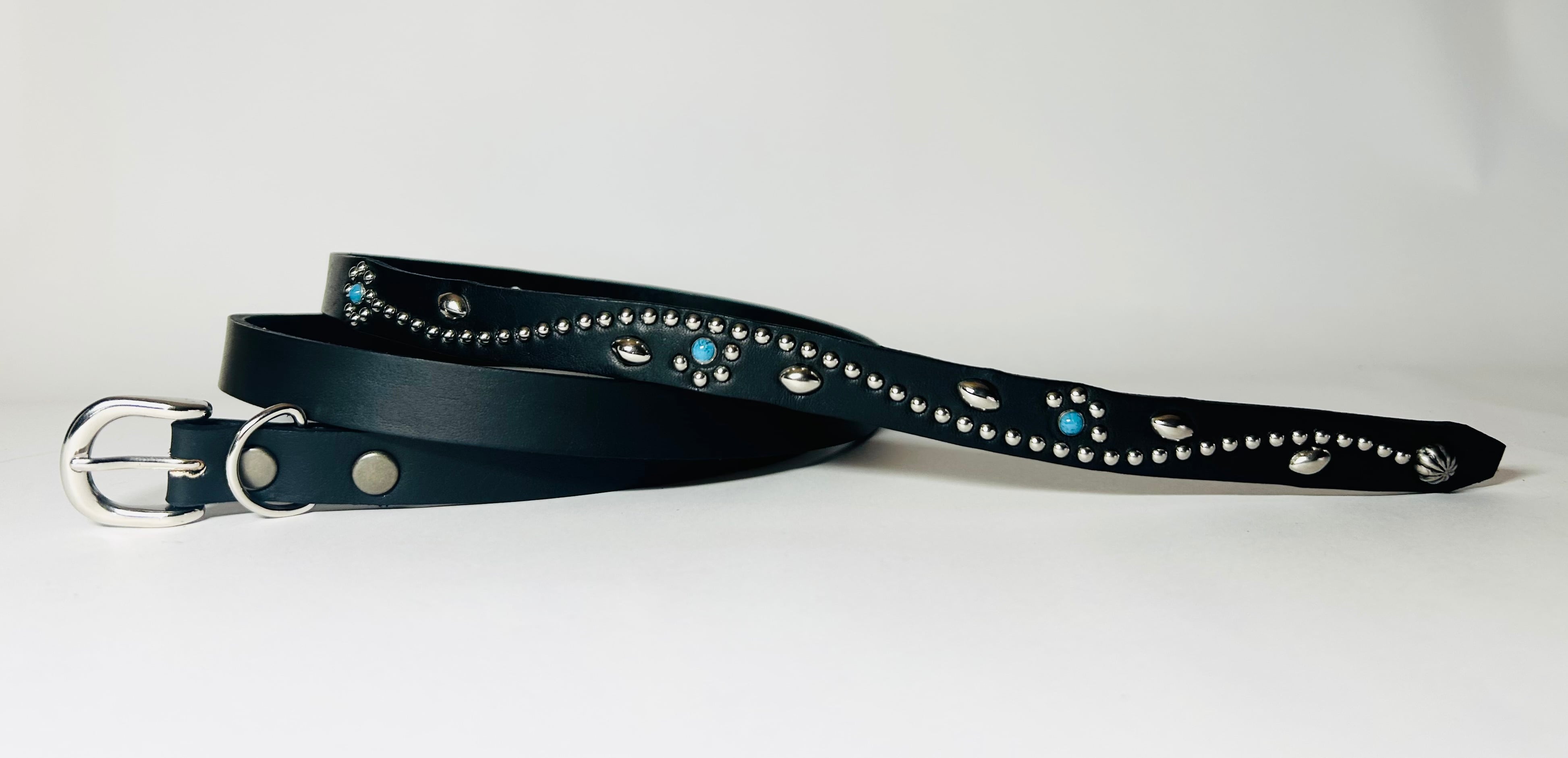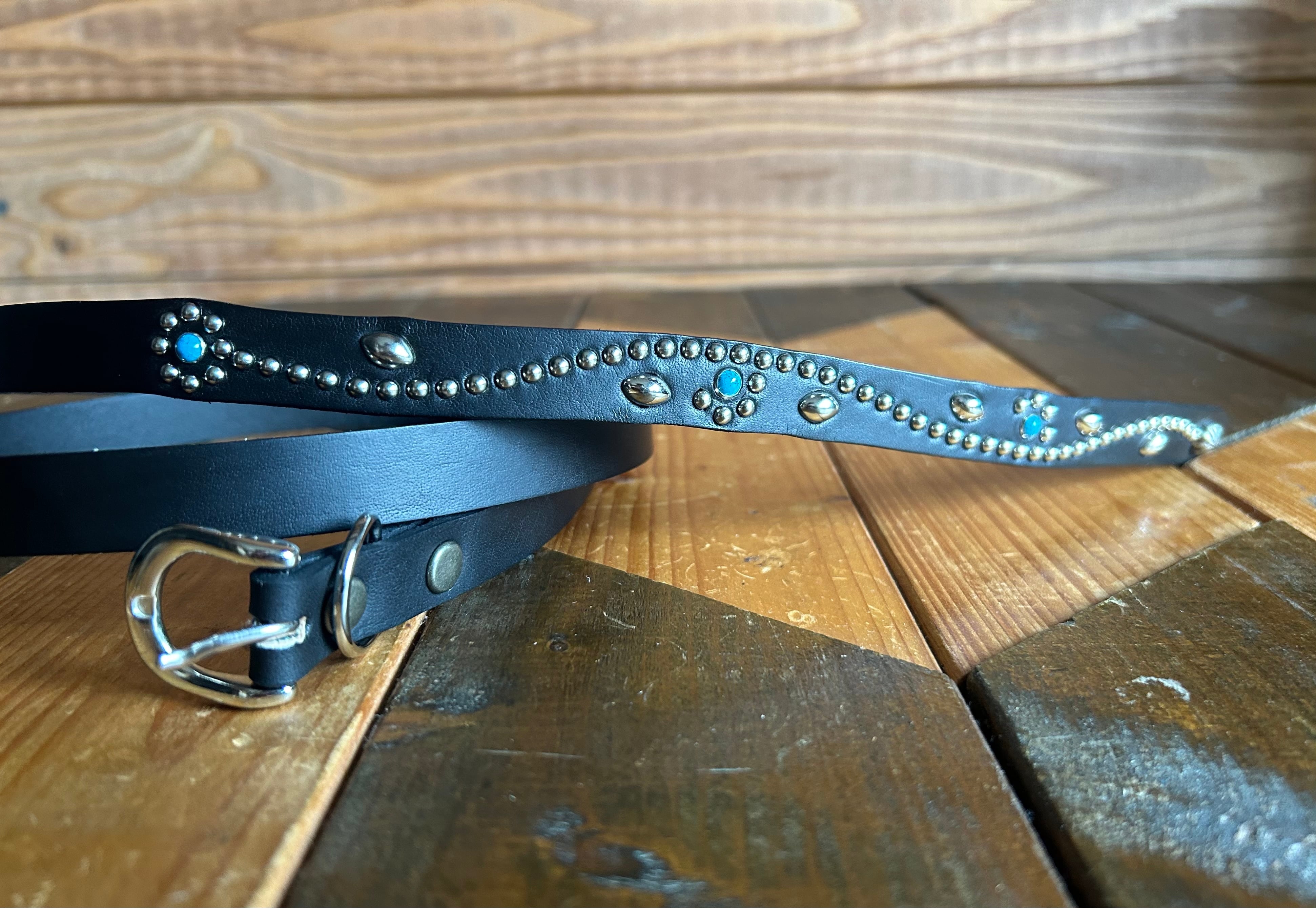 ケンサキにターコイズカラースタッズ先端にはアポロ大スタッズを使用したナローベルト。バックルの留め具がスナップボタン式ですのでバックルの取り外しが可能です。