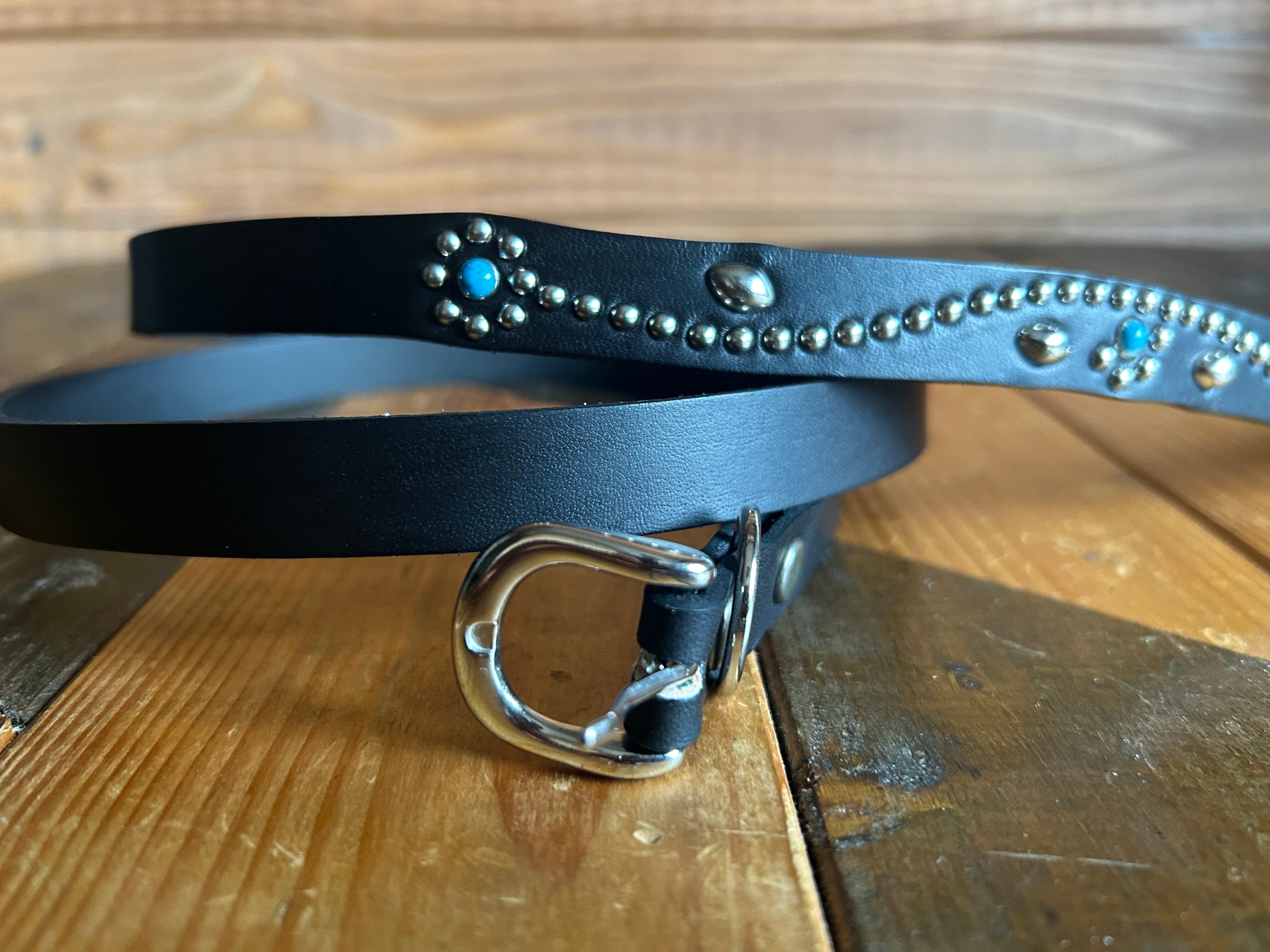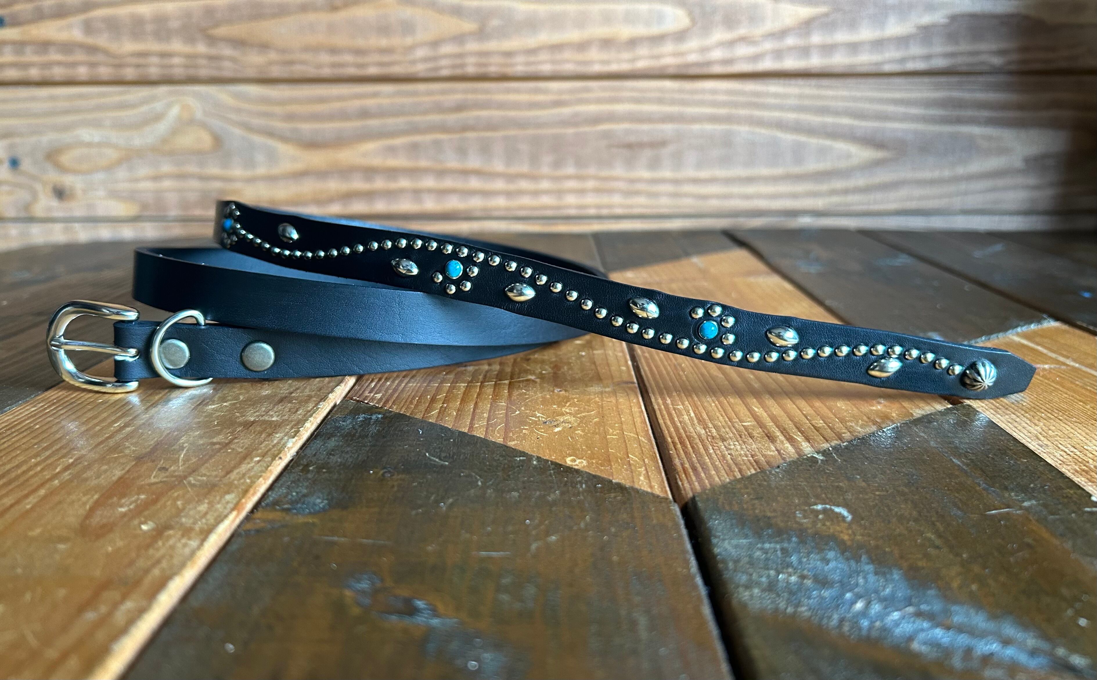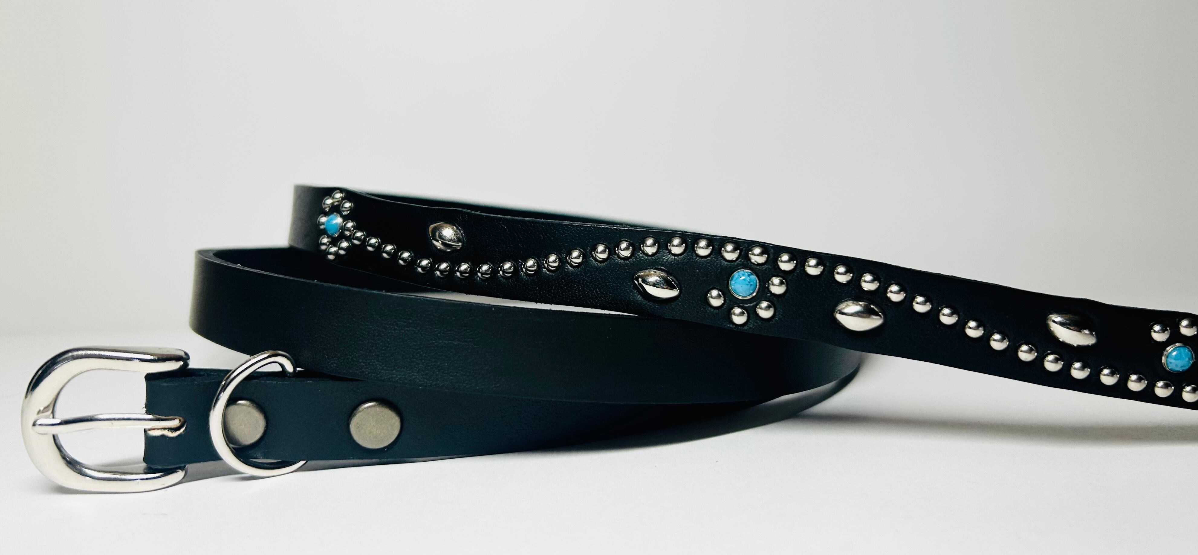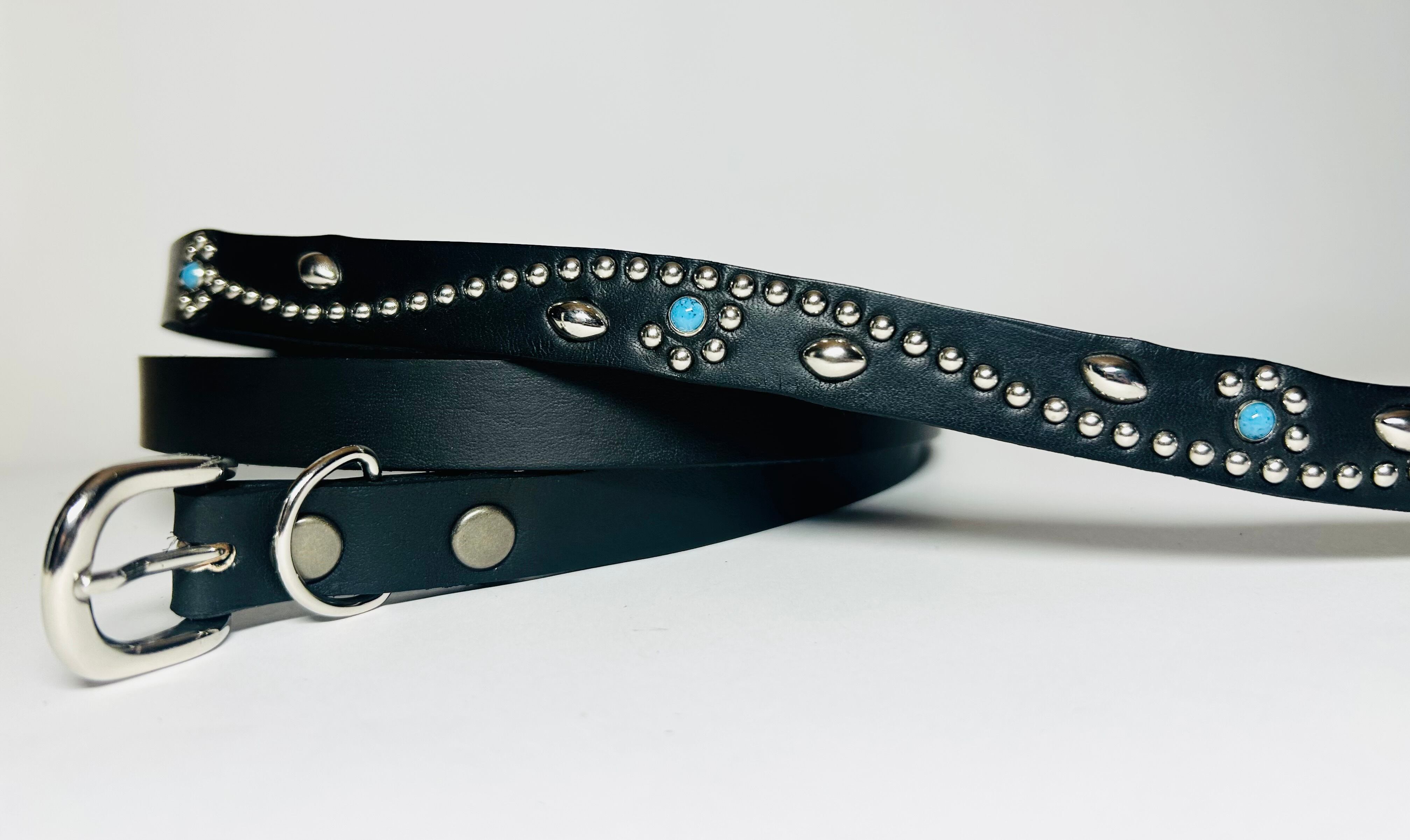 ケンサキにターコイズカラースタッズ先端にはアポロ大スタッズを使用したナローベルト。バックルの留め具がスナップボタン式ですのでバックルの取り外しが可能です。