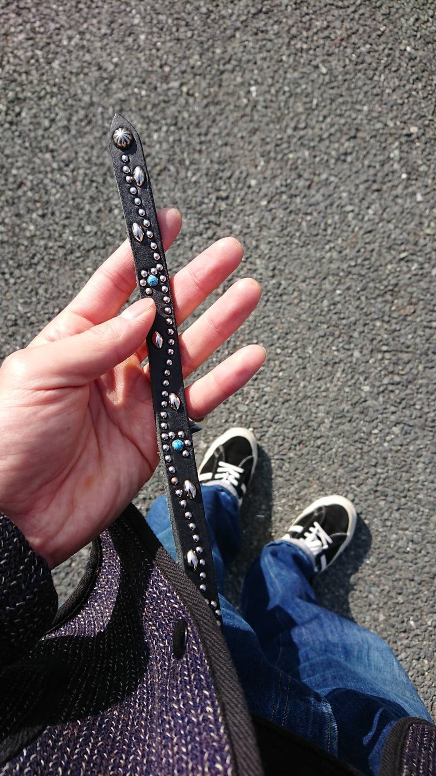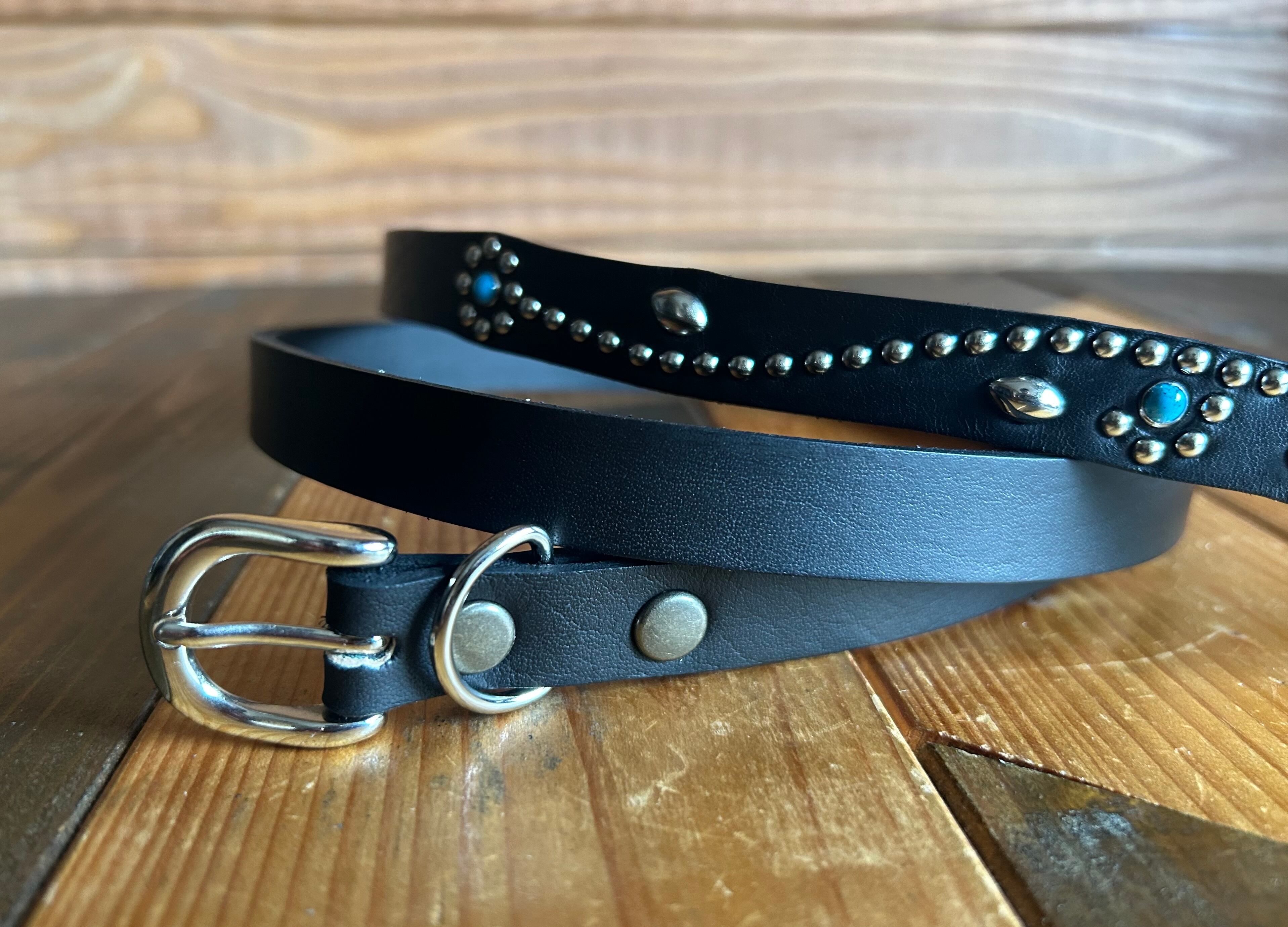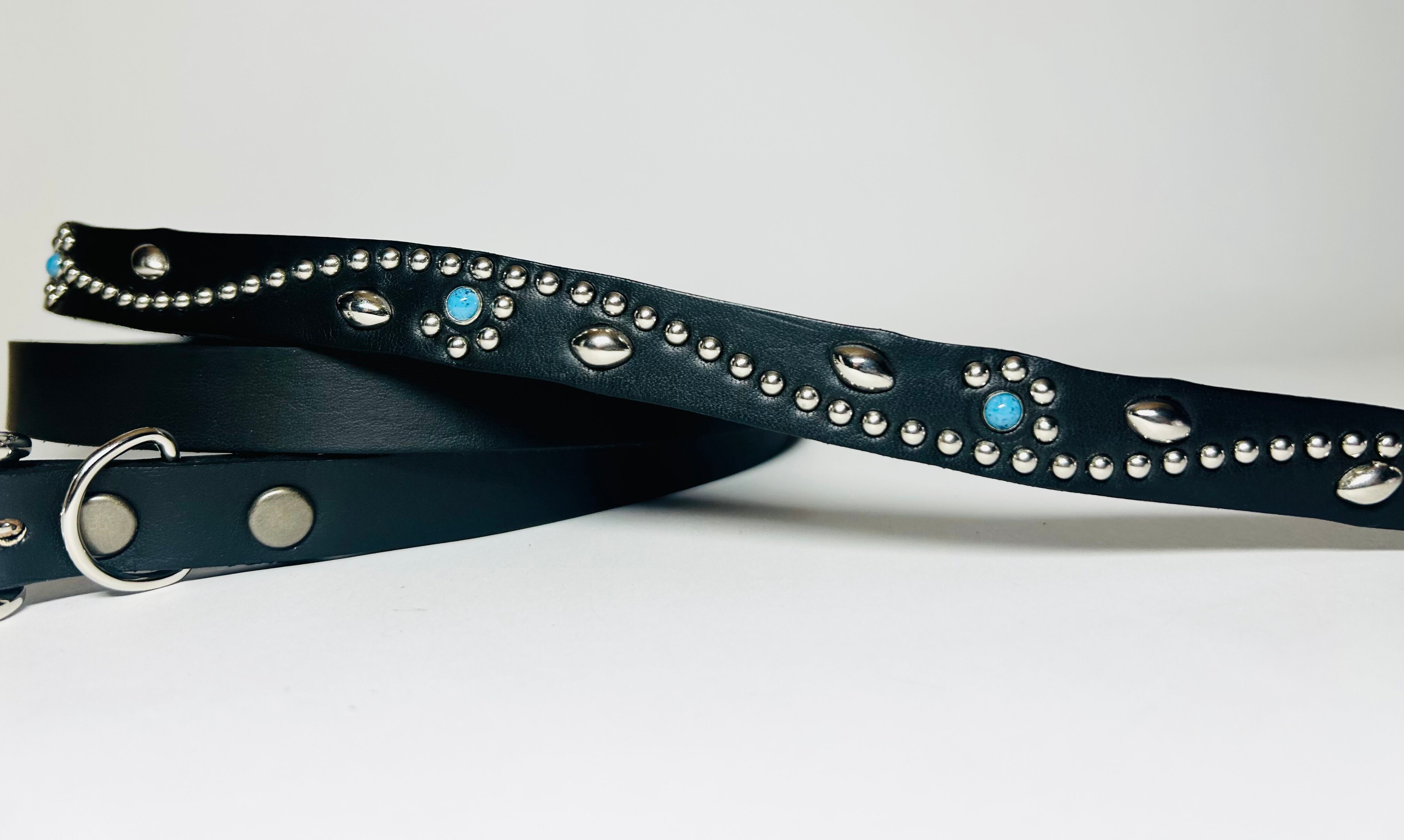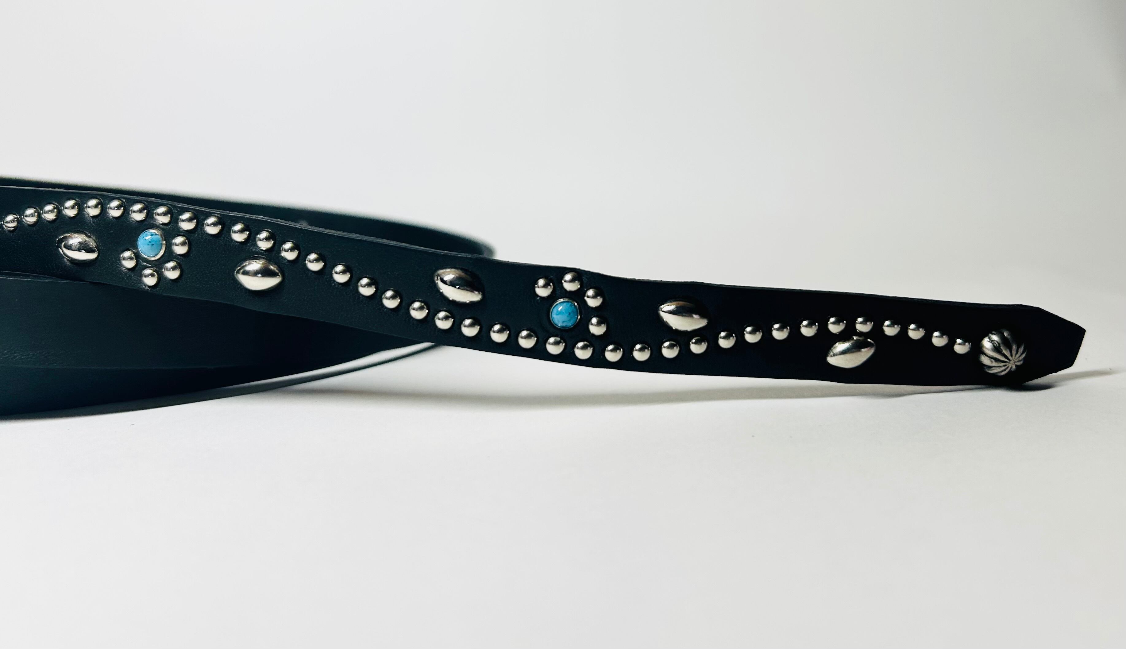 ケンサキにターコイズカラースタッズ先端にはアポロ大スタッズを使用したナローベルト。バックルの留め具がスナップボタン式ですのでバックルの取り外しが可能です。