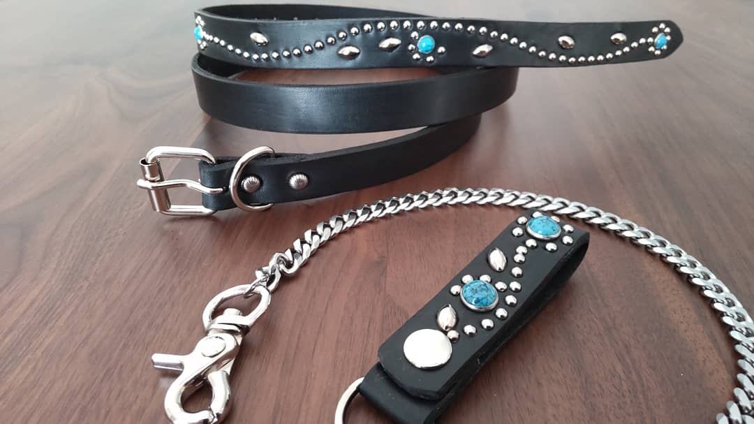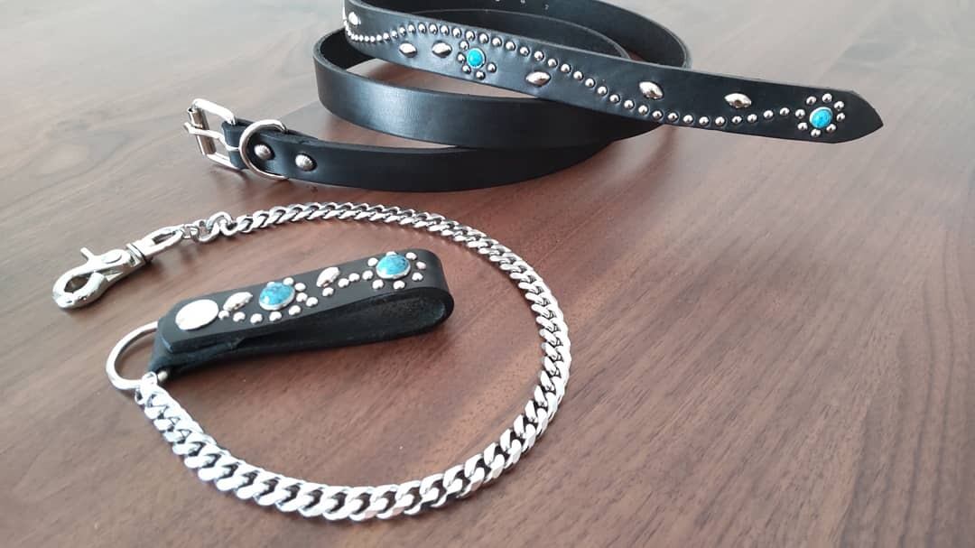 牛サドルレザーの革ストラップ部分にスタッズを施した9ミリ喜平ウォレットチェーン【ステンレス素材】ストラップ部分の革厚3.4mm、チェーンの長さ(革ストラップ、ナスカンも含め)約50cm