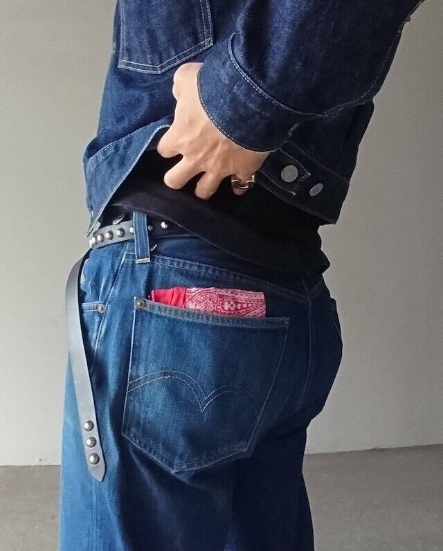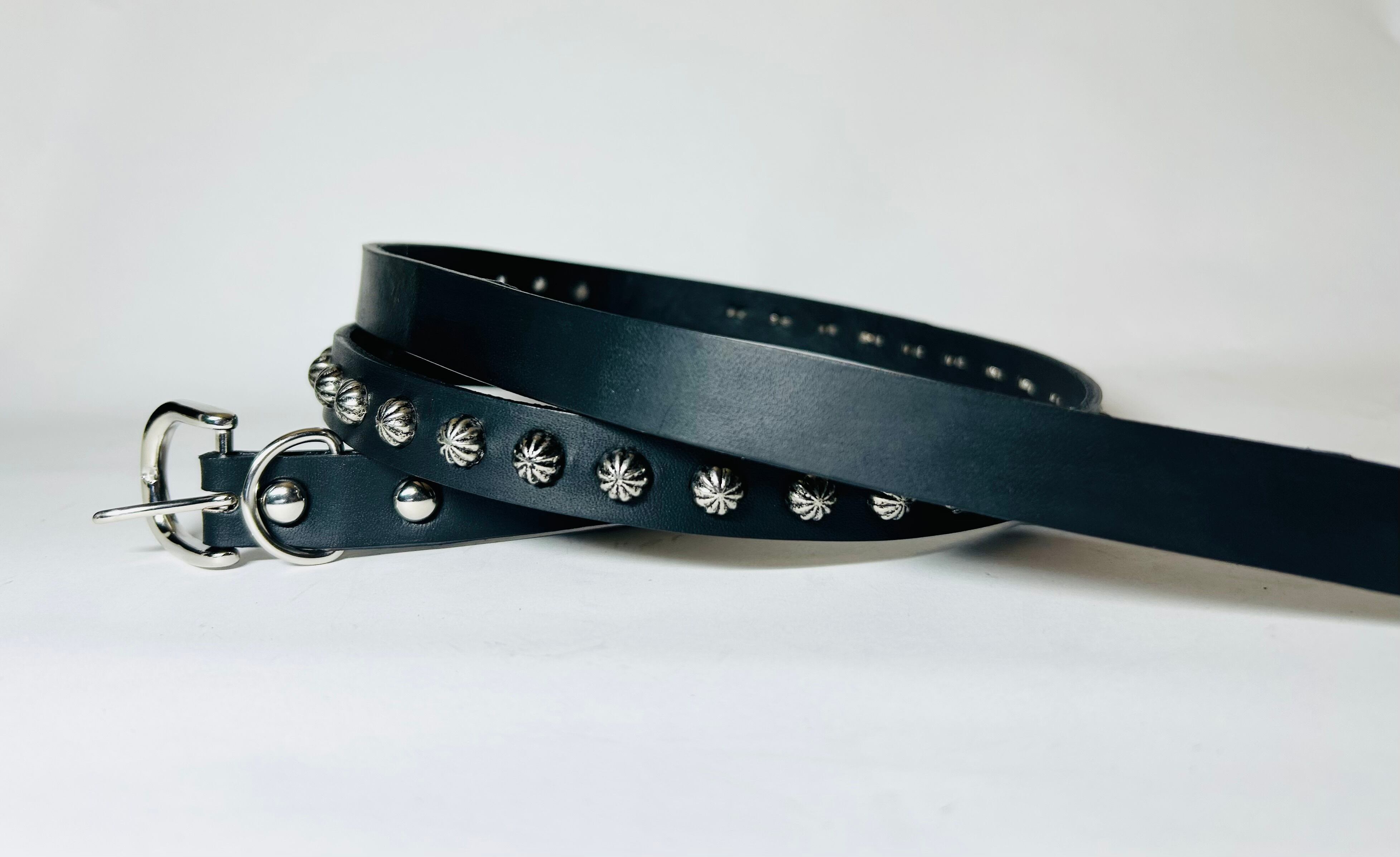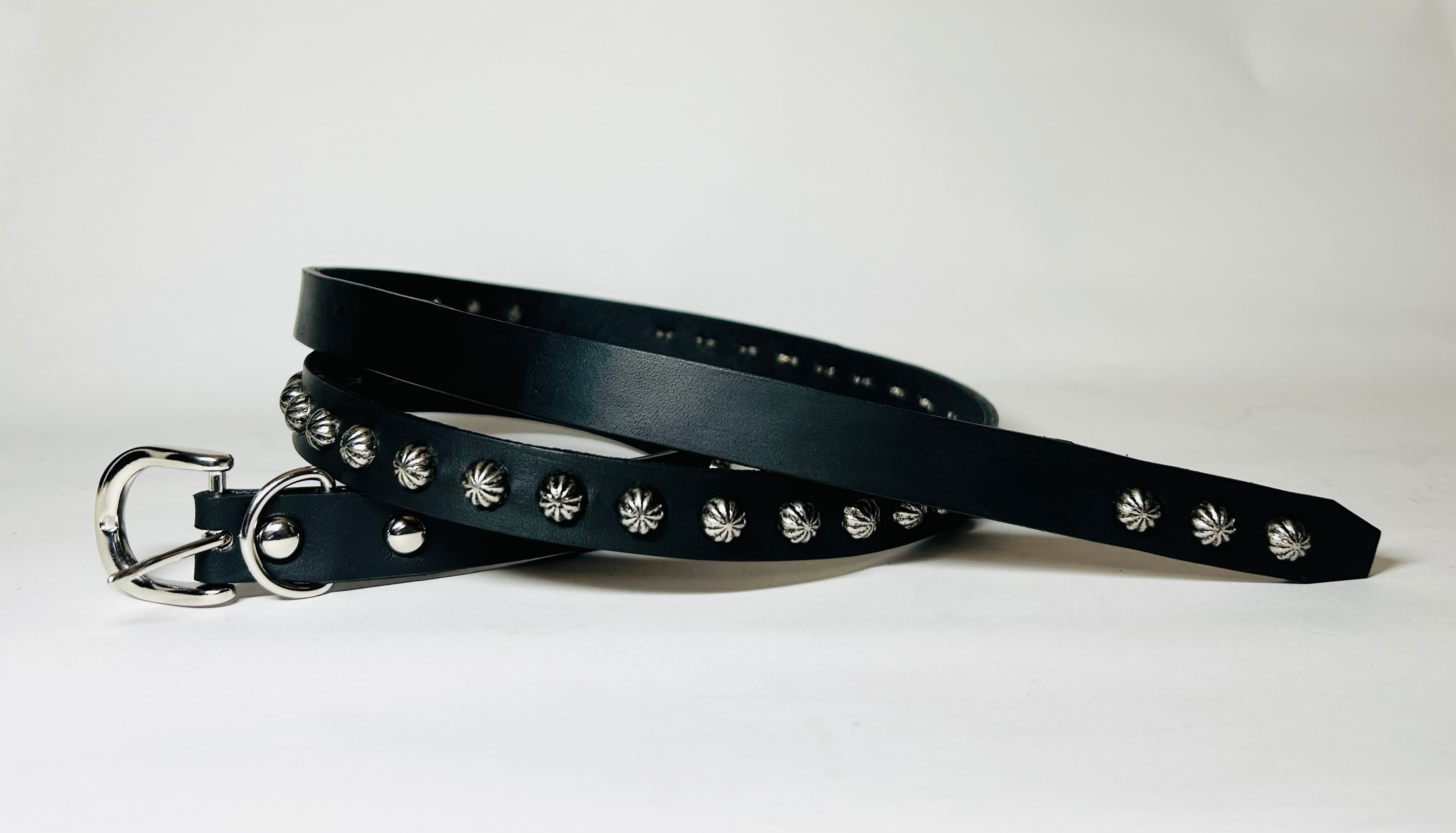 胴まわりとケンサキにシルバービックアポロを使用した、幅2センチのナローベルト。ビックアポロは直径約1センチ。