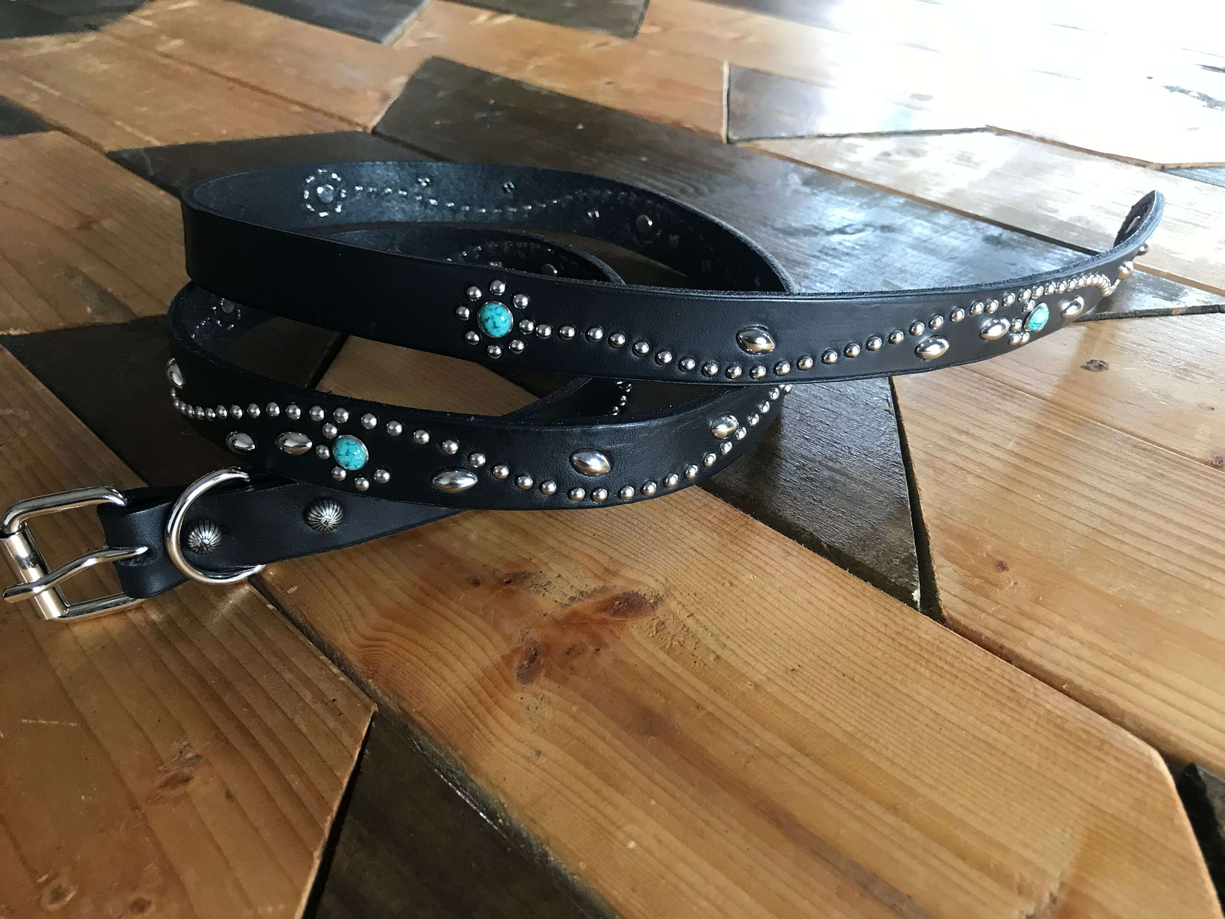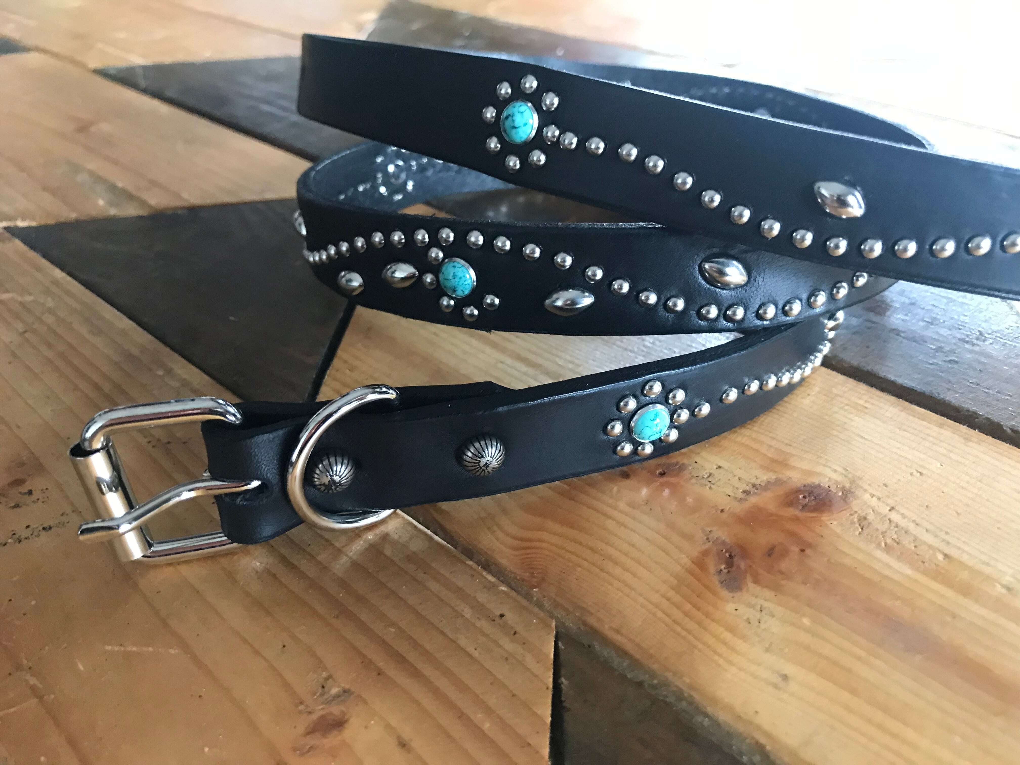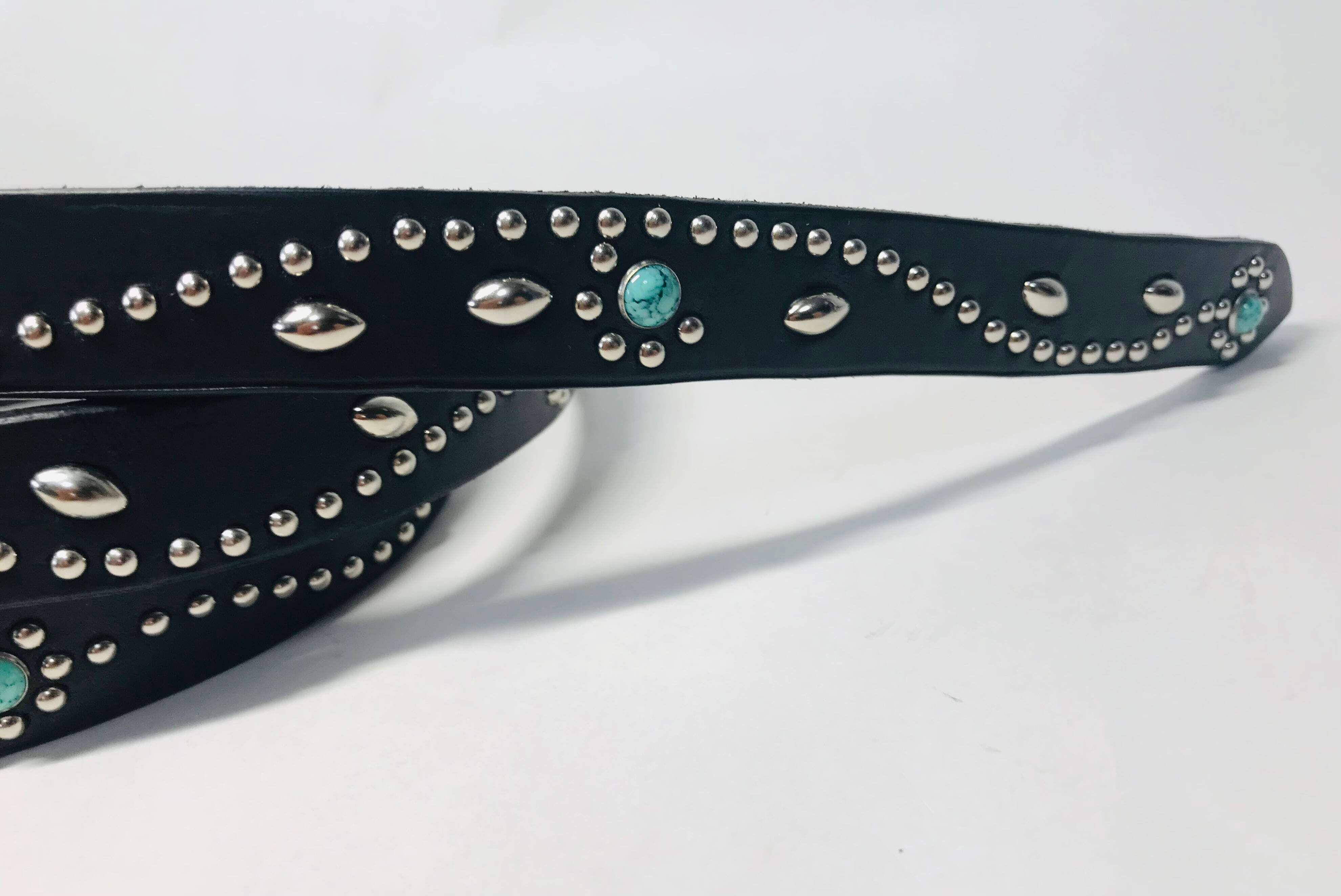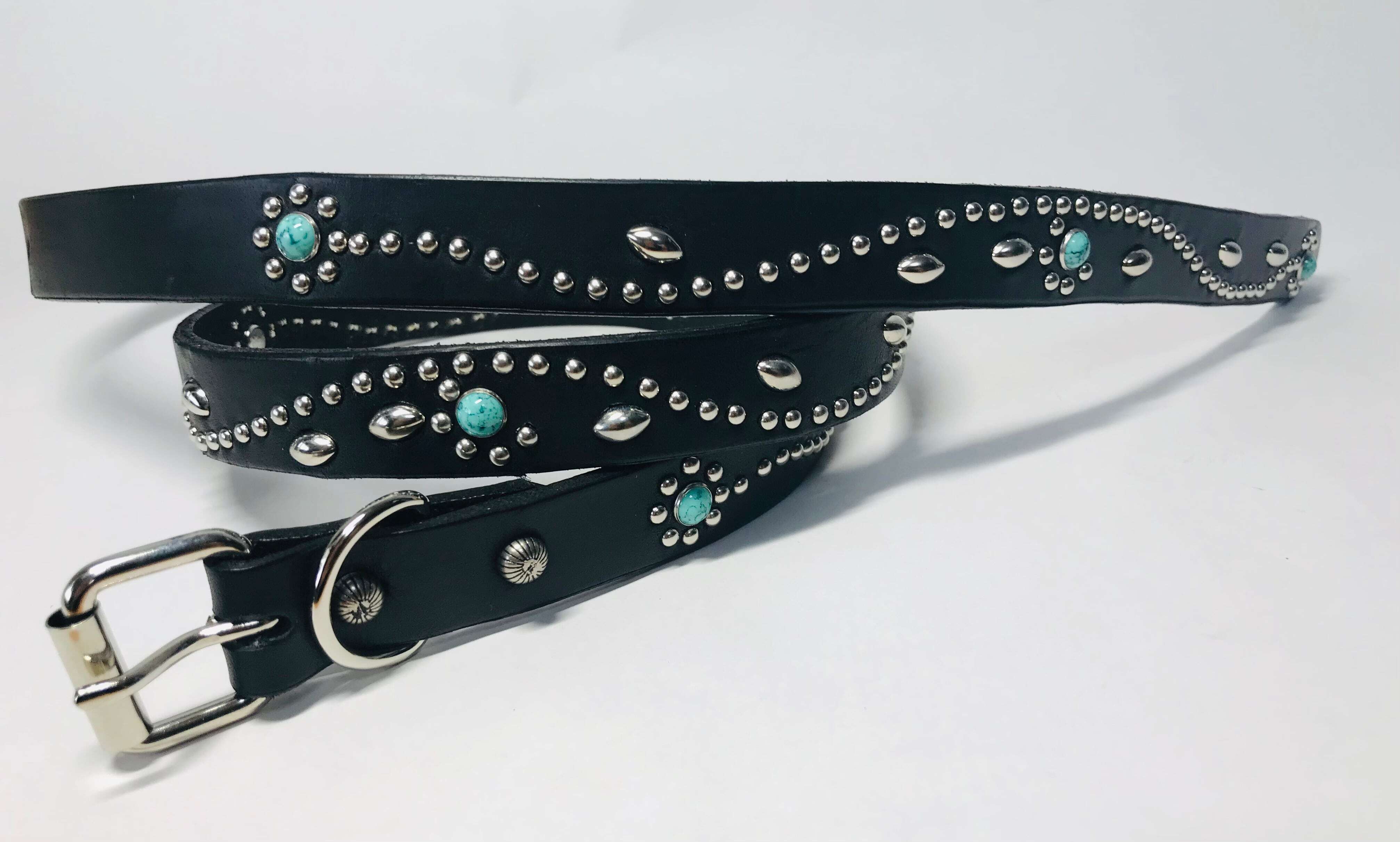 ベルト全体の360度にフラワーパターンスタッズを施したナローベルトです。グリーンマーブルカラースタッズを使用。