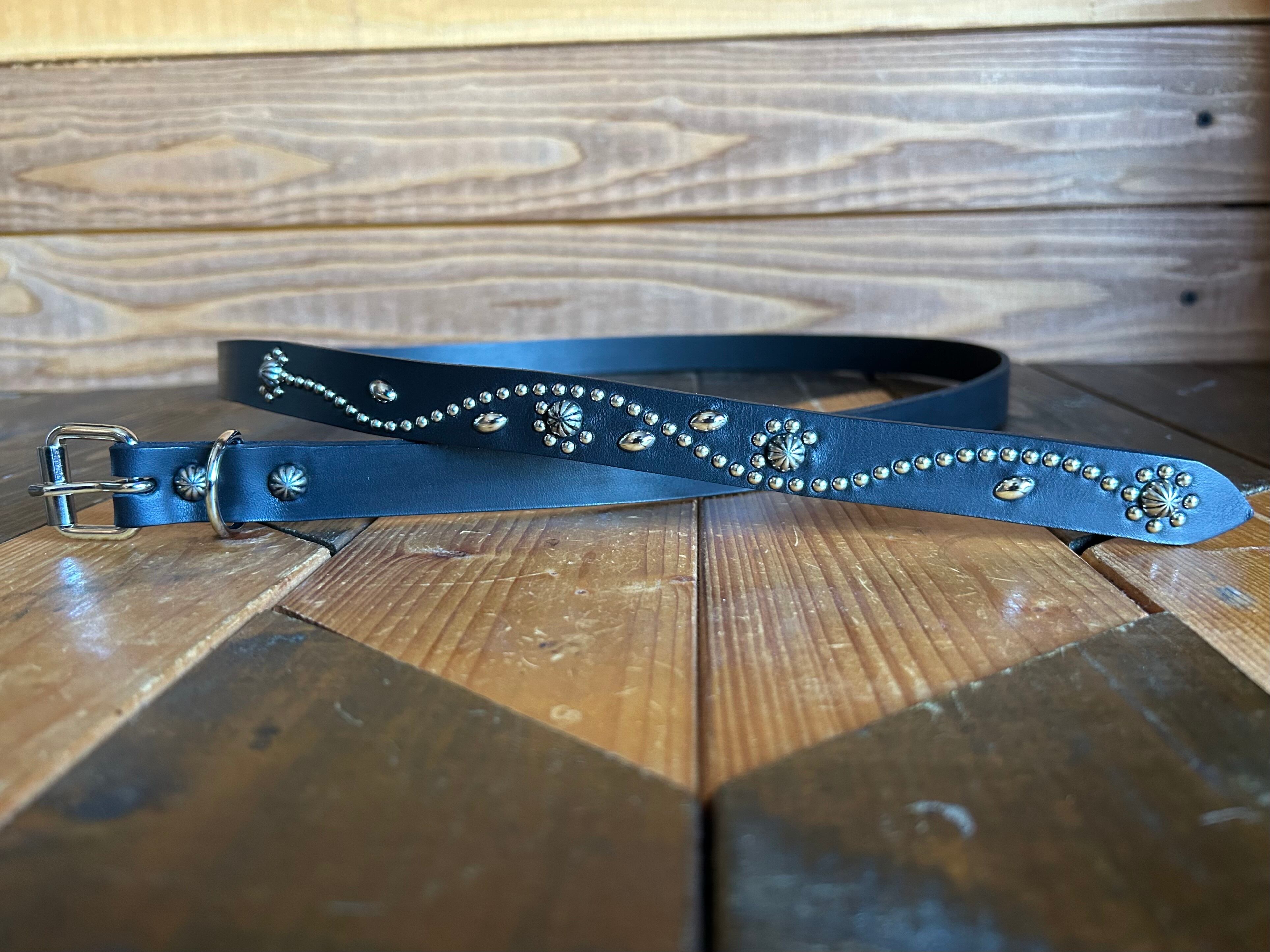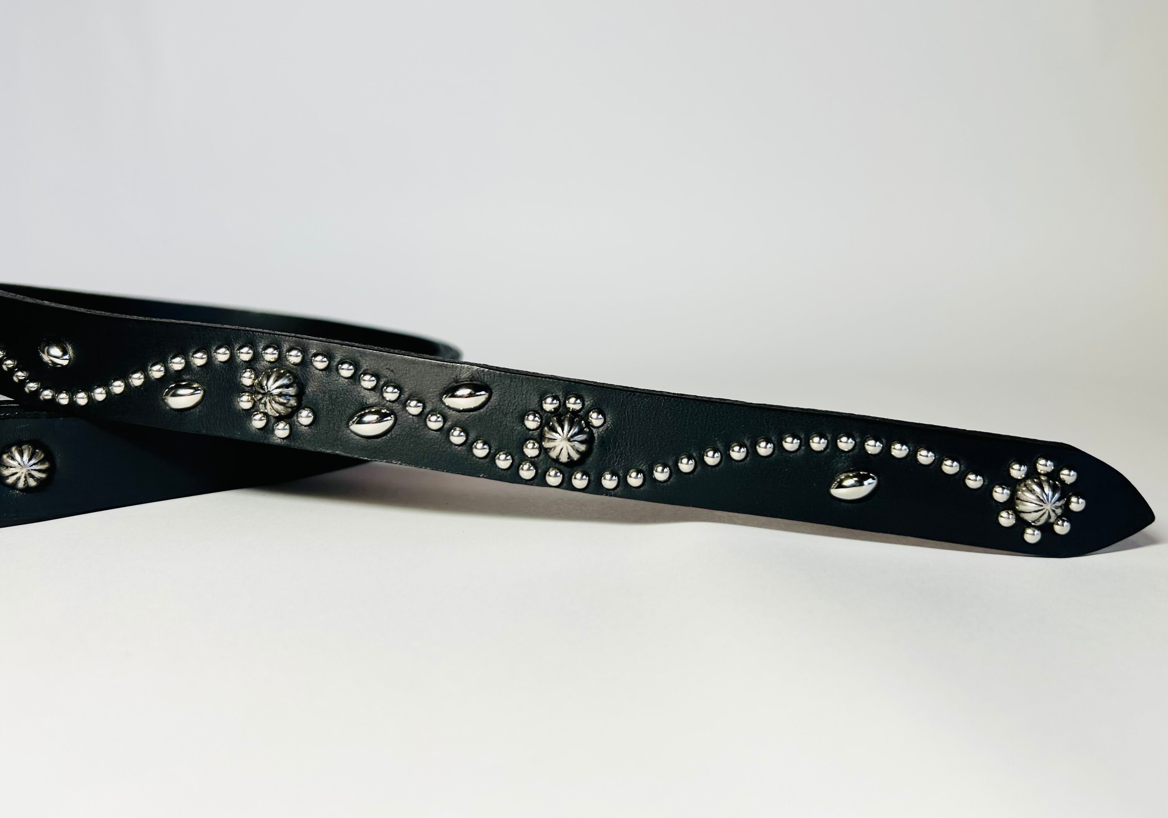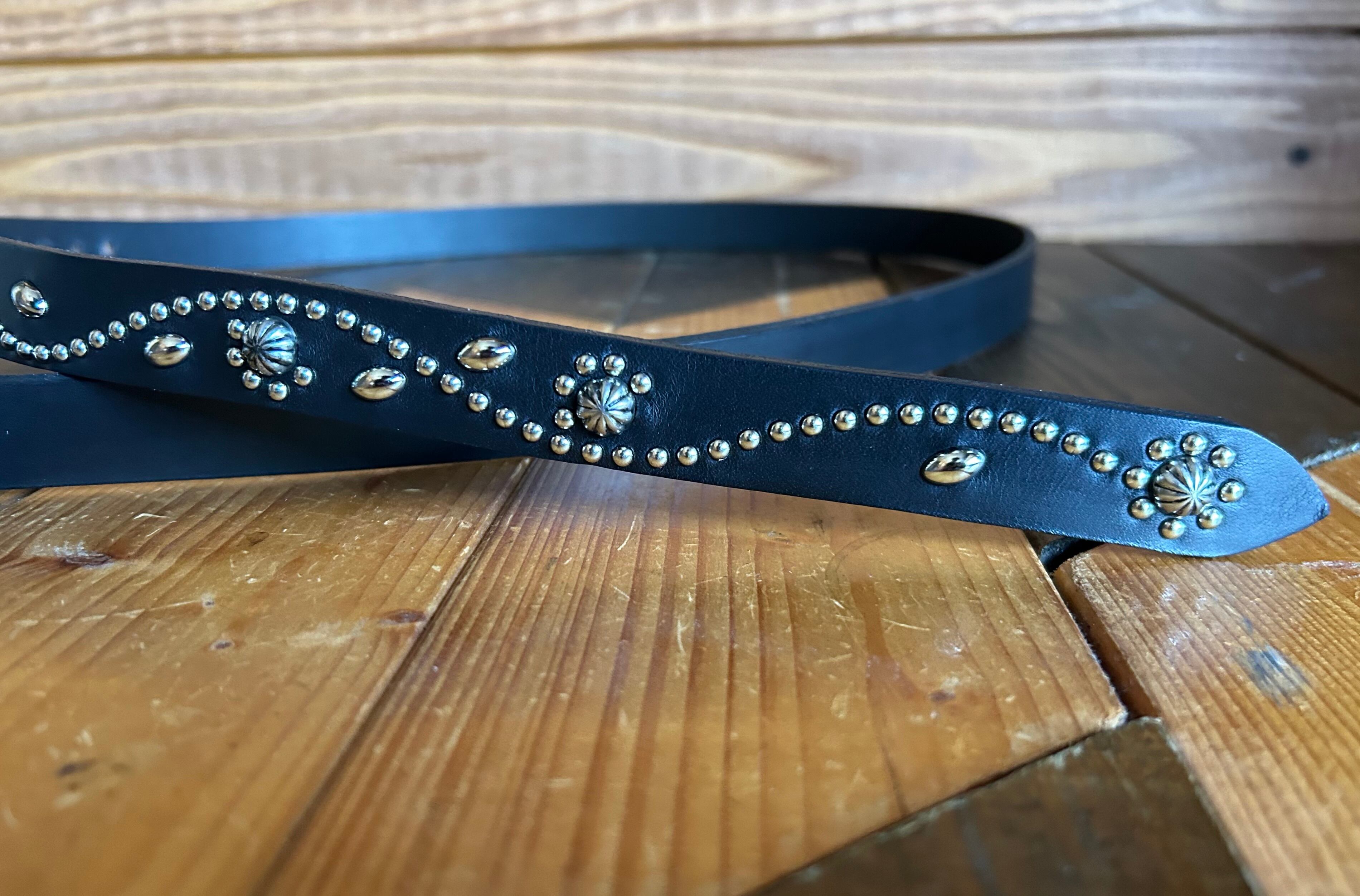 剣先にシルバーフラワー、直径約10ミリのビックアポロスタッズを施したナローベルト。