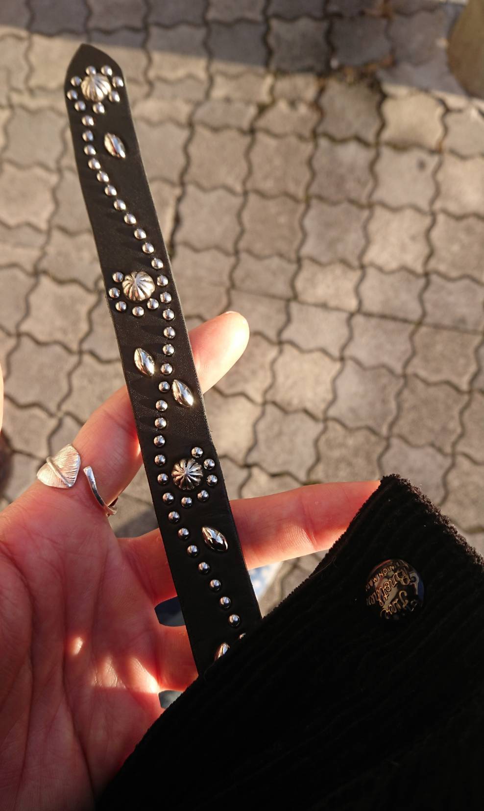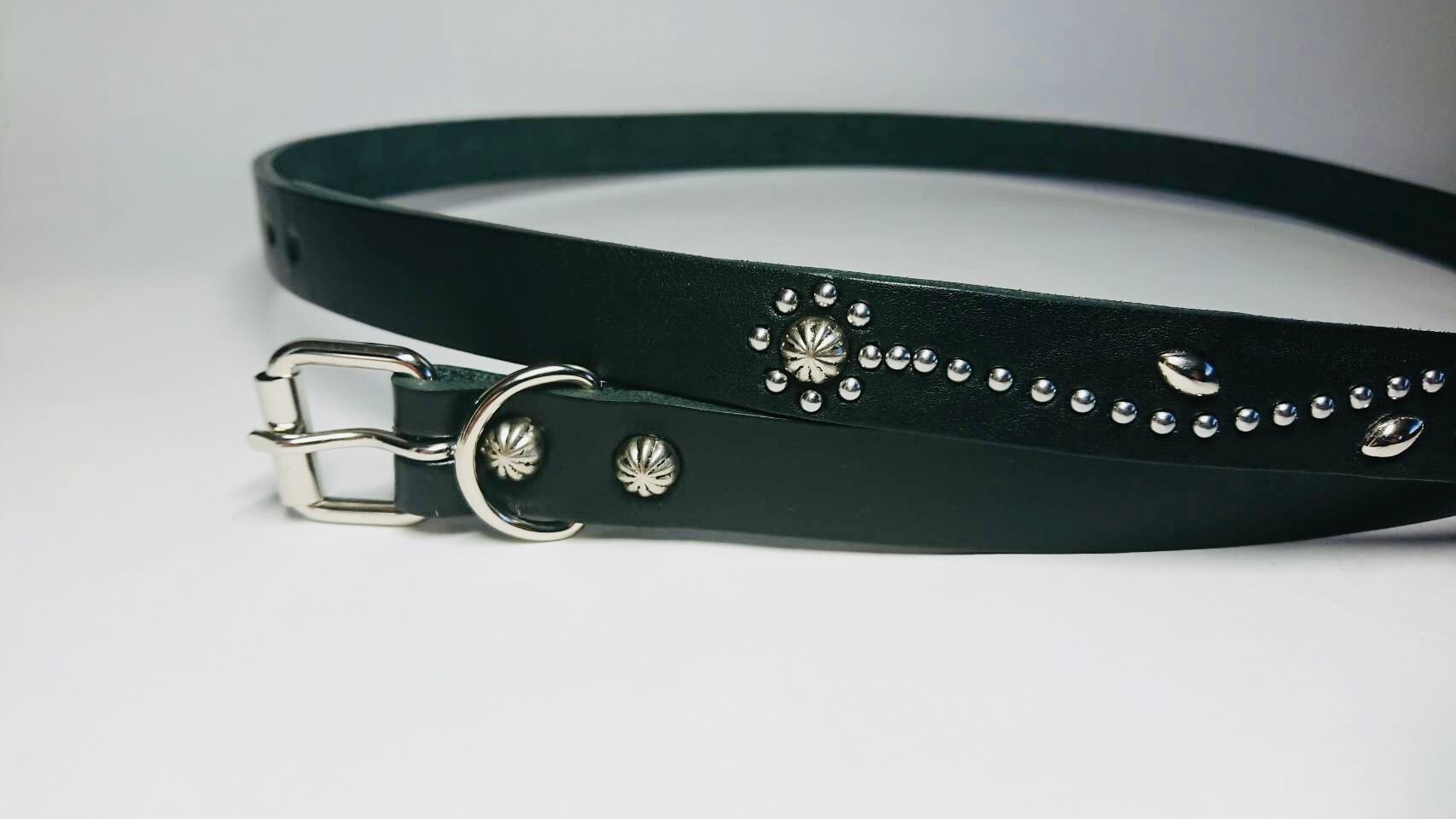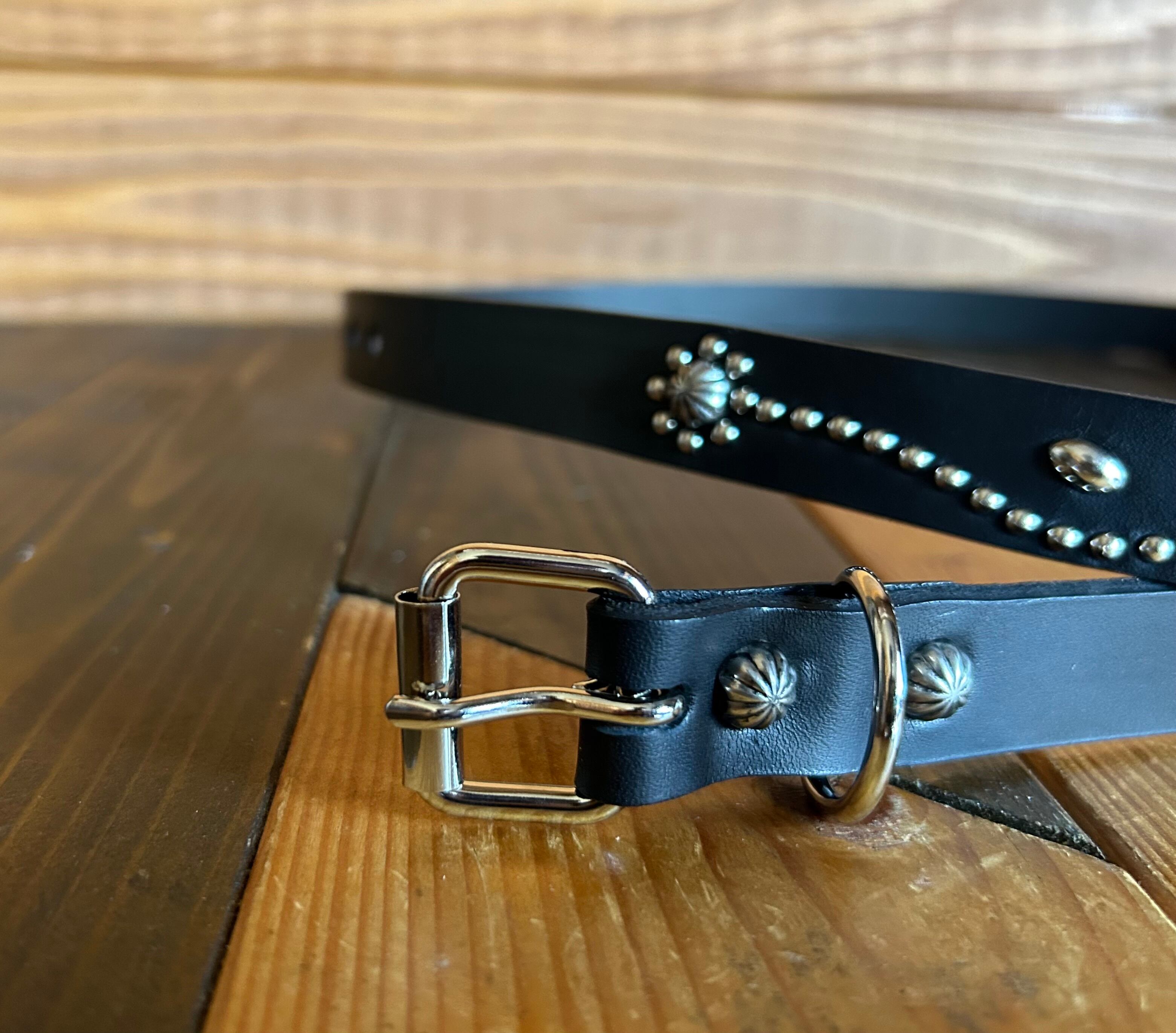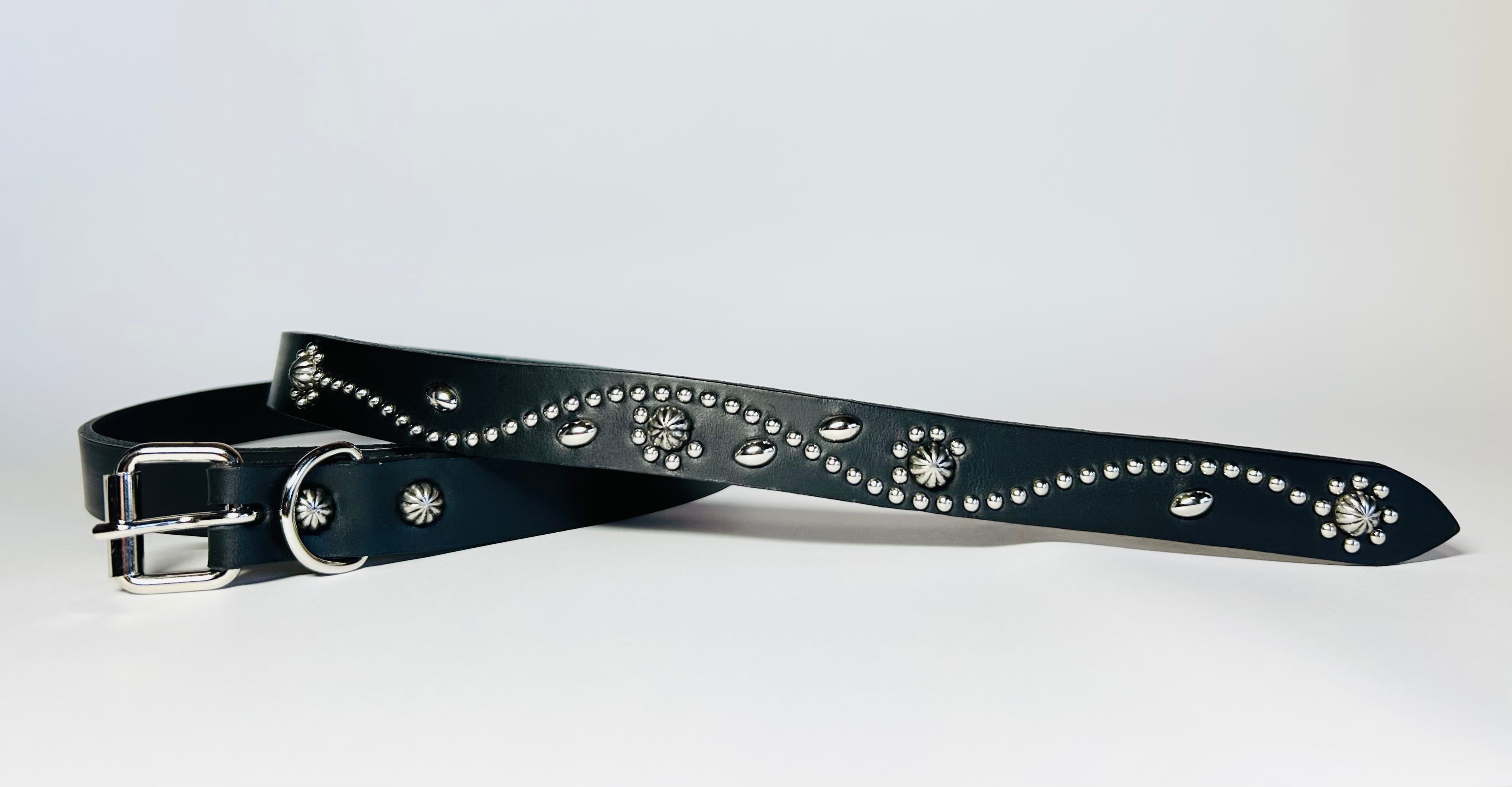 剣先にシルバーフラワー、直径約10ミリのビックアポロスタッズを施したナローベルト。