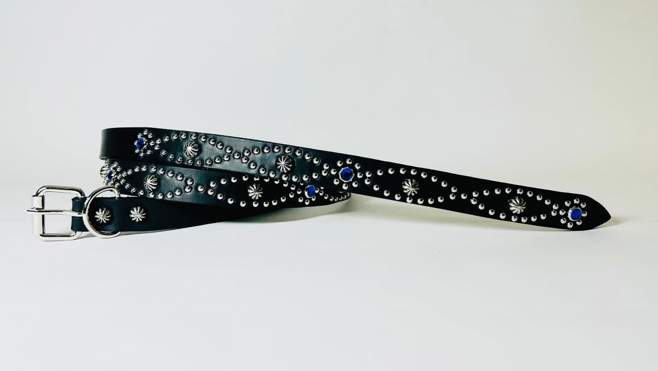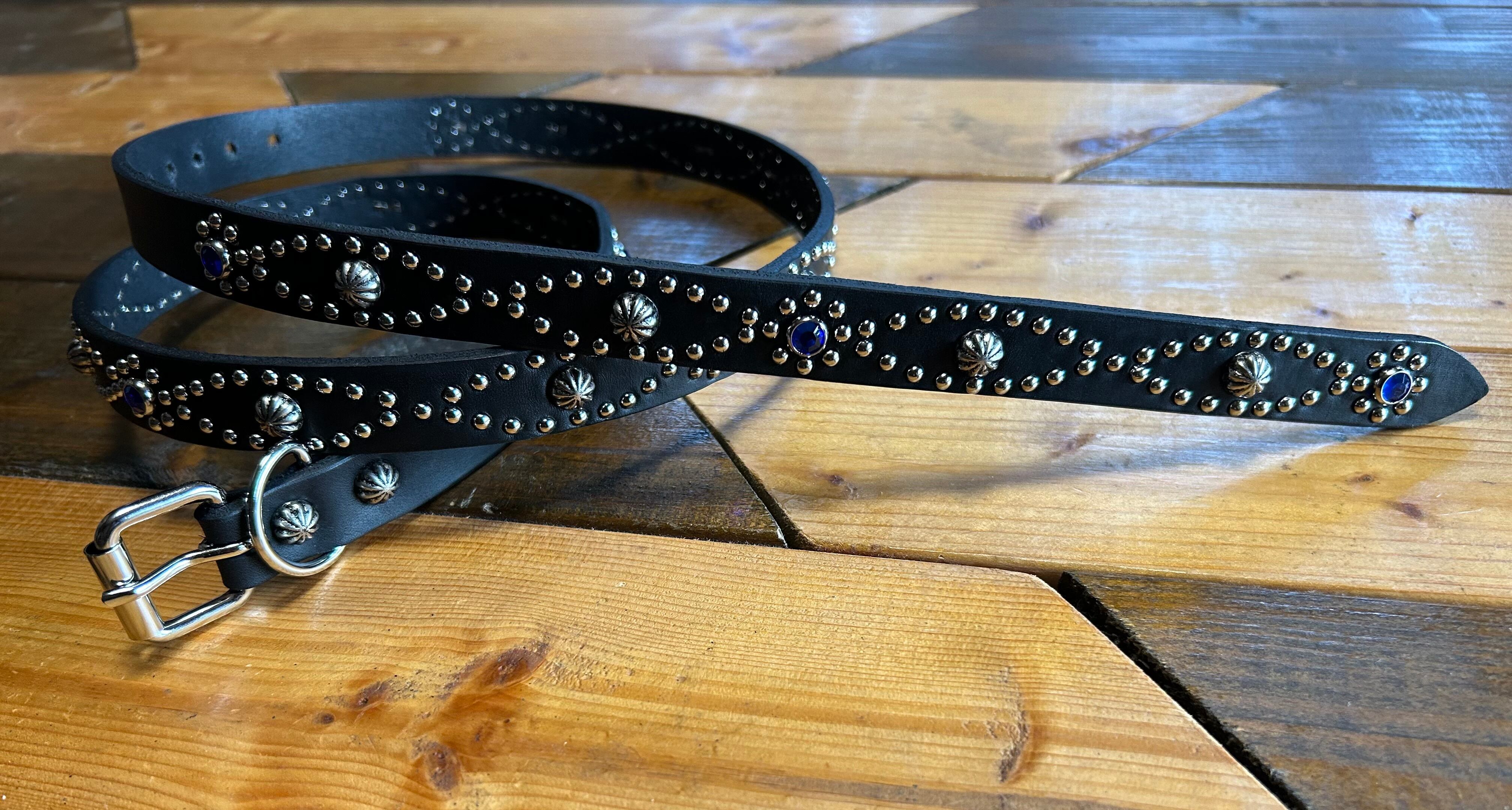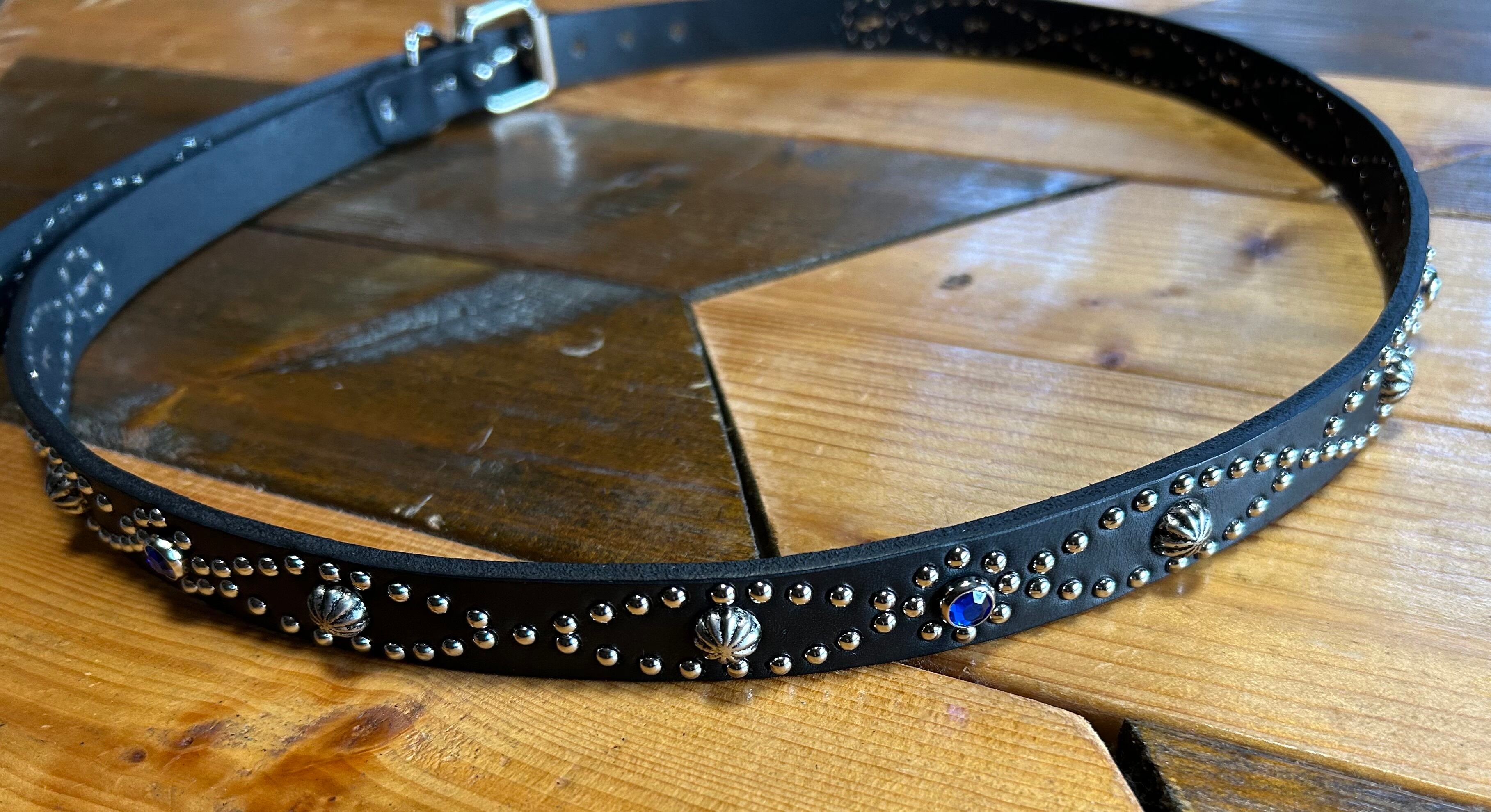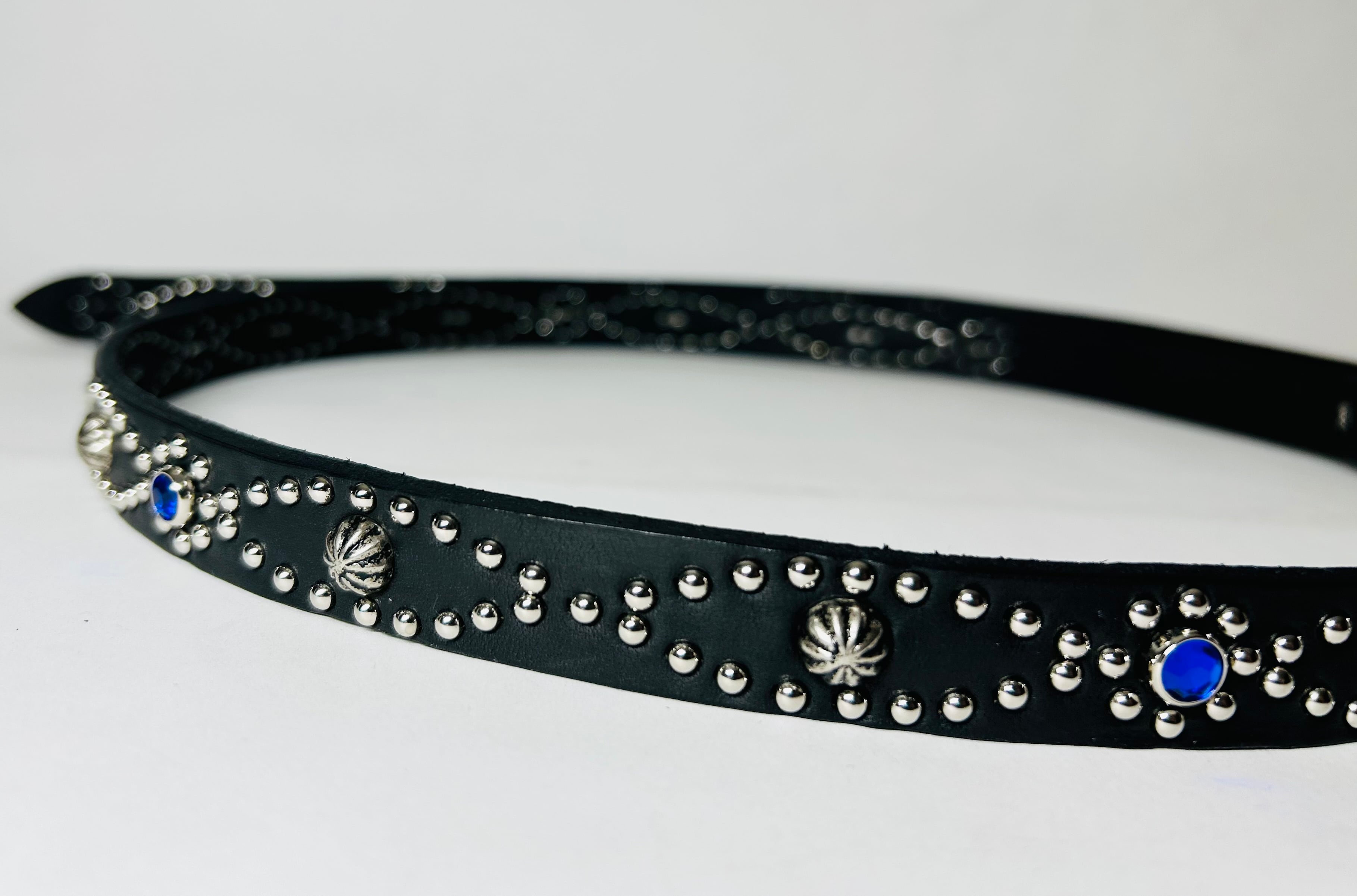 ベルト全体の360度にブルーストーンバタフライスタッズを施したナローベルト。
