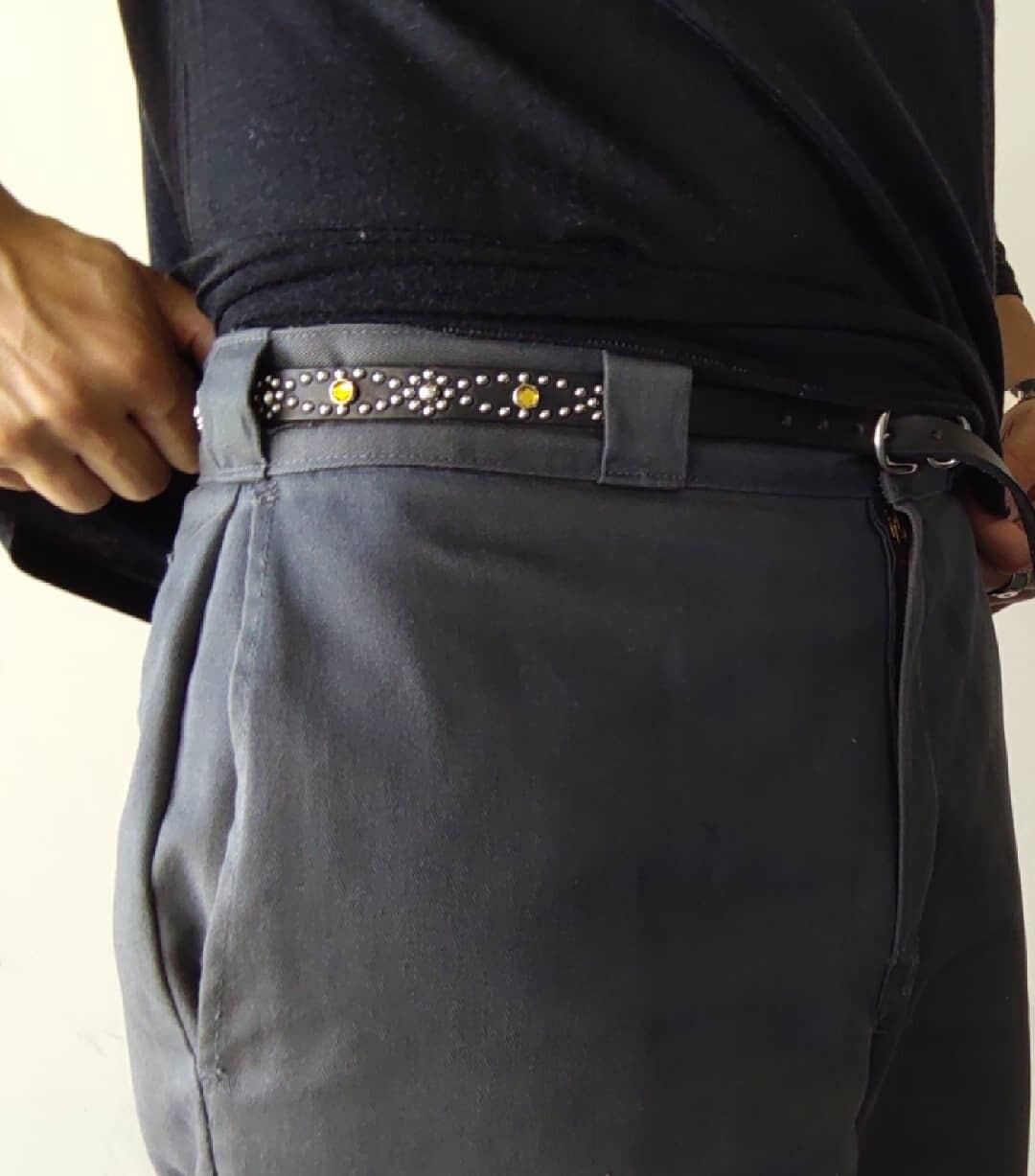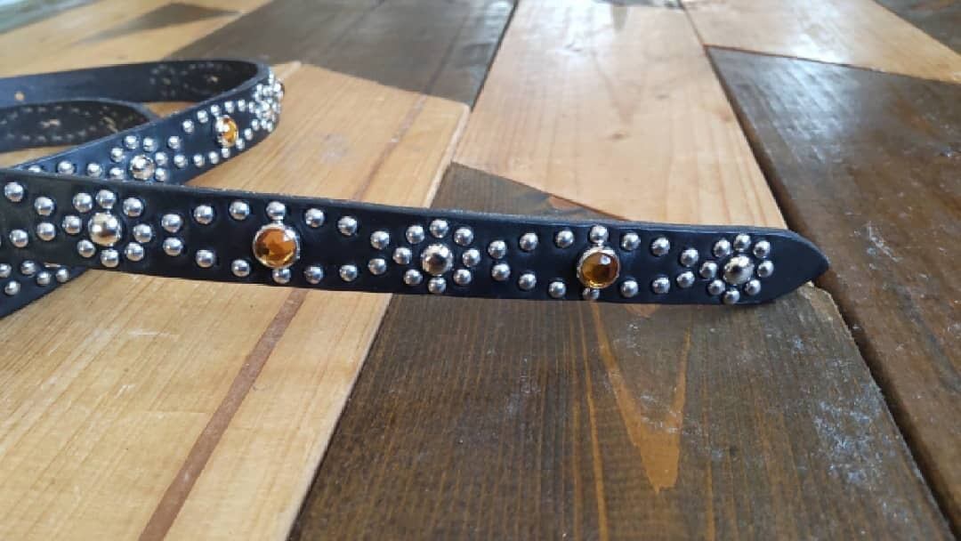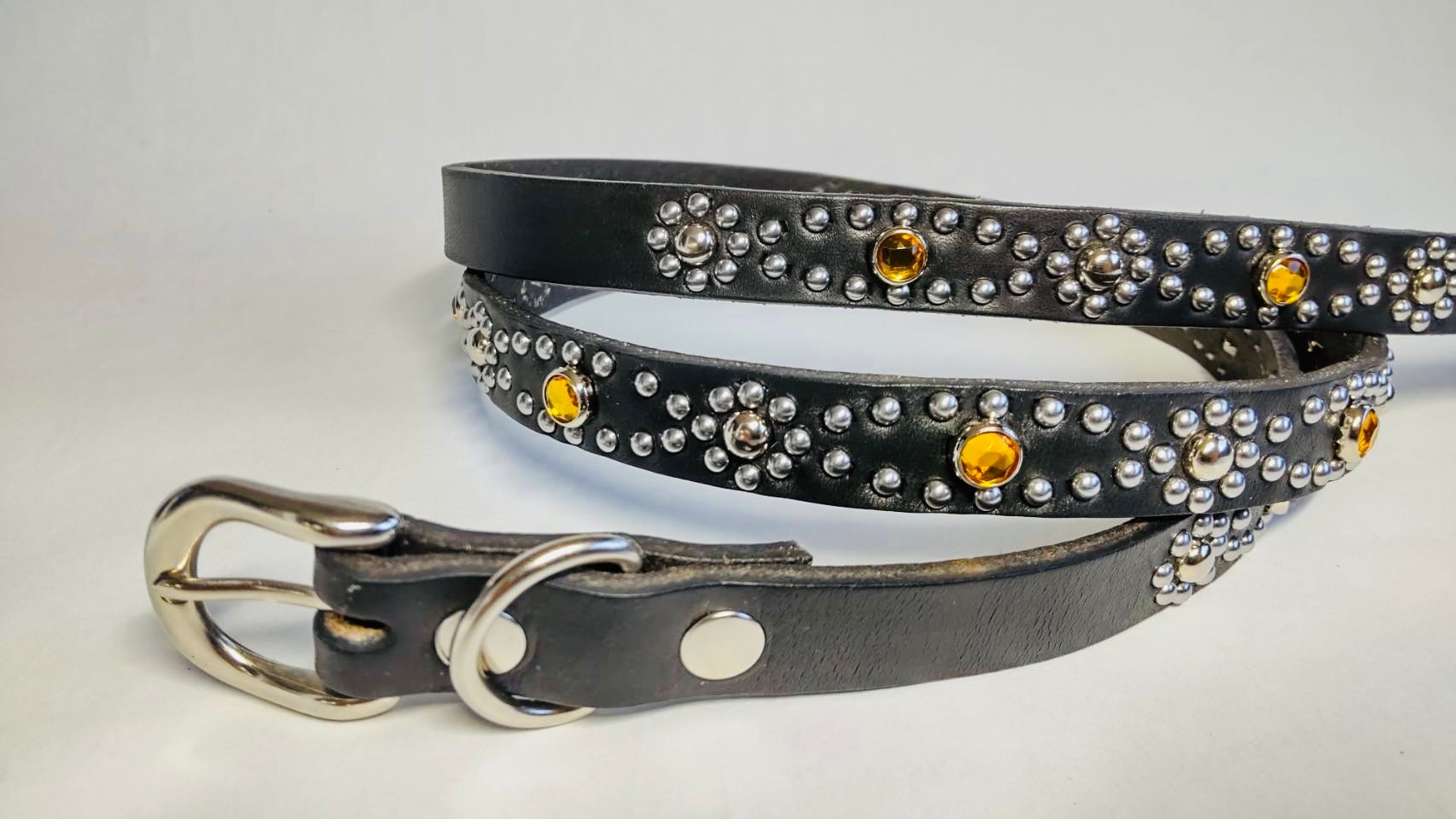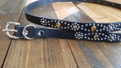 ベルト全体360度にサンフラワースタッズを施したナローベルト。バックルの留め具がスナップボタン式ですのでバックルの取り外しが可能です。