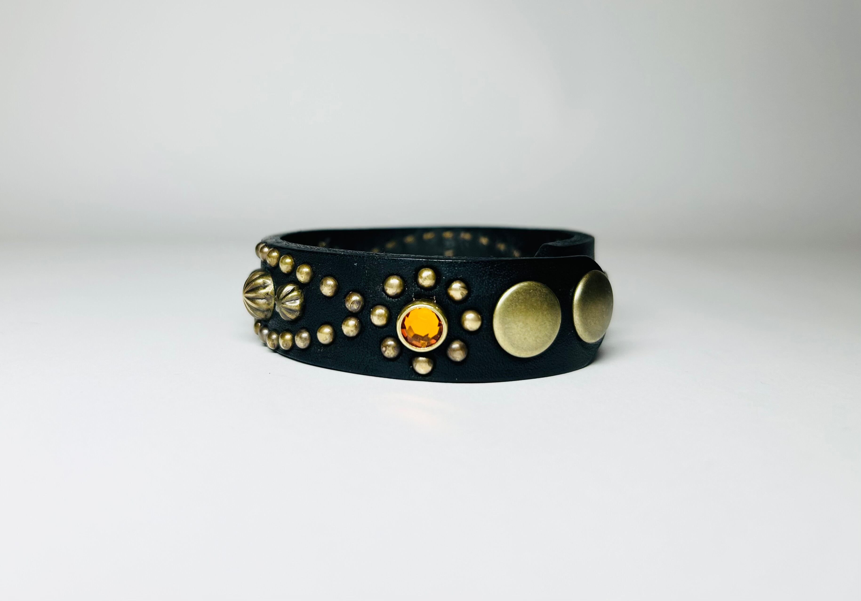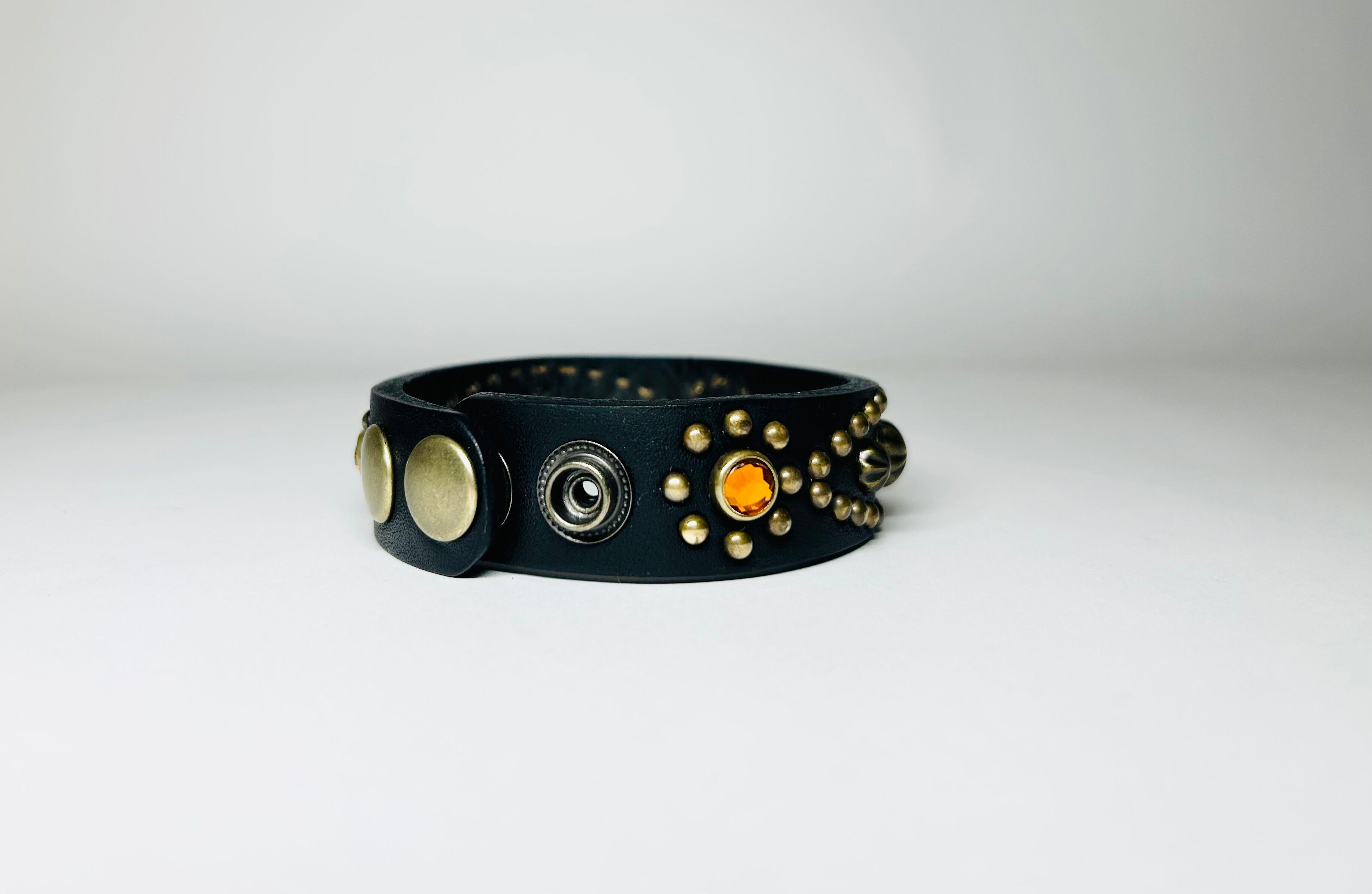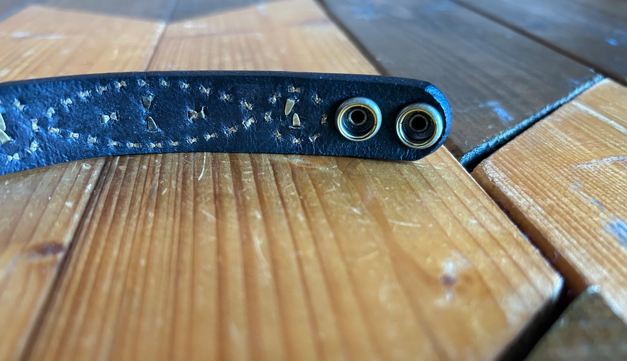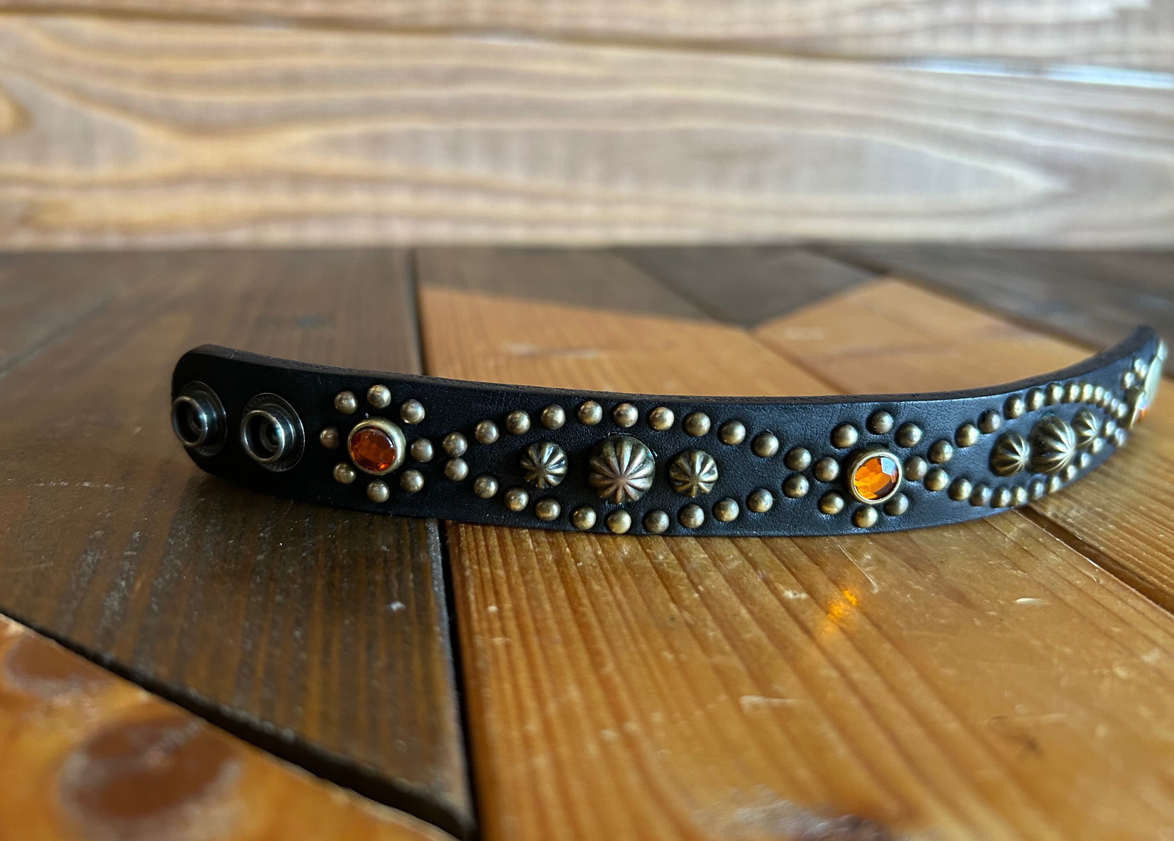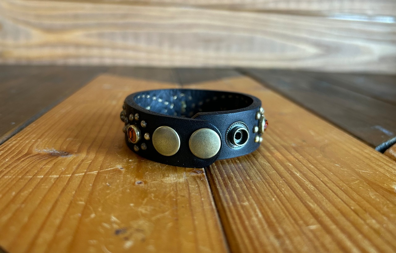 ダブルスナップボタンによりサイズが二段階調整できます。アンティークブラススタッズ使用。