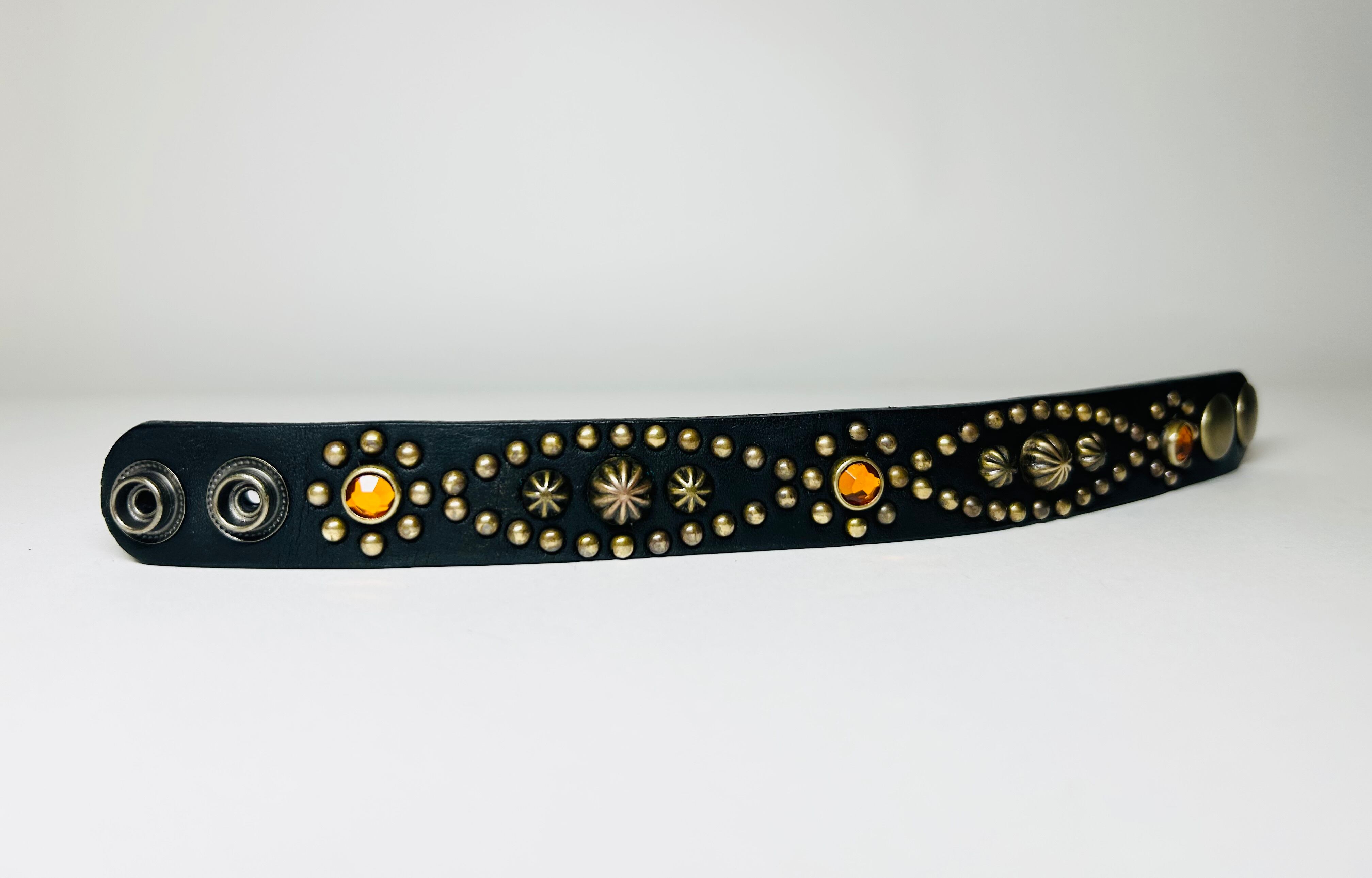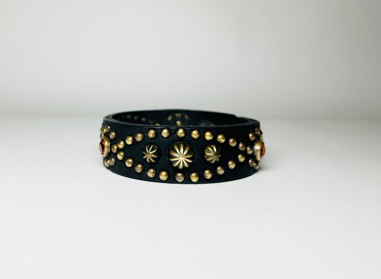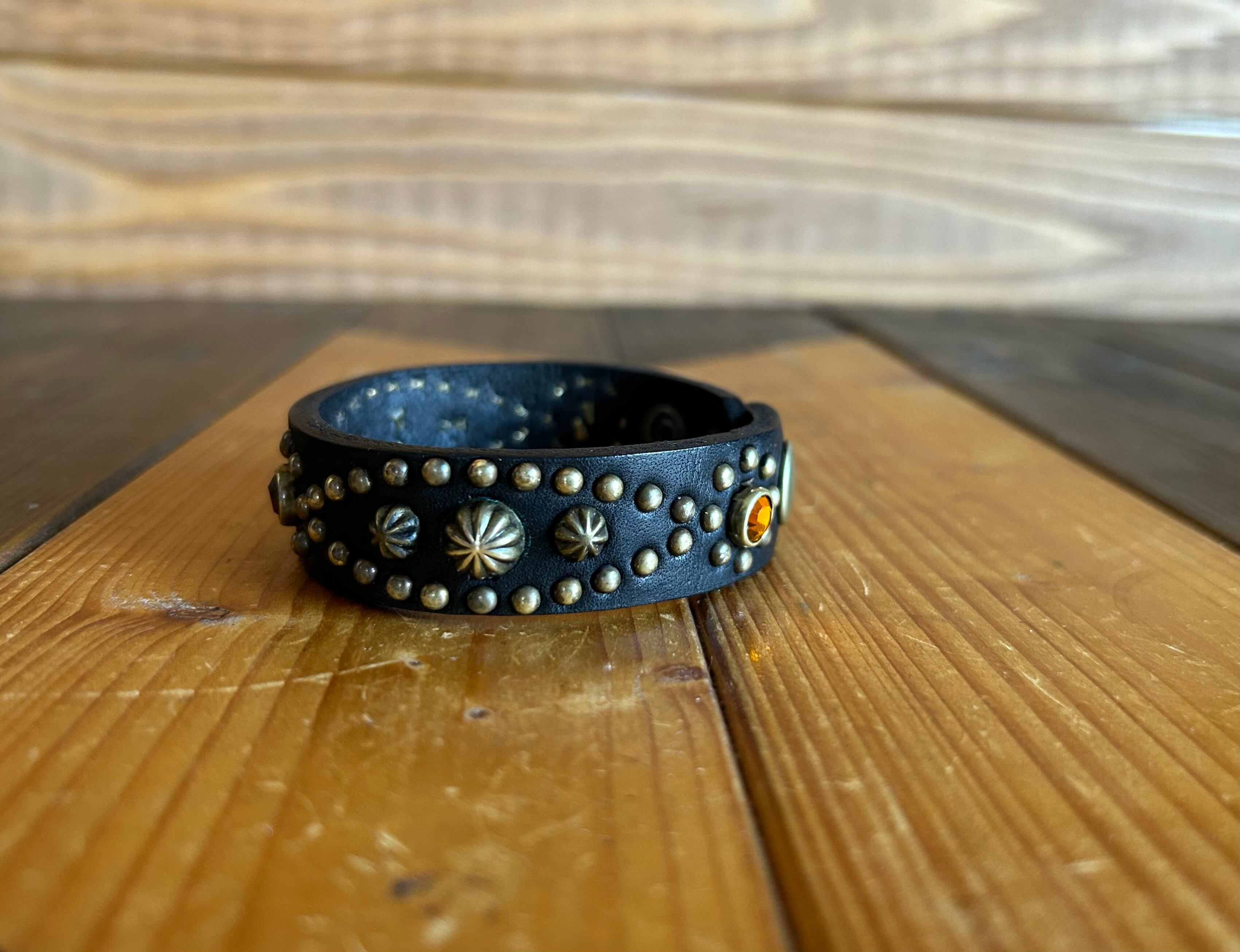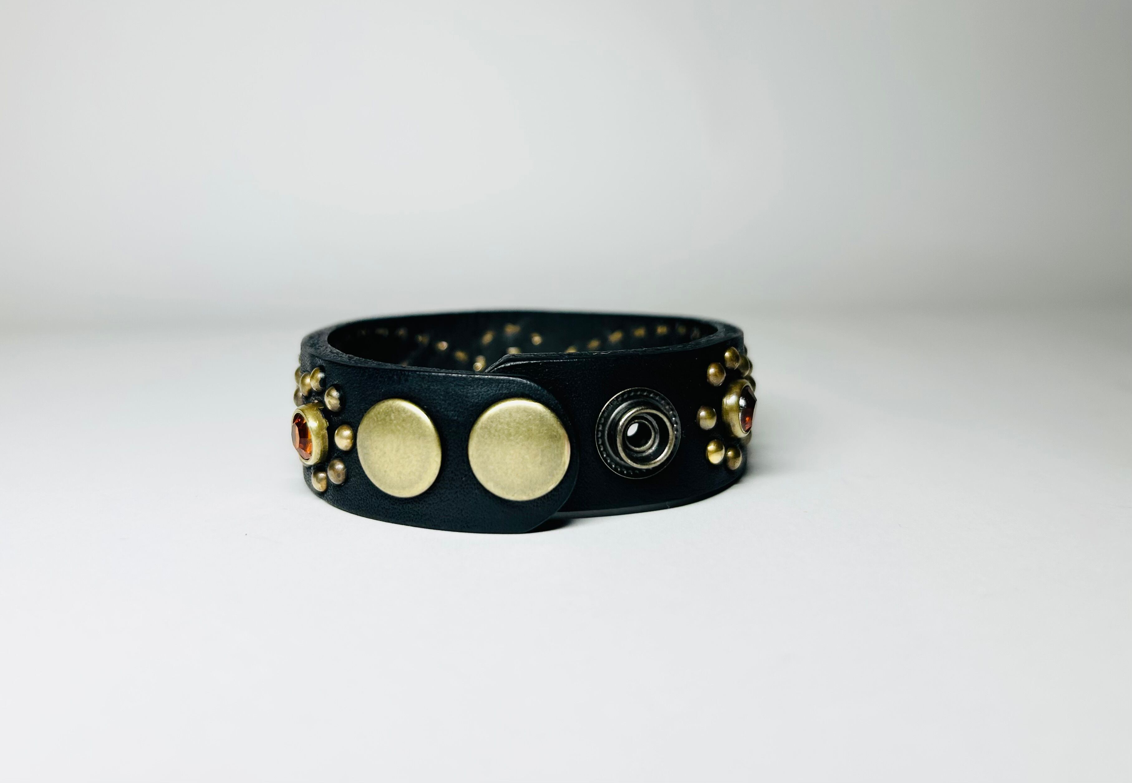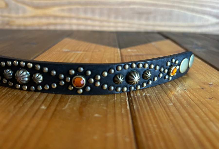 ダブルスナップボタンによりサイズが二段階調整できます。アンティークブラススタッズ使用。