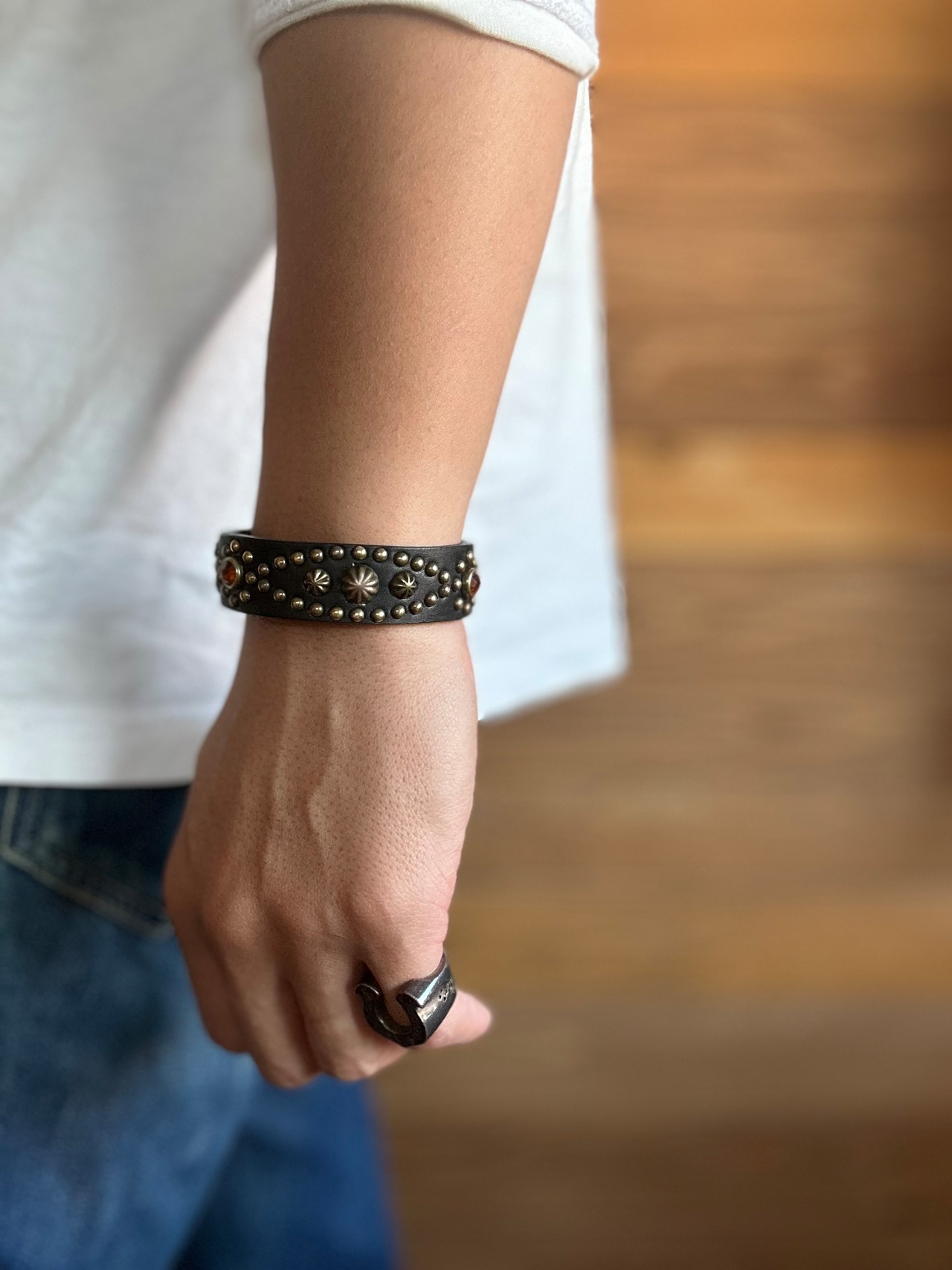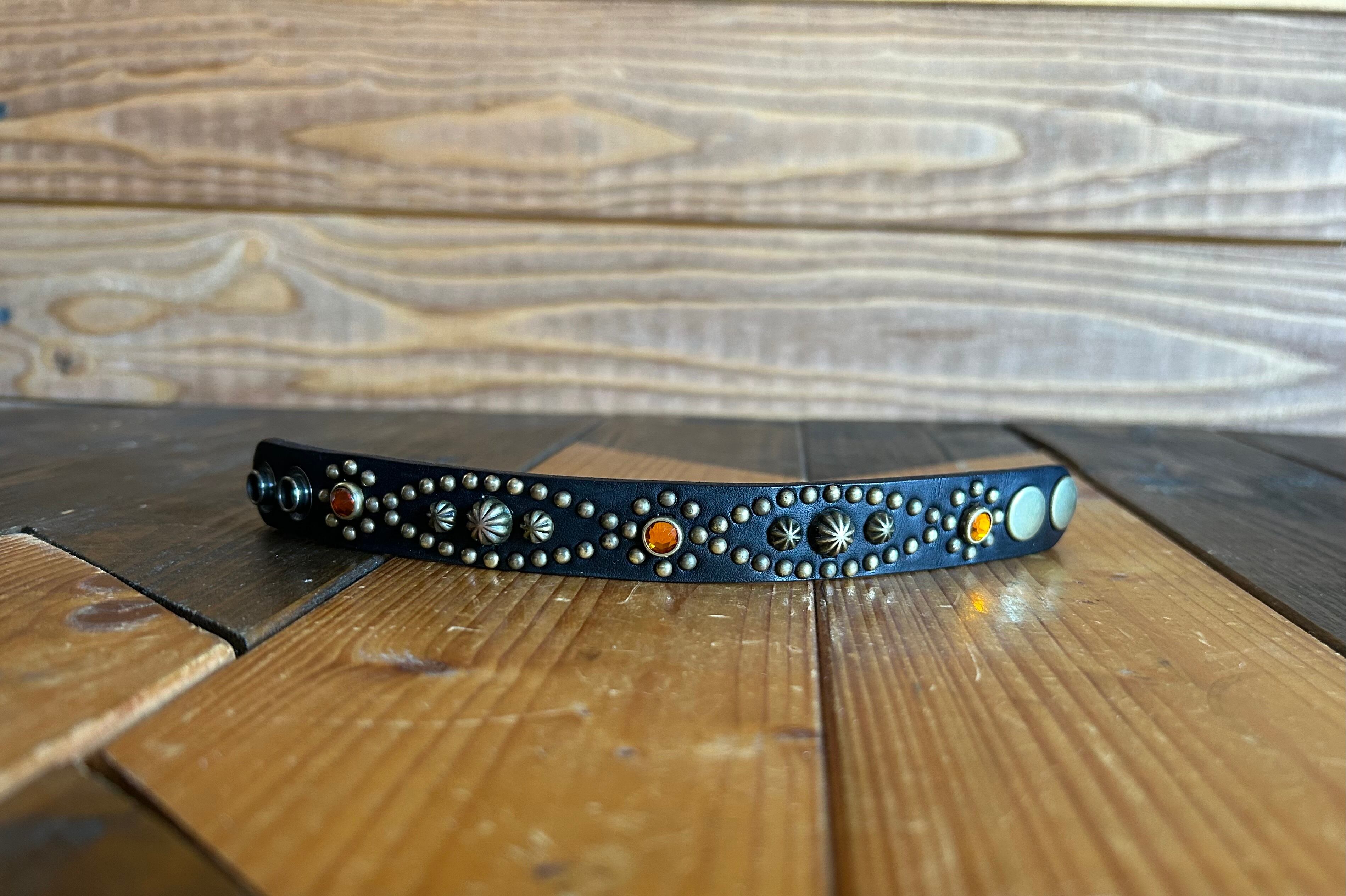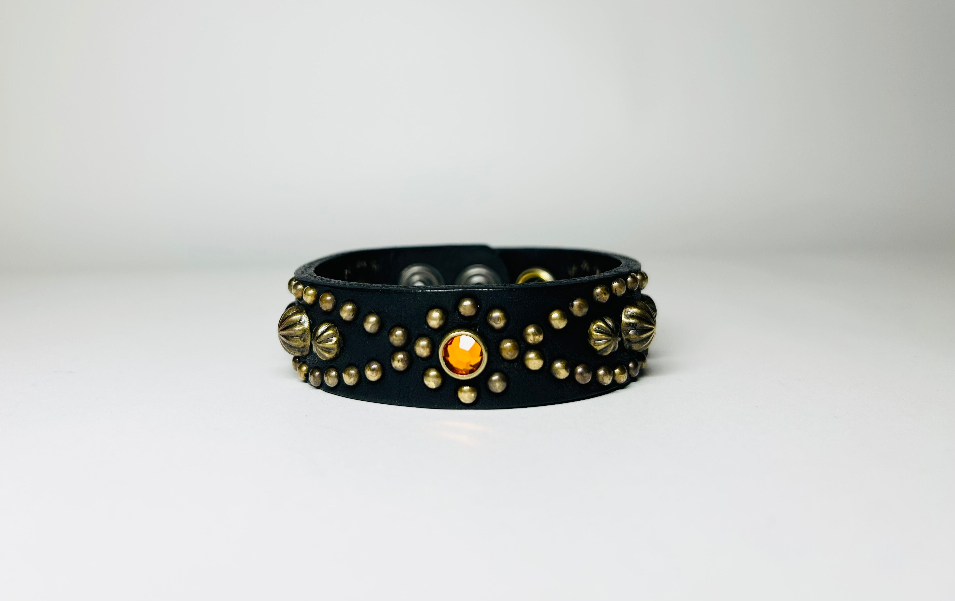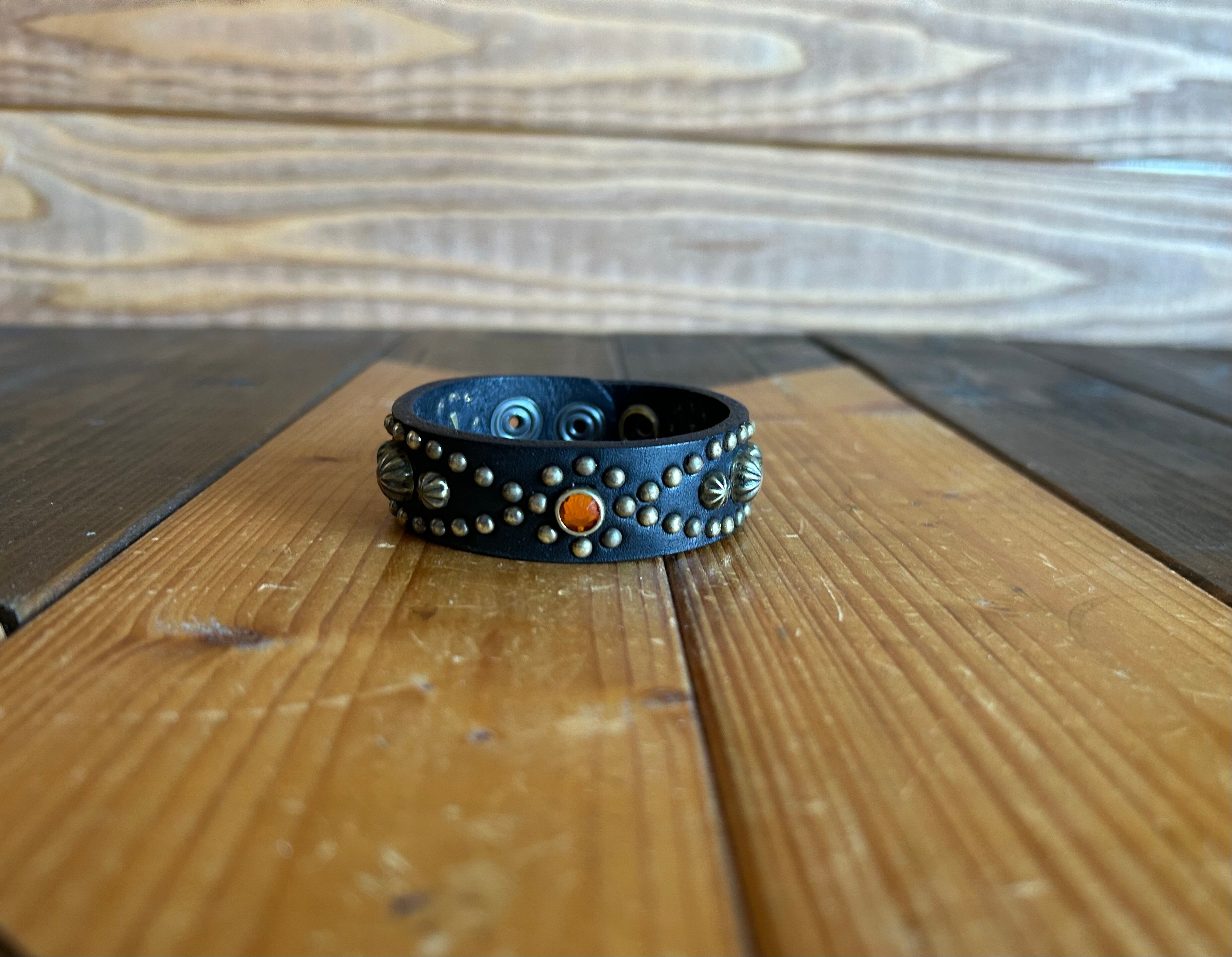 ダブルスナップボタンによりサイズが二段階調整できます。アンティークブラススタッズ使用。
