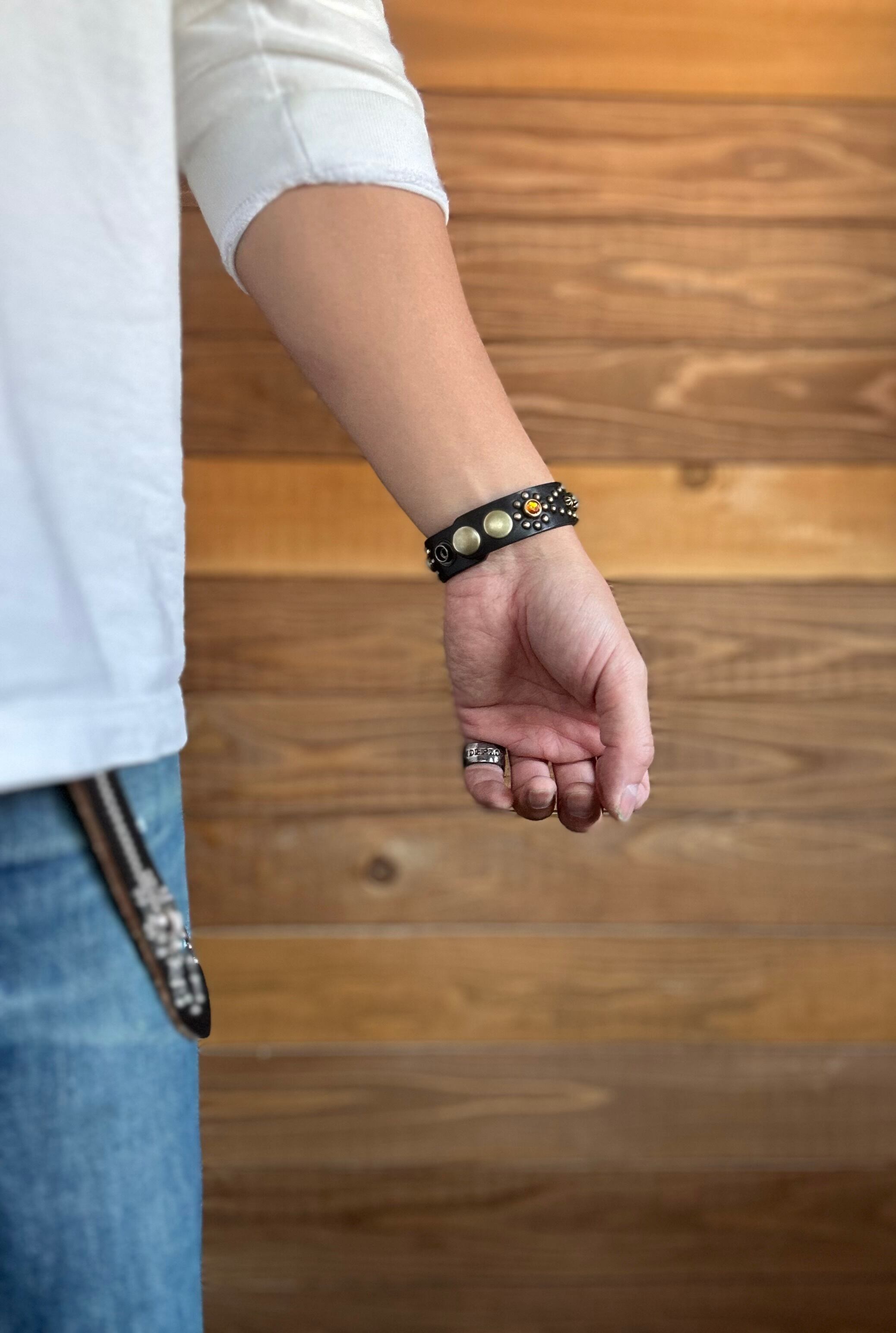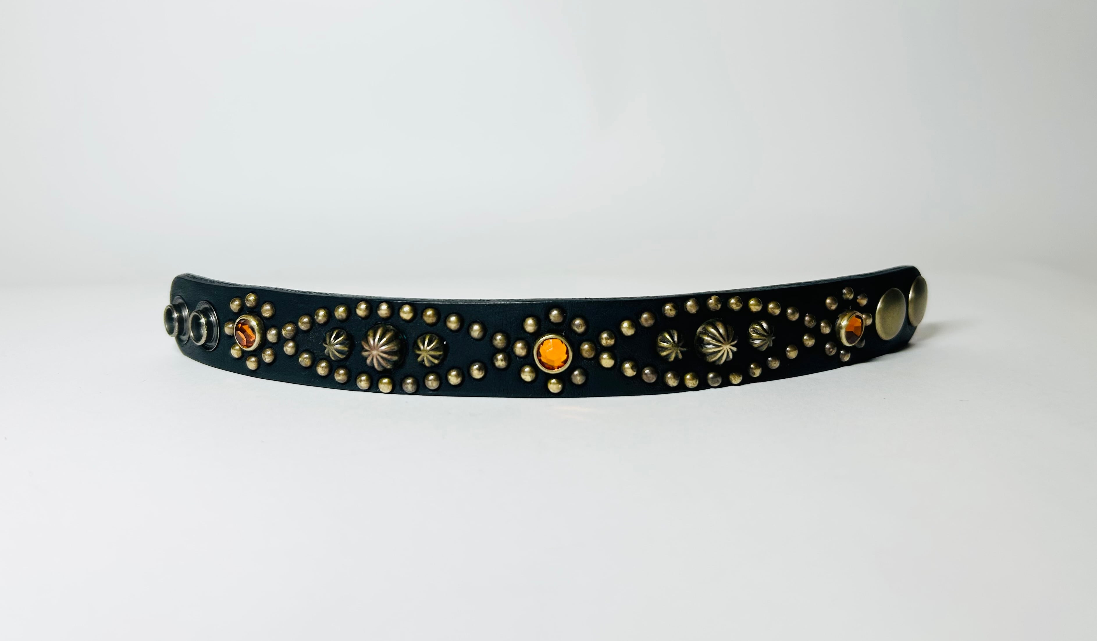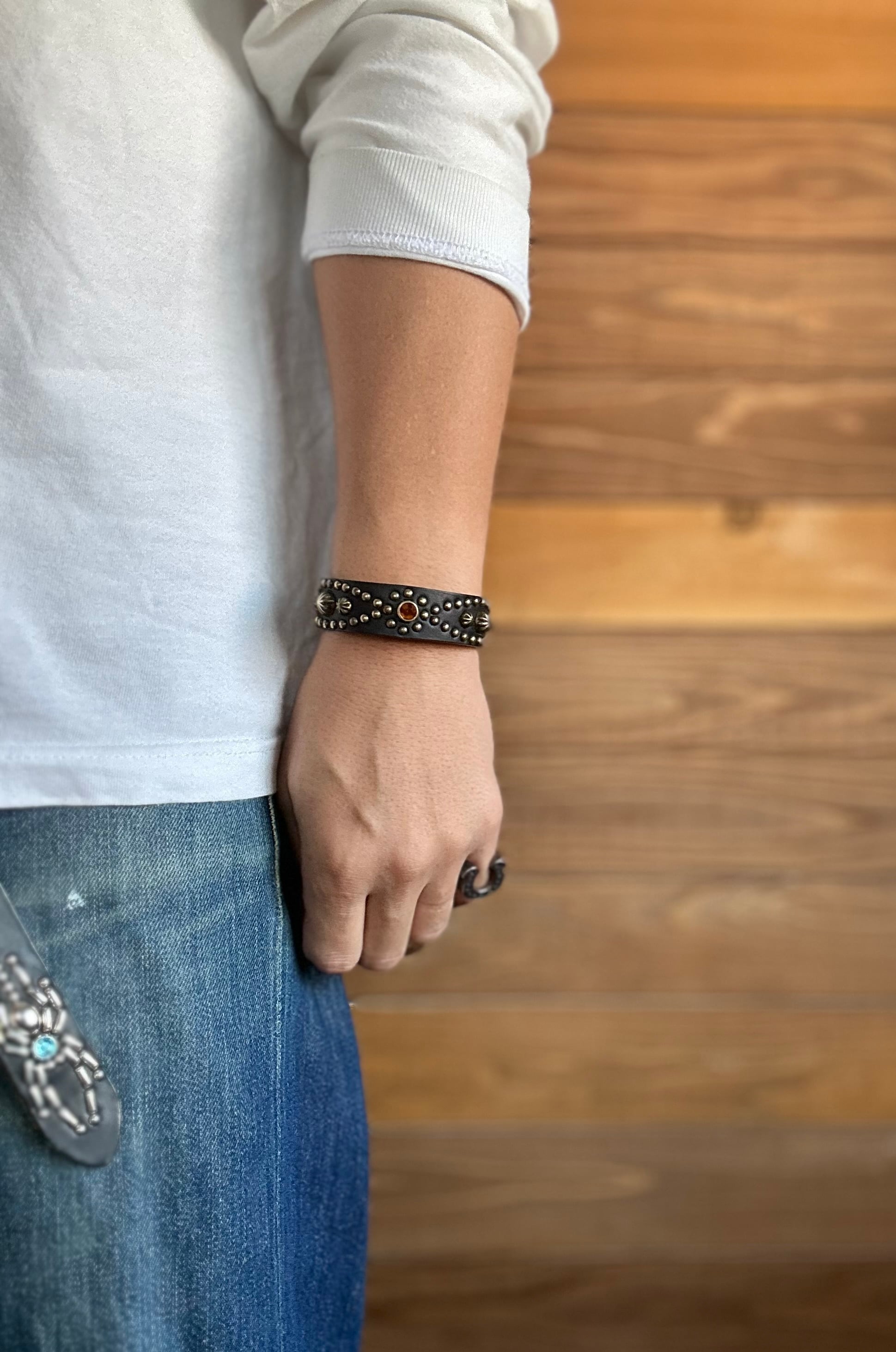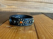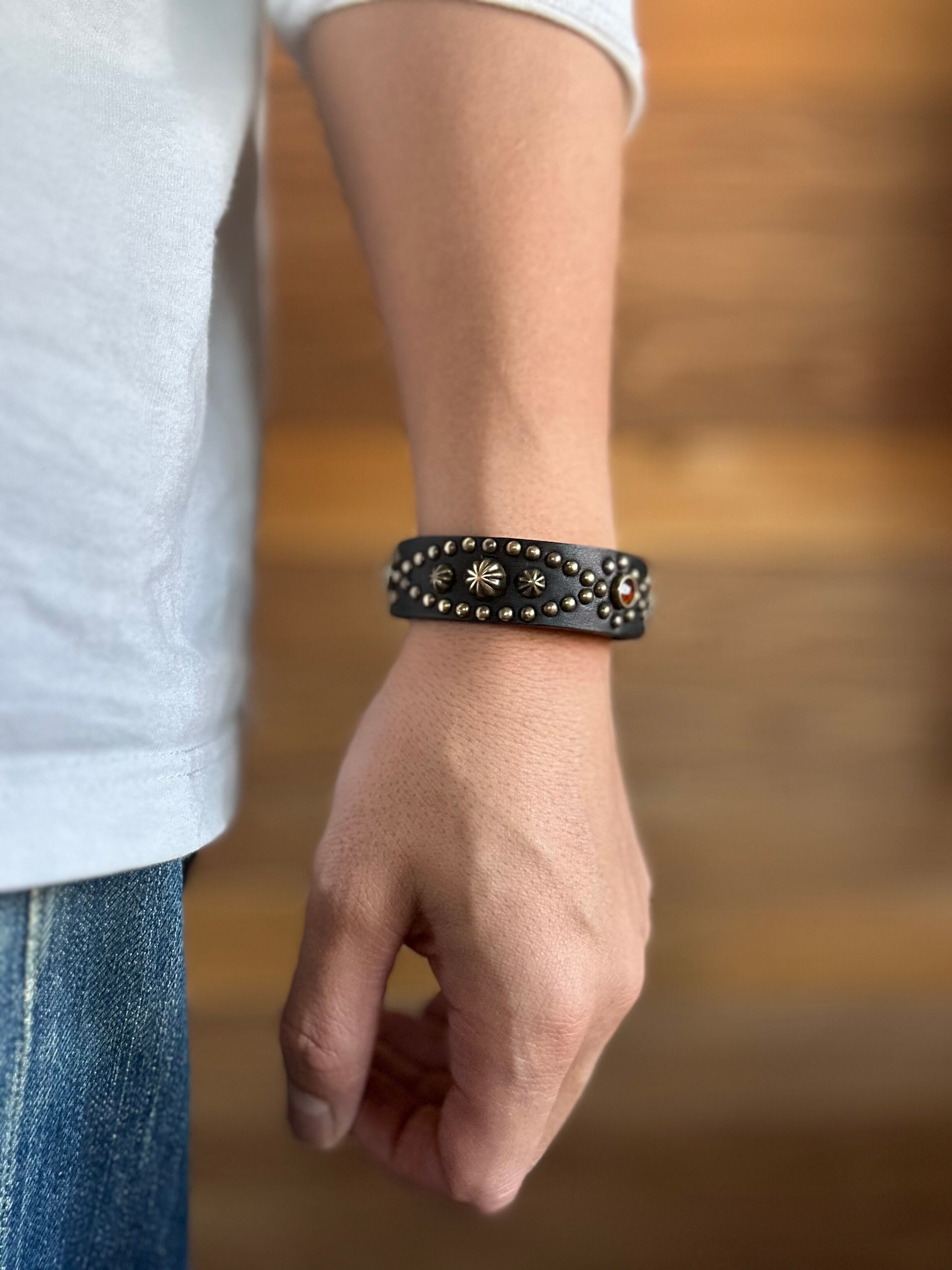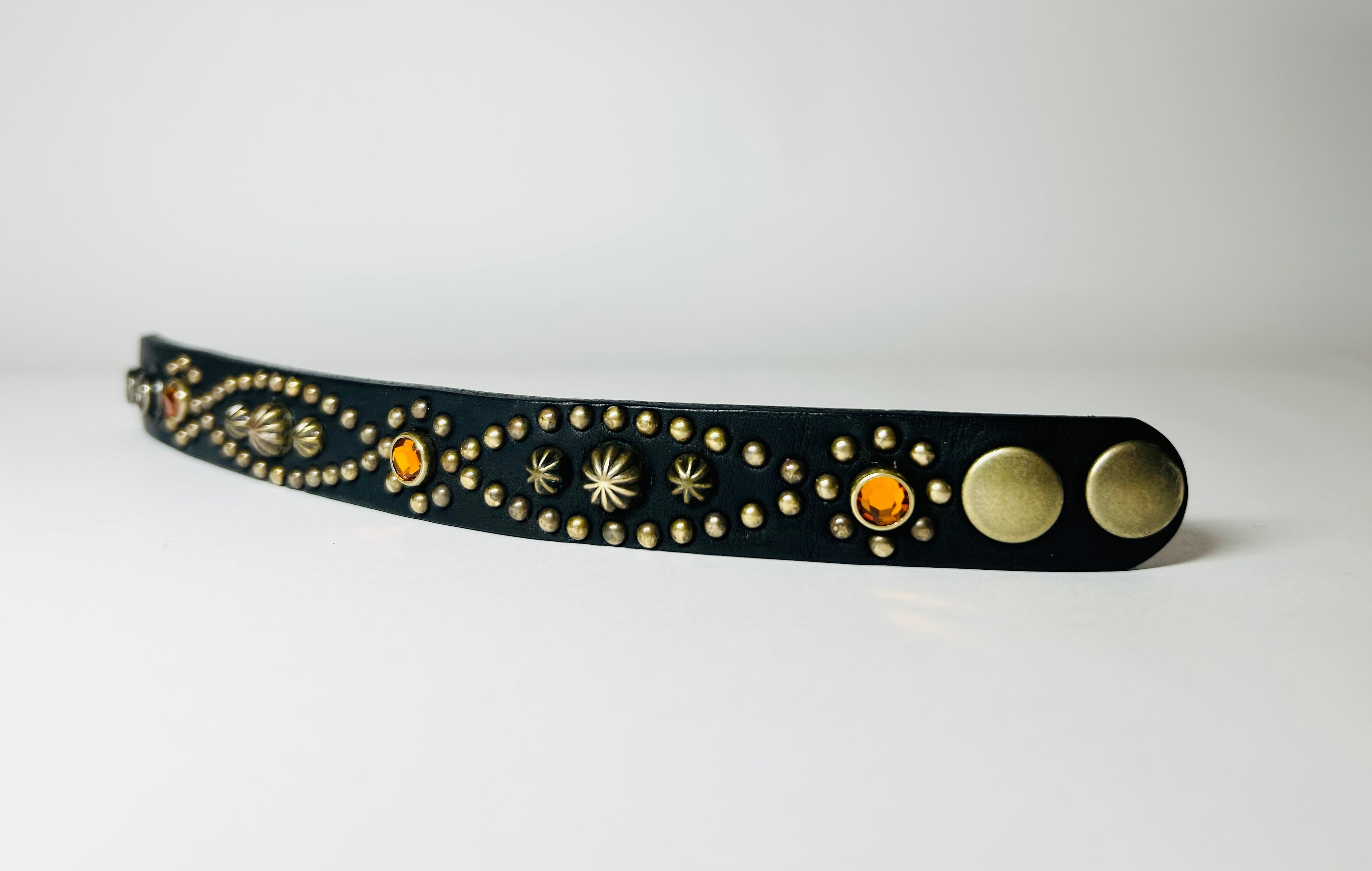 ダブルスナップボタンによりサイズが二段階調整できます。アンティークブラススタッズ使用。