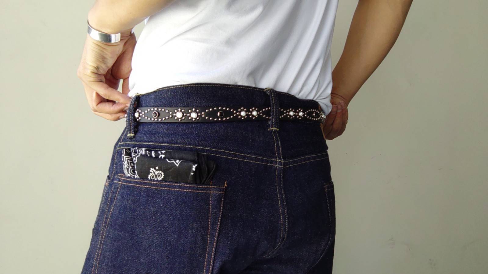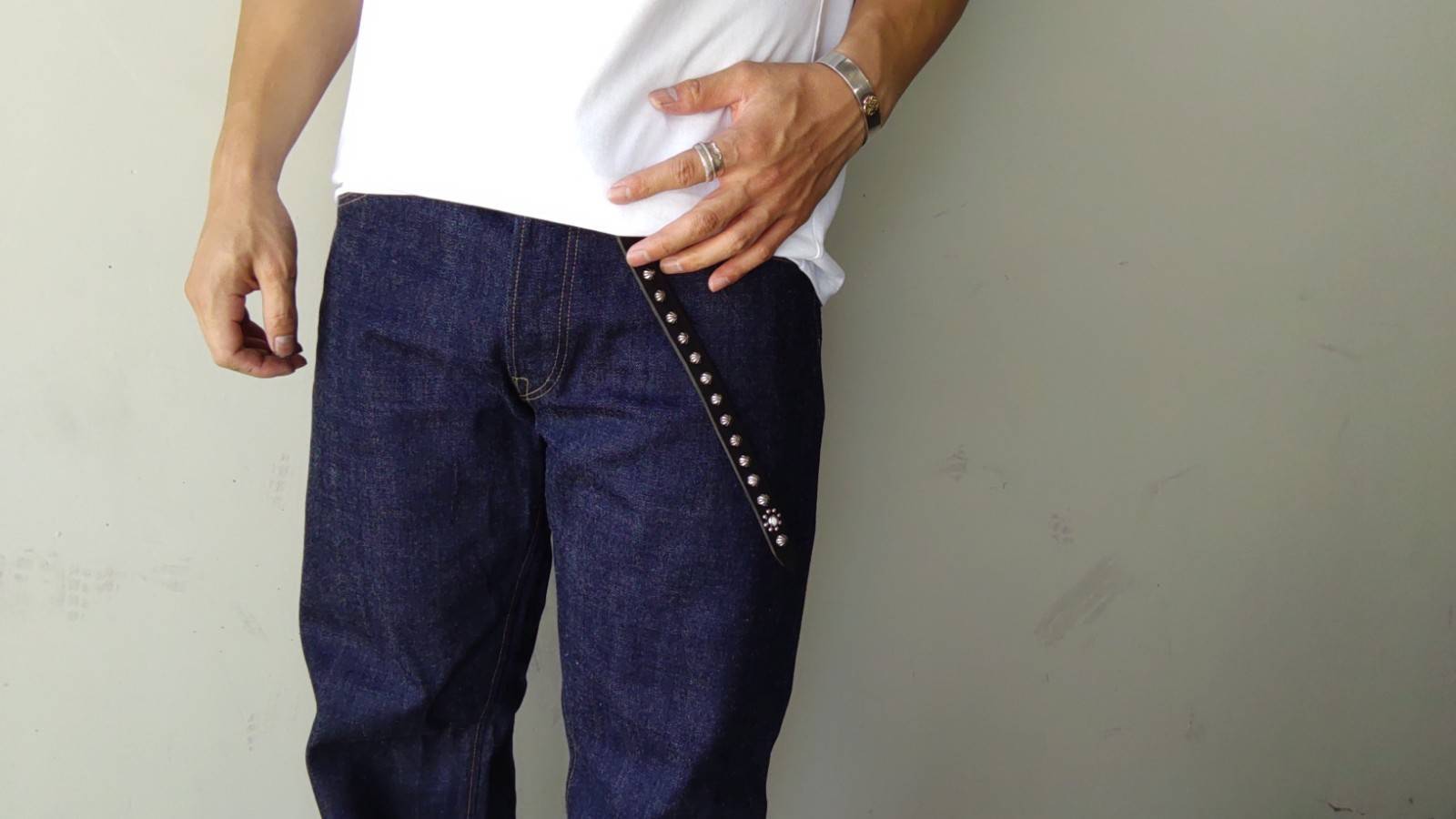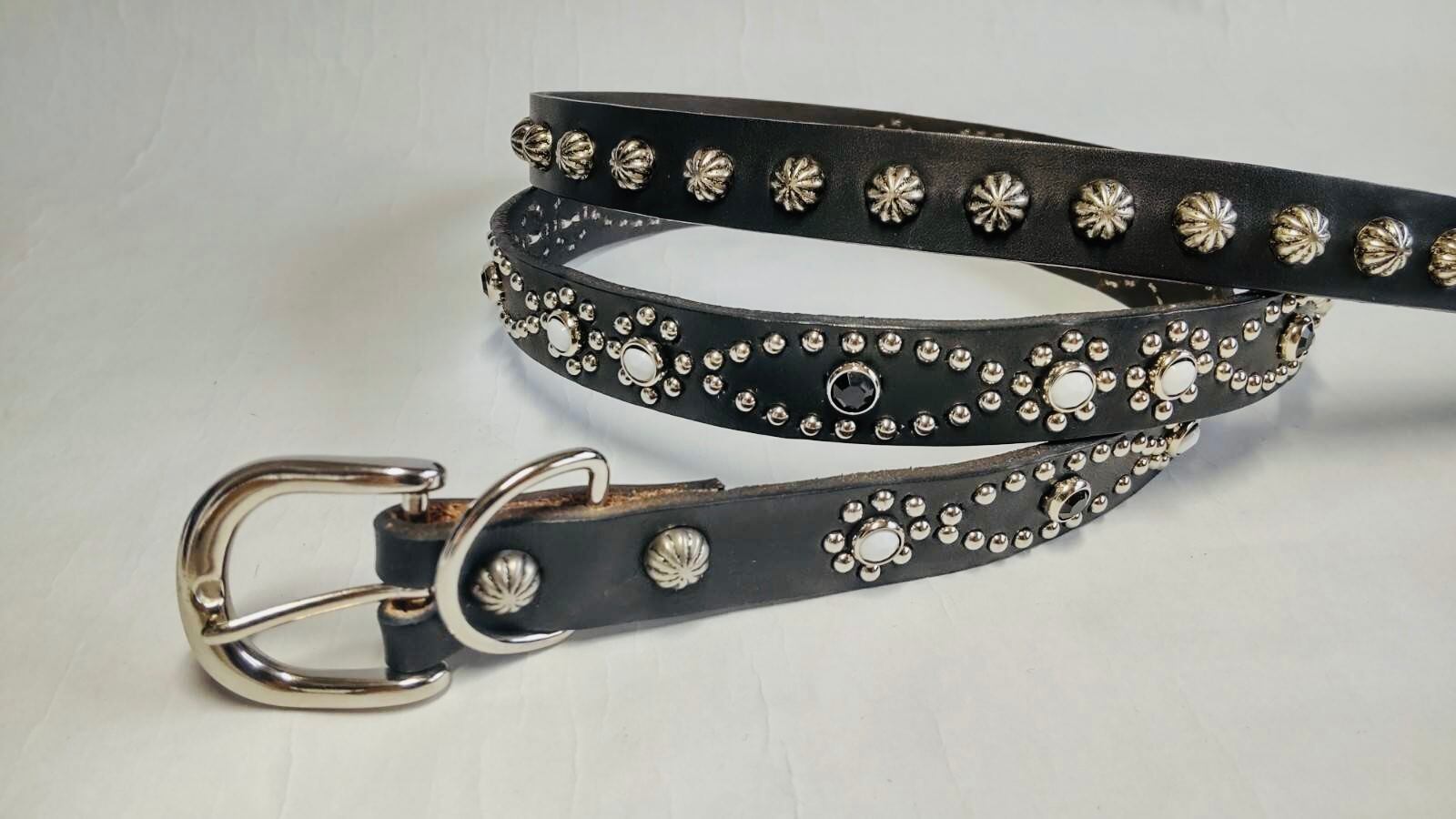 ベルト全体の360度にスタッズを施したナローベルト。胴回りとケンサキで異なるデザインパターンを施しています。