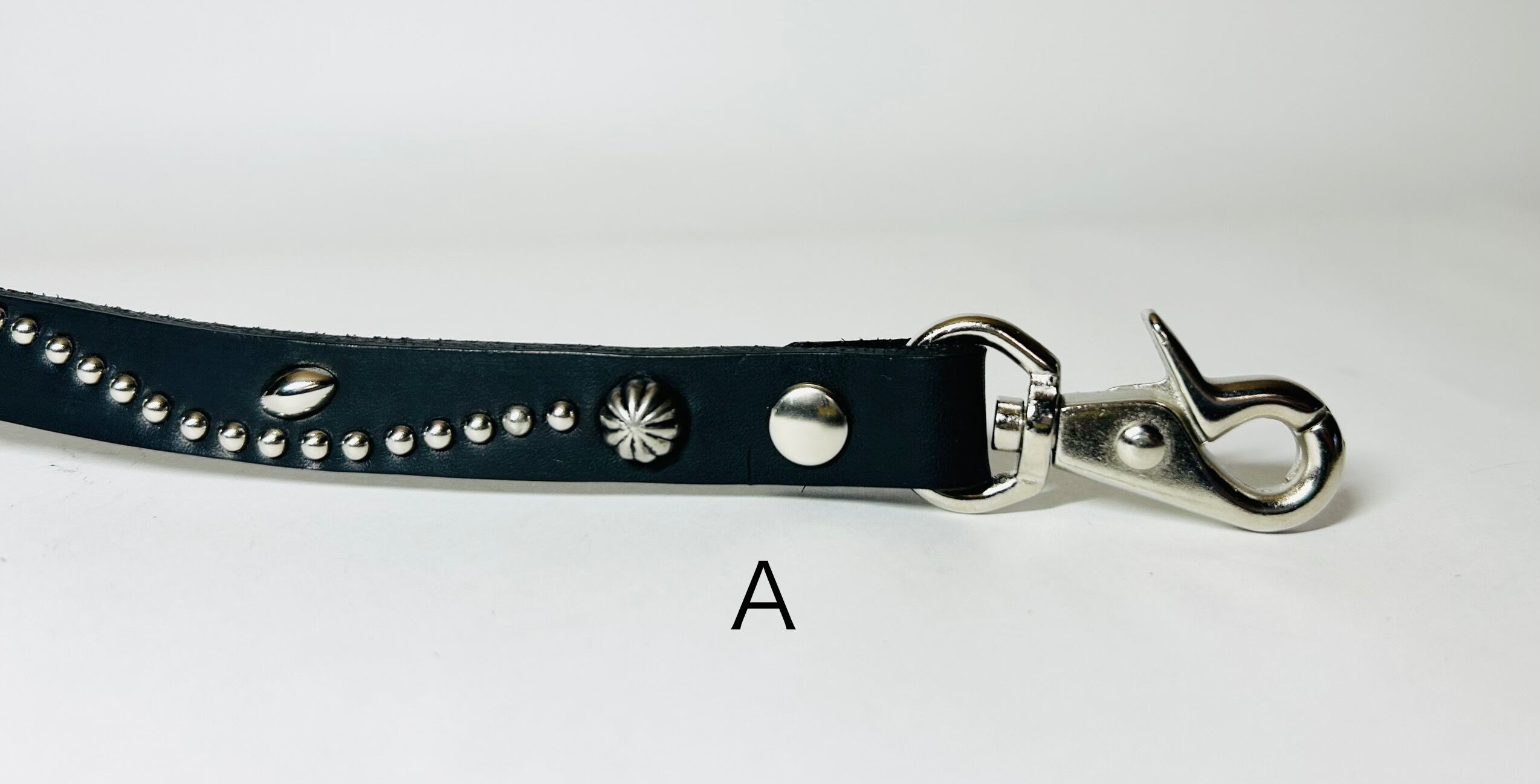 全長約30センチのウォレットコード。トップスを下ろすと見えなくなるショートサイズ。ロングキーリングとしても使用可能です。A:レバー式ナスカン(2箇所)への変更が可能です。※オプションより選択下さい。