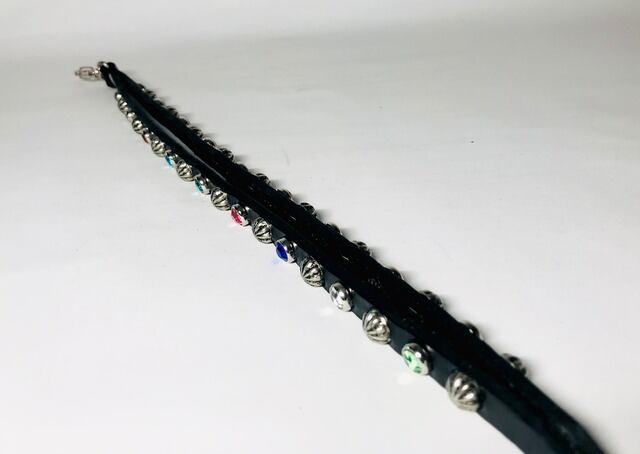 7色9個のストーンとビッグアポロスタッズを両面に施した全長約36cmのロングタイプのキーリング。金具に回転ナスカンを使用する事で裏表が自由に動き簡単に取り外す事が可能です。