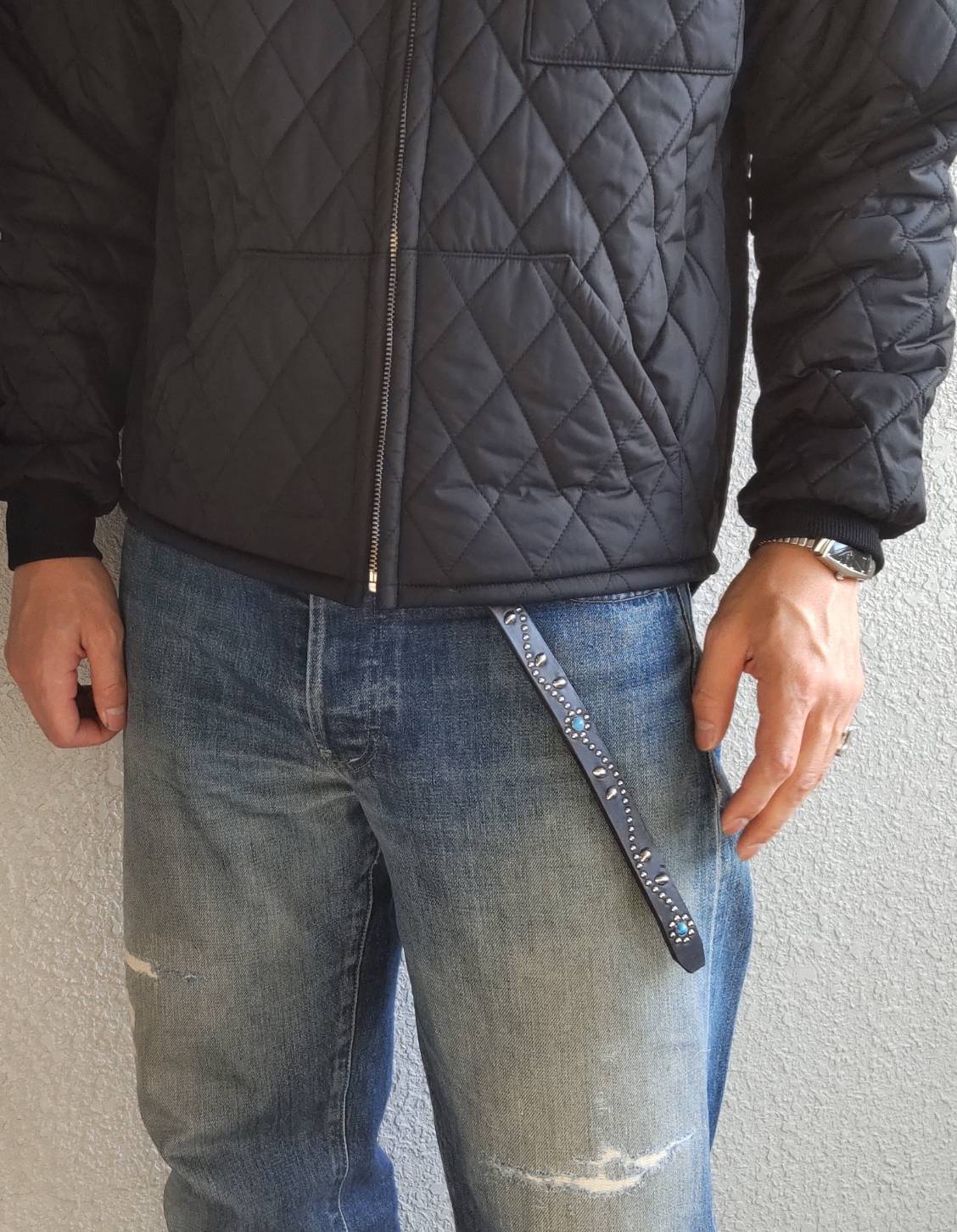 ウエスタンバックルを採用しベルト全体にチューリップパターンを施したナローベルト。バックルの留め具がスナップボタン式ですのでバックルの取り外しが可能です。