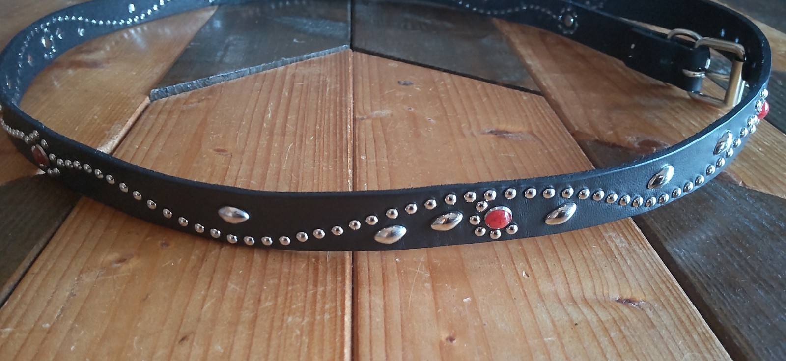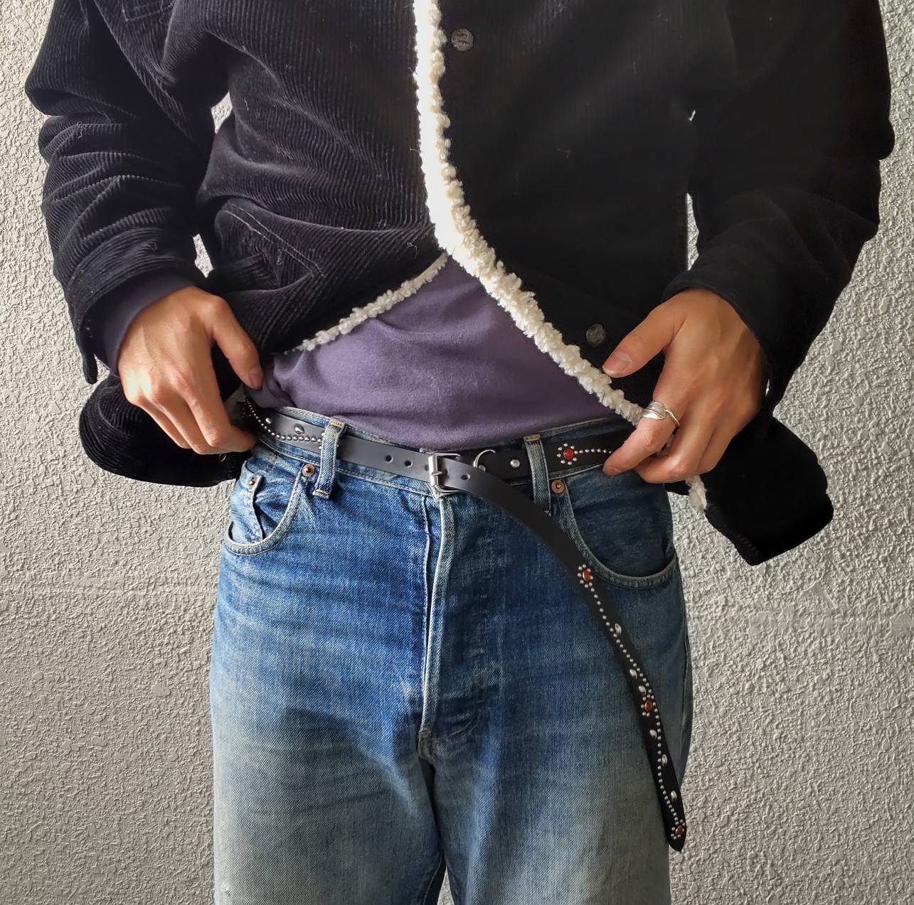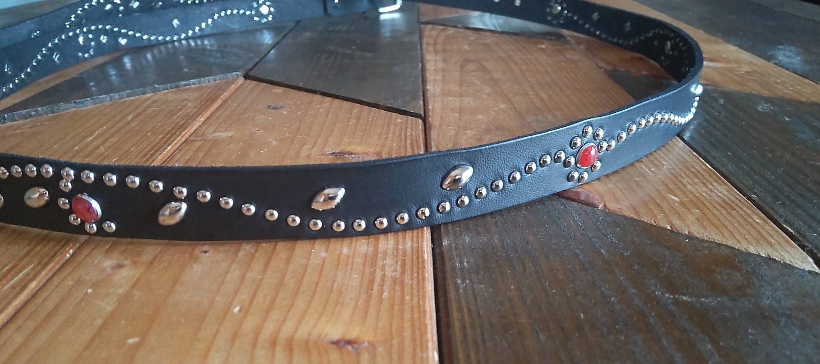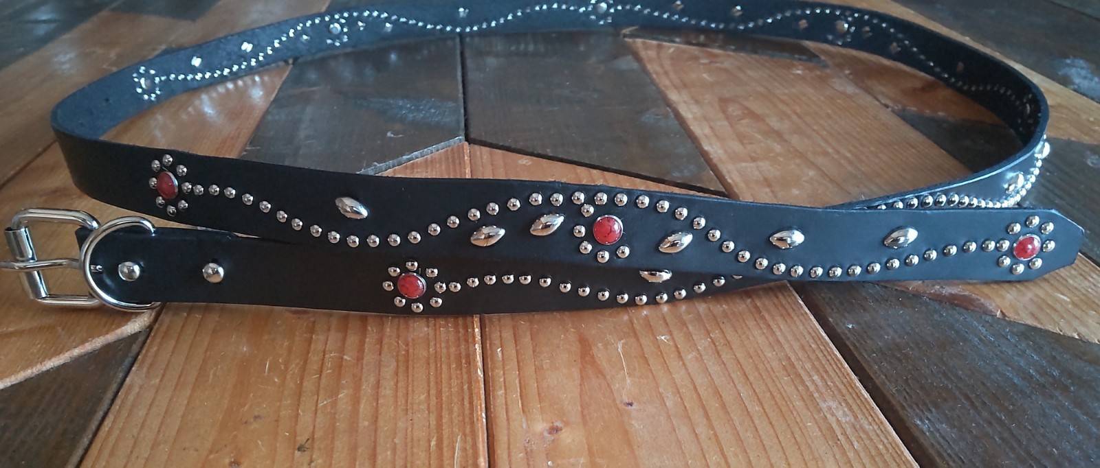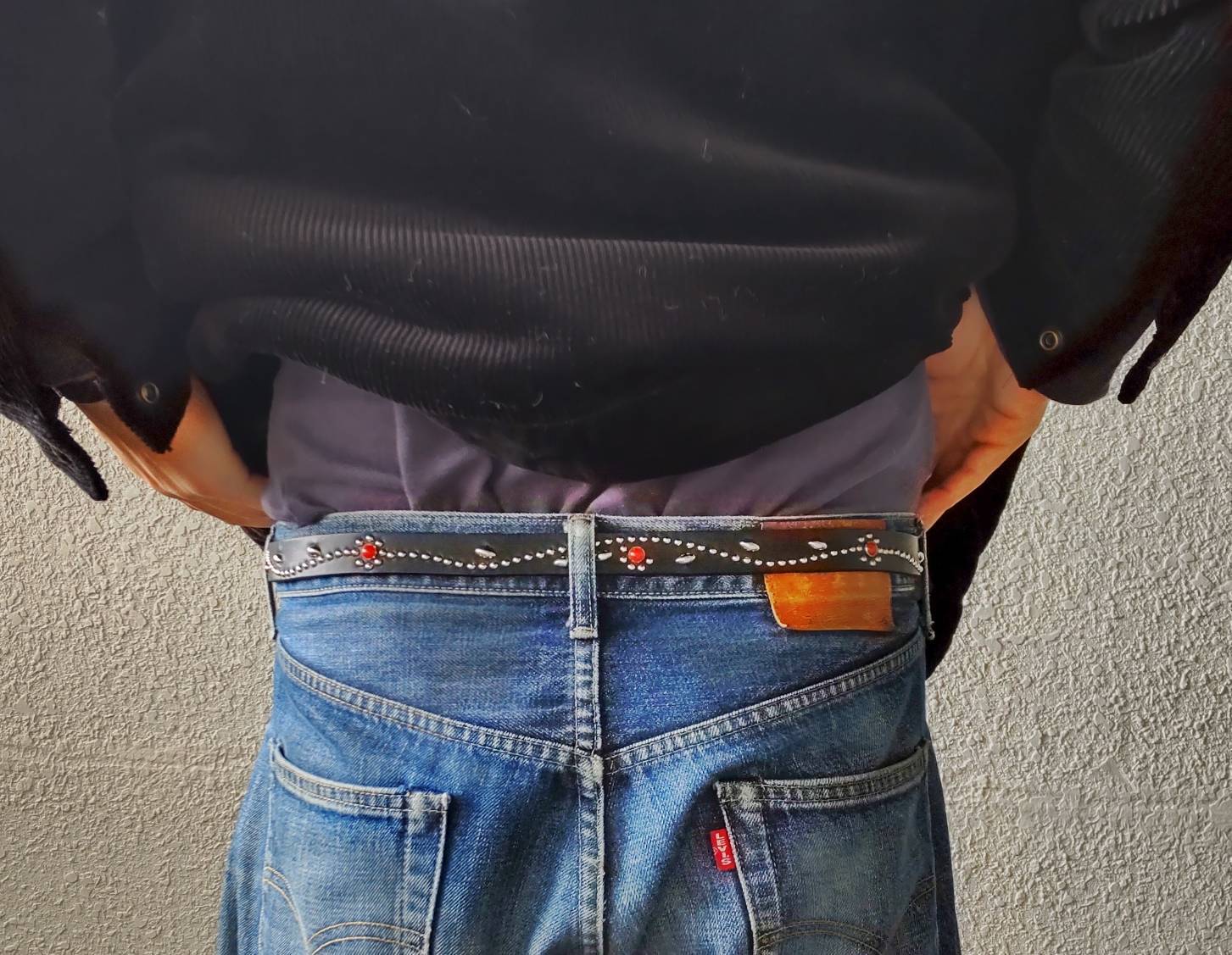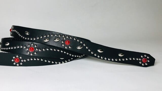 ベルト全体の360度にスタッズを施したナローベルトです。レッドマーブルカラースタッズを使用。