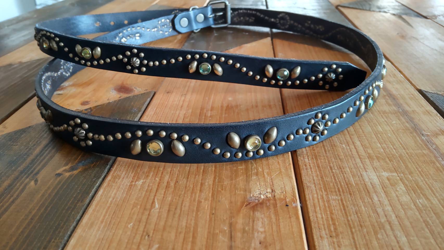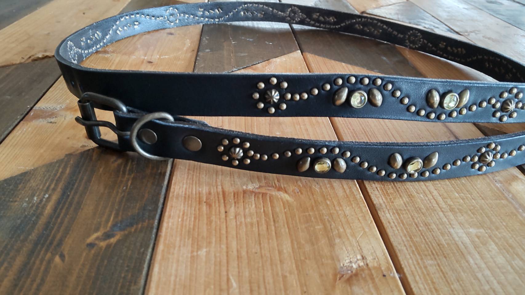 ベルト全面の360度にチューリップフラワーパターンを表現したナローベルト。スタッズ、バックル金具、全てアンティークブラスを使用したALLBRASSモデル。バックルの留め具がスナップボタン式ですのでバックルの取り外しが可能です。