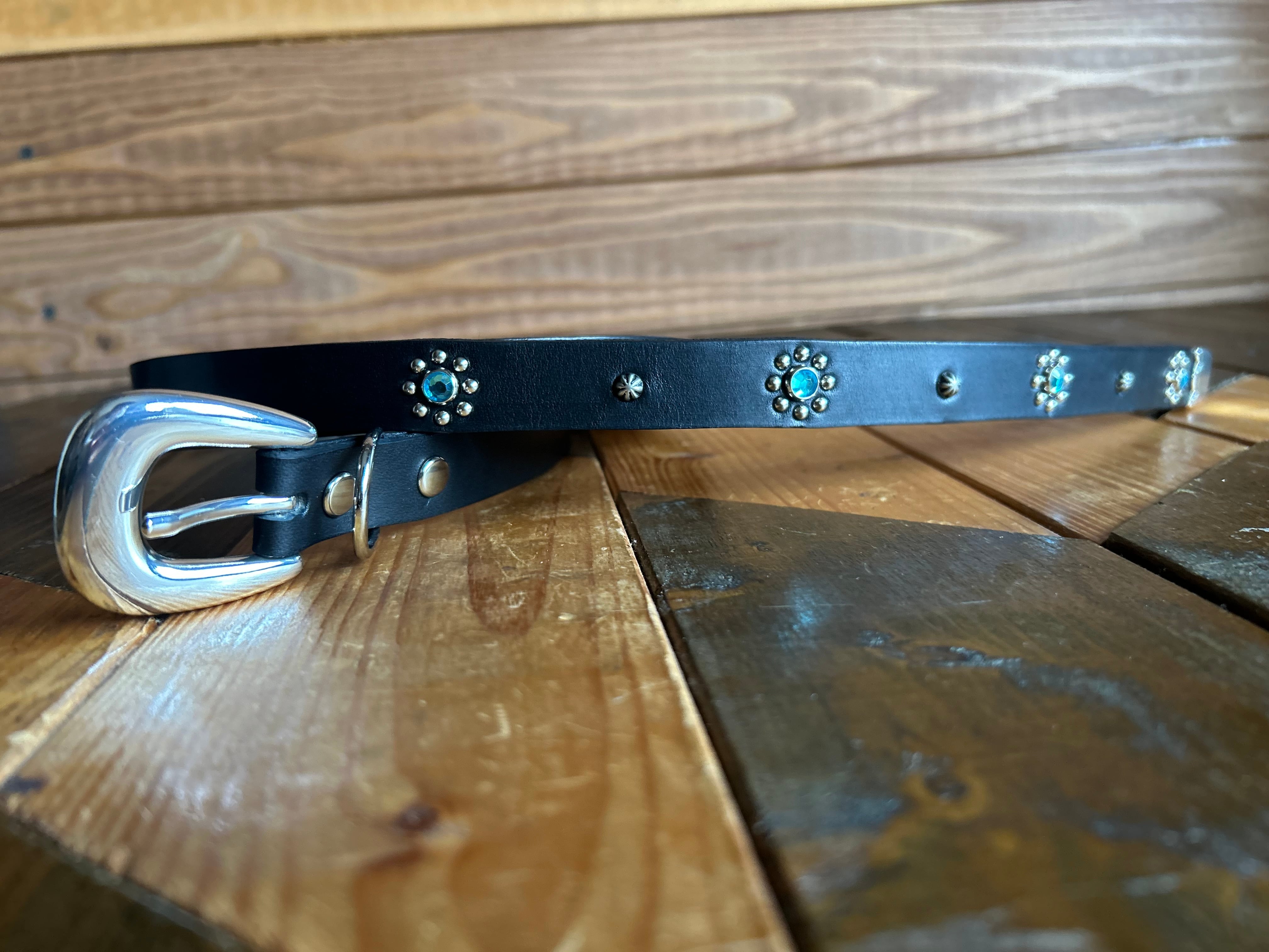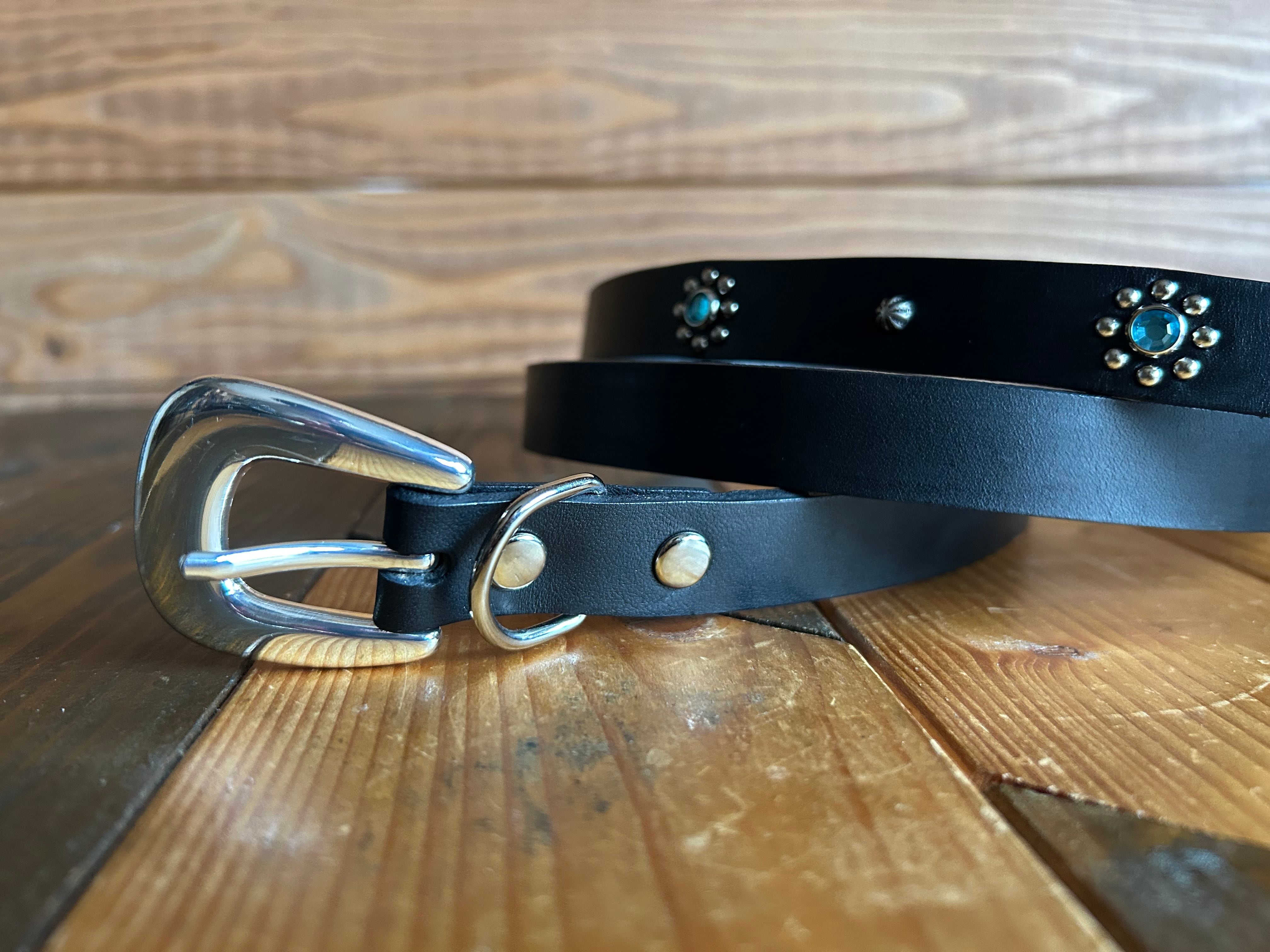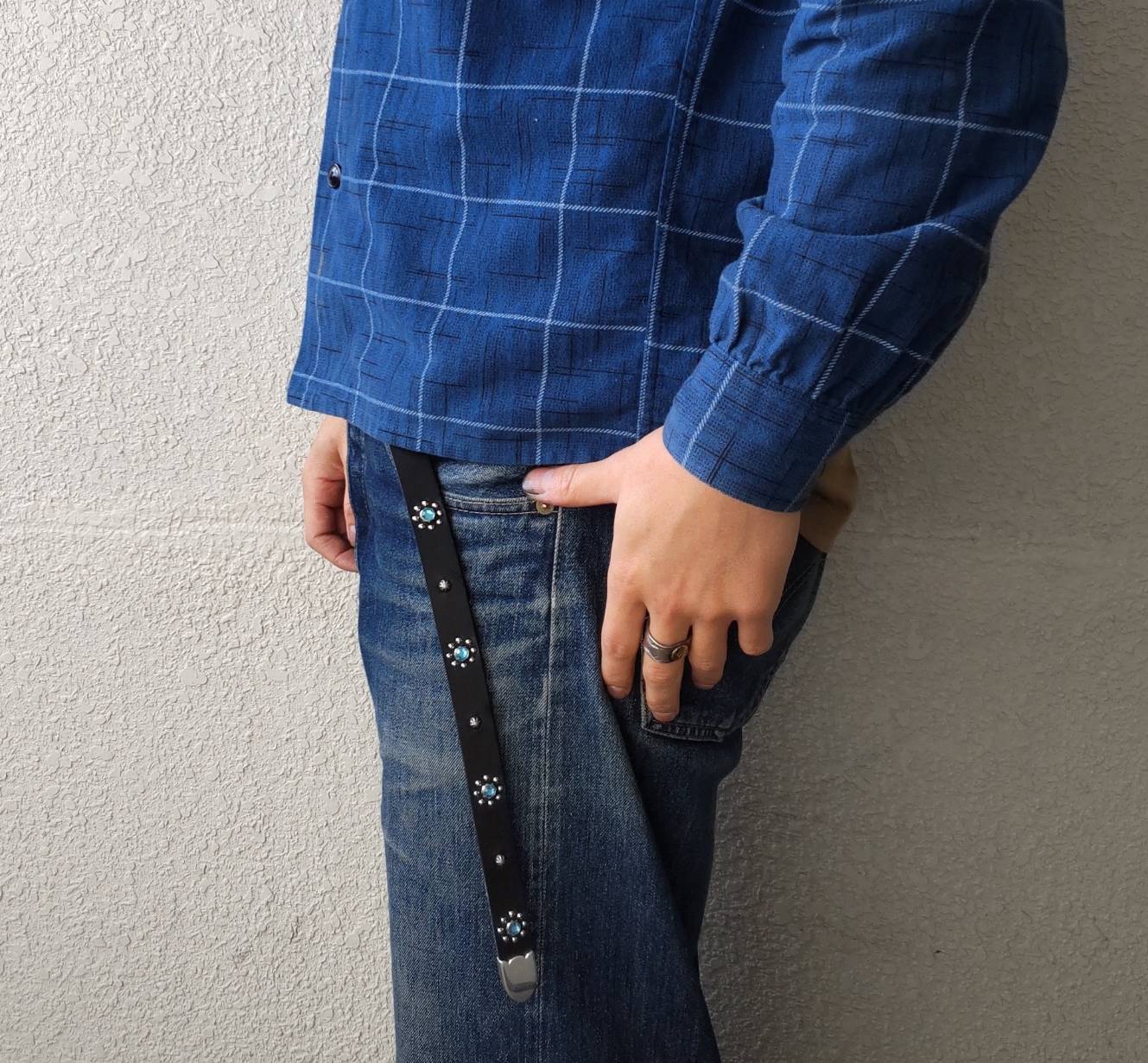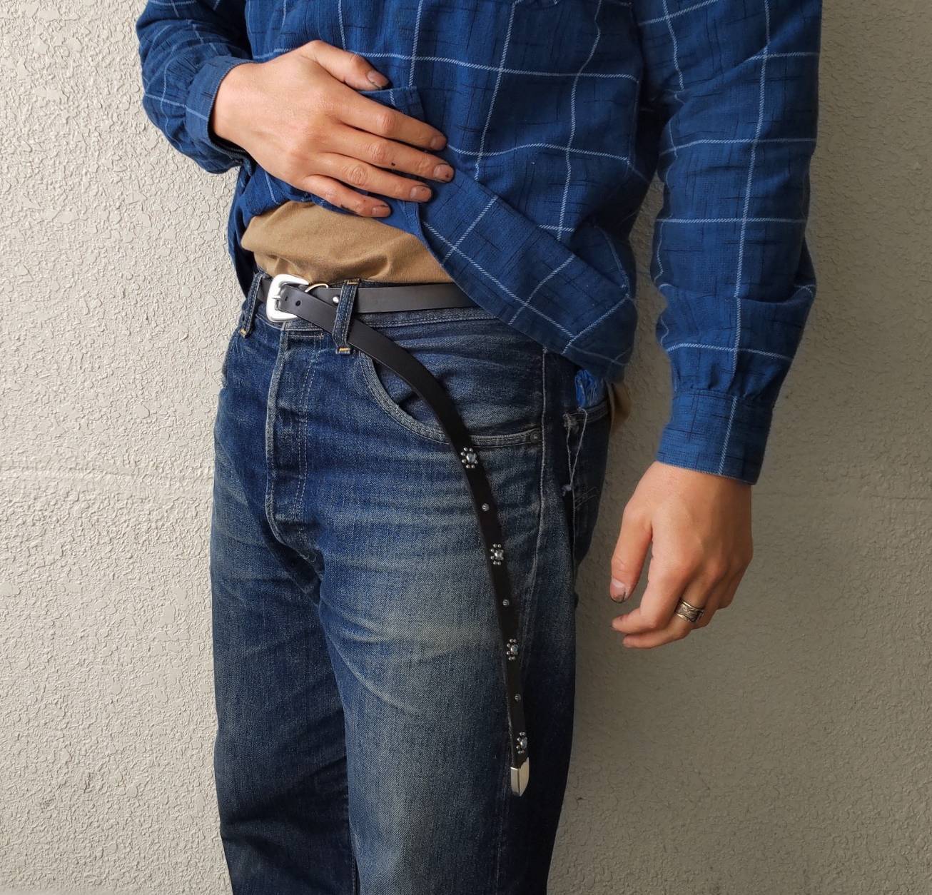 剣先金具、ウエスタンバックルを採用し、ケンサキのみにスタッズを施したウエスタンナローベルトです。ケンサキが45センチのため様々な着こなしが可能です。着用画像はクラシックノットスタイル、パンツのベルトループ一つ目にベルトを通した場合、パンツのベルトループに通さず垂らした場合の3通りの着こなしを載せています。※バックルの留め具がスナップボタン式ですのでバッグルの取り外しが可能です。サークル同士の間隔は8cm,