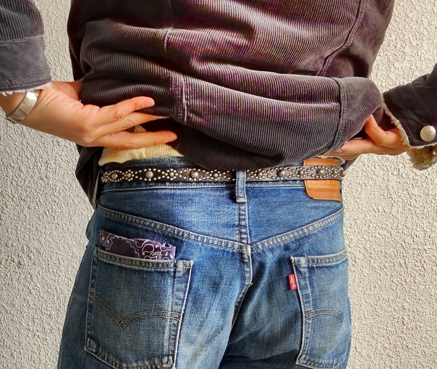 ベルト全体の360度にスタッズを施したナローベルト。バックルの留め具はスナップボタン式ですのでバックルの取り外しが可能です。