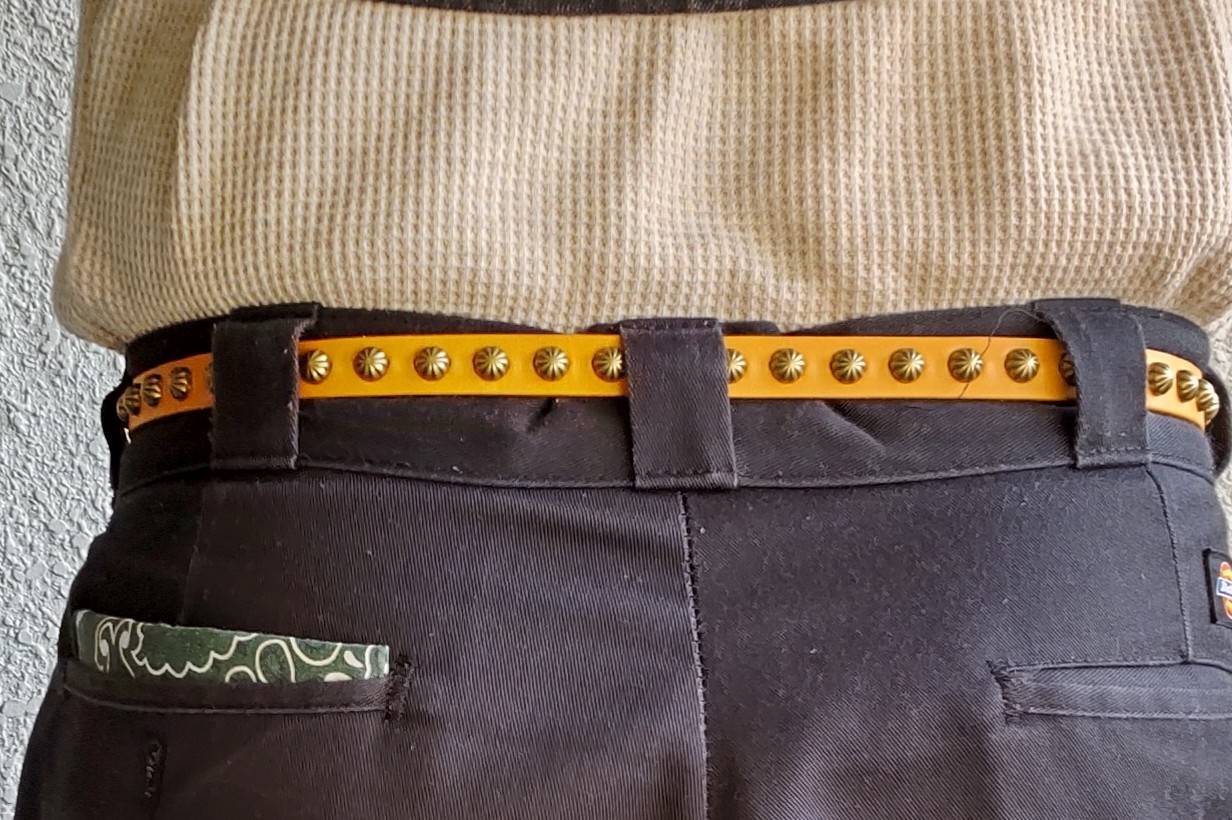 バックル、カシメ、ビックアポロスタッズをすべて【アンティークブラス】で施したナローベルト。バックルの留め具がスナップボタン式でバックルの取り外しが可能です。ライトブラウンは調光具合で色が異なって見えます。特にホワイトバックでは光が反射しますので、革色が異なって見えますが実際の色は画像13〜最後が近い色です。