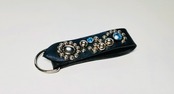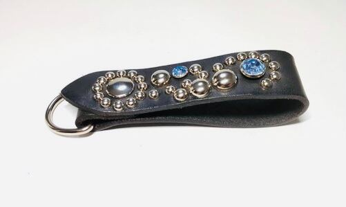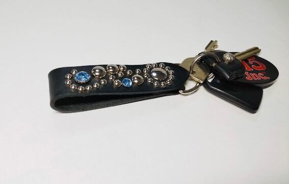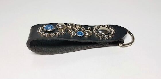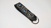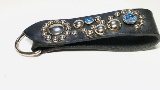 波打ち際の泡をイメージして大中小のラウンドスタッズと大小のクリスタルブルースタッズを使用したキーリング。