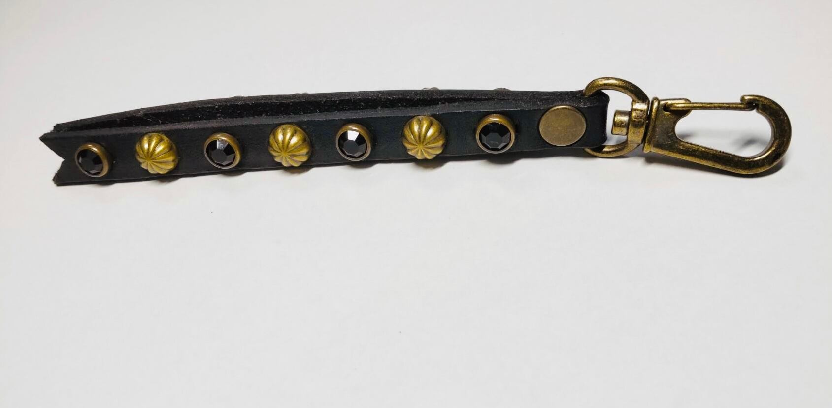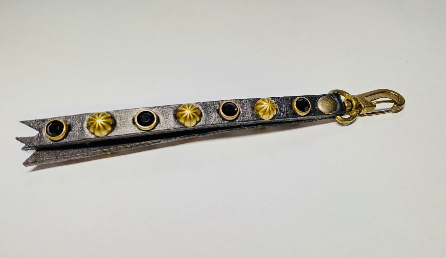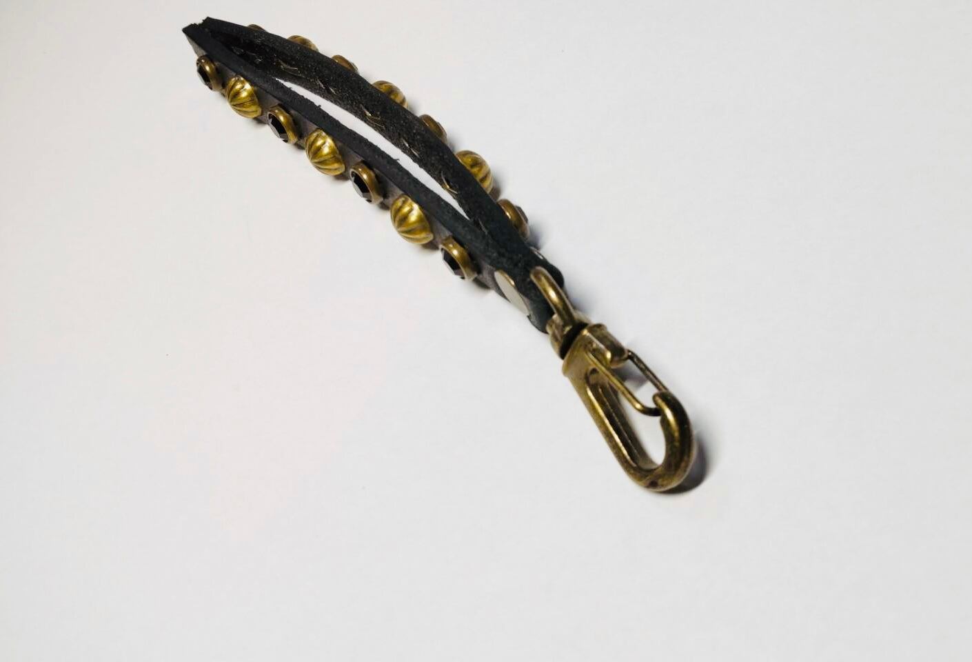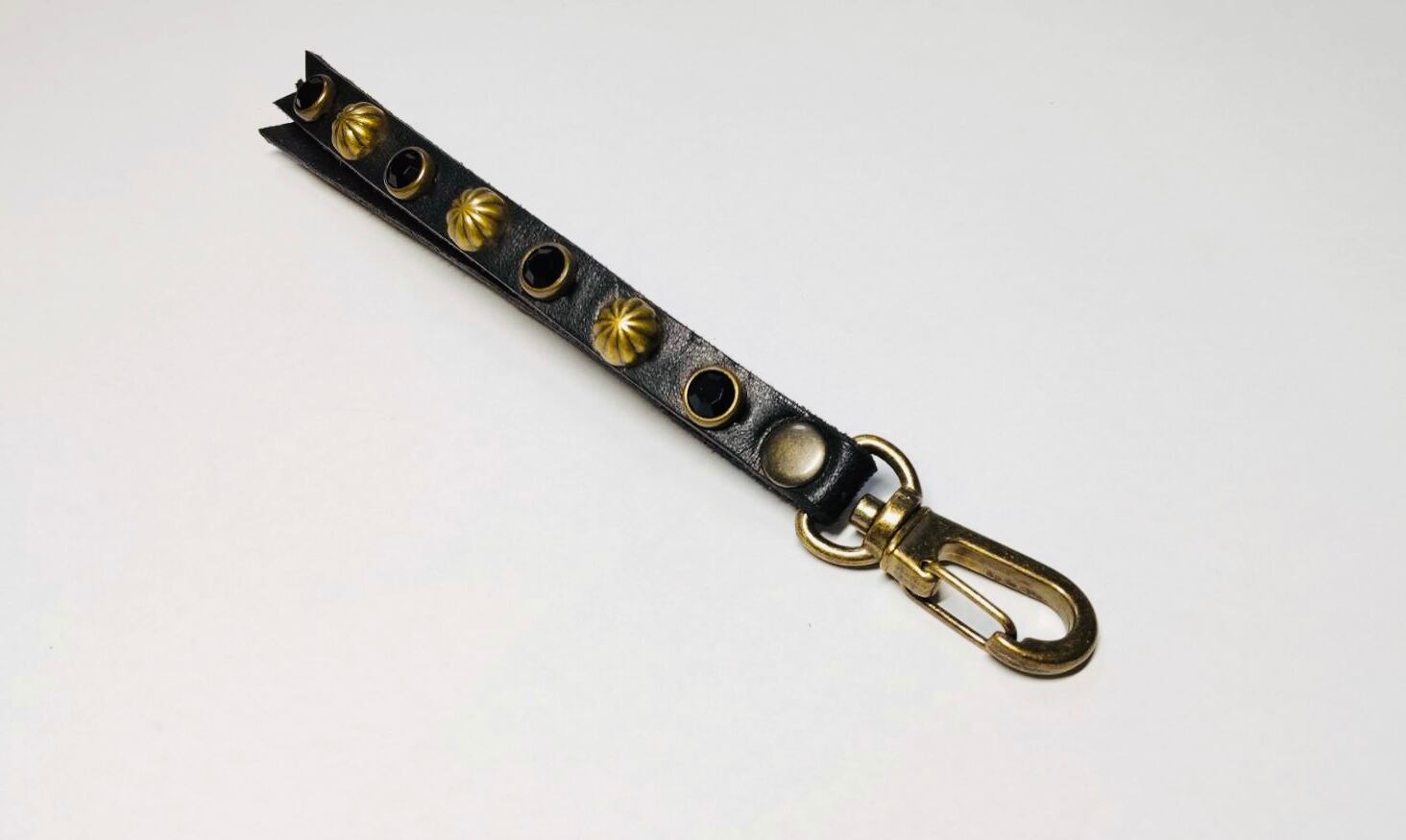 ブラス枠のブラックカラーストーンとビッグアポロを両面に施したリバーシブルスタッズのキーリングとなります。金具に回転ナスカンを使用する事で裏表が自由に動き簡単に取り外す事が可能です。