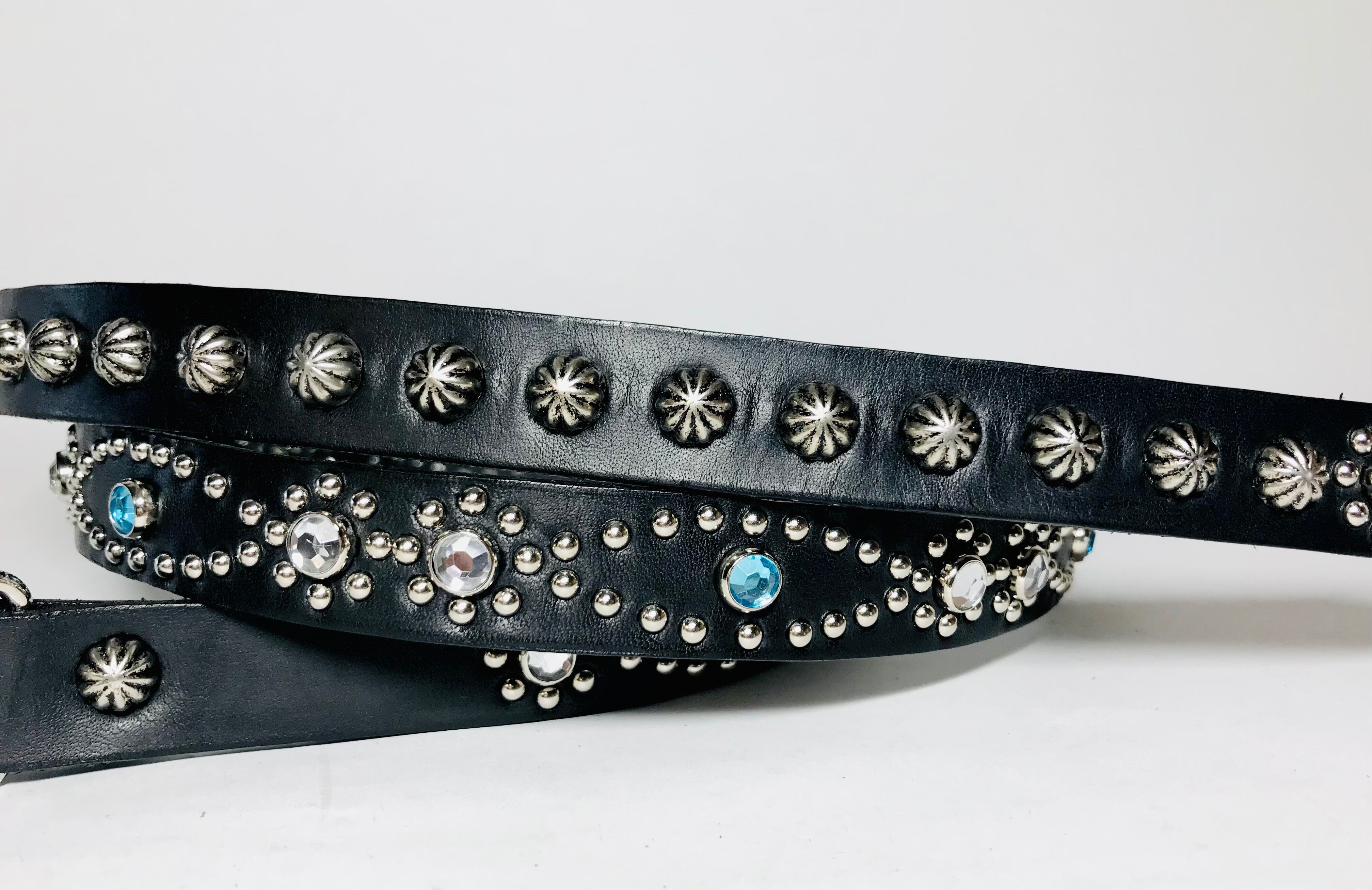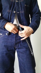 ベルト全体の360度にスタッズを施したナローベルト、胴回りとケンサキで異なるデザインパターンとなっています。着用画像のベルトはスーパーナロー、ケンサキシャープです。オプションよりスーパーナローを選択すると【クラシックノットスタイル】での着こなし可能です。詳しくは当ホームページ【BLOG】をご覧下さい。