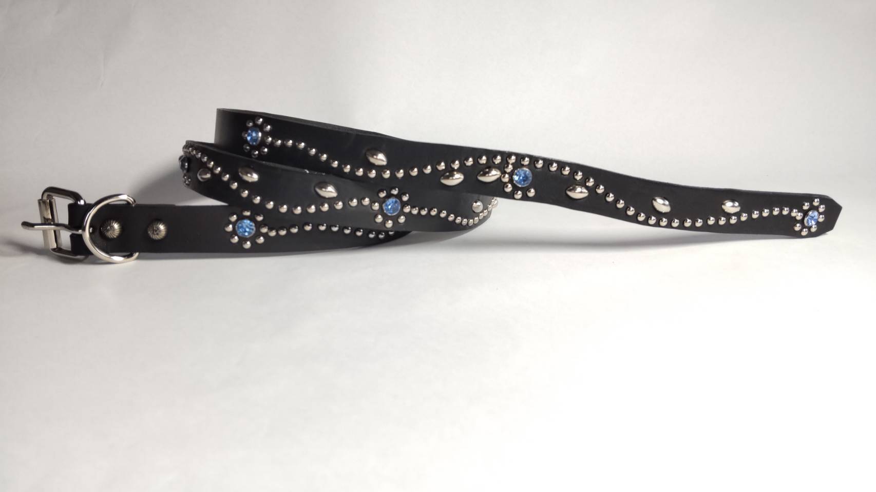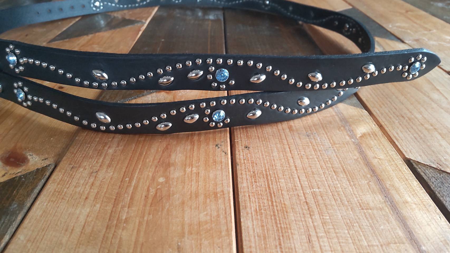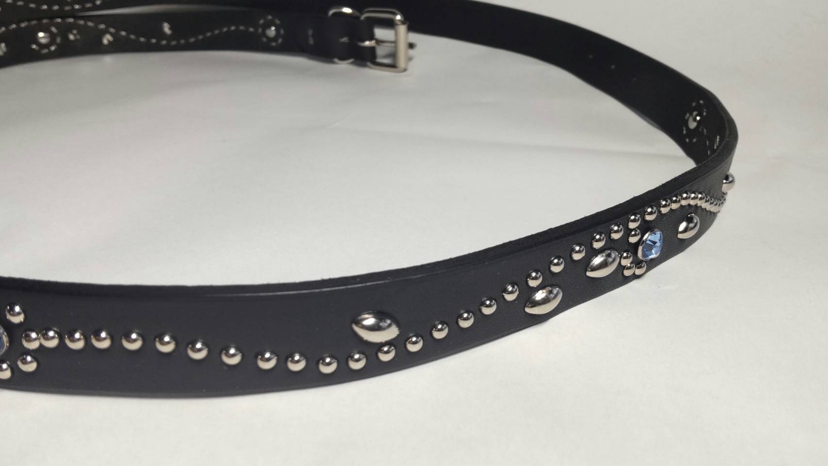 ベルト全面の360度にスタッズを施したナローベルト。クリスタルブルースタッズを使用。多面的なカットのクリスタルアクリルストーンは光が当たると美しい輝きを放ちます。ホワイトバック写真は先端スクエア、それ以外の写真は先端シャープです。