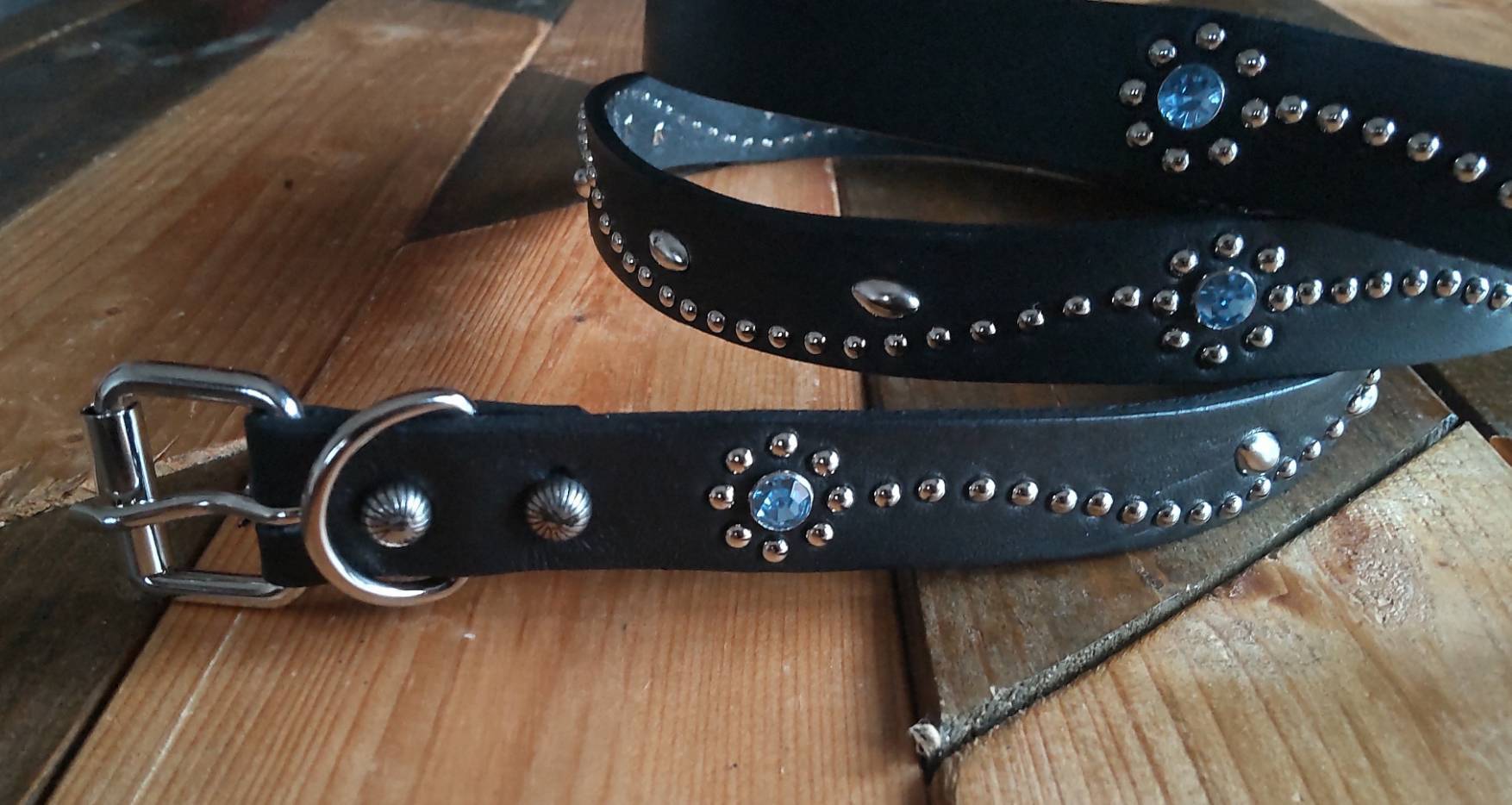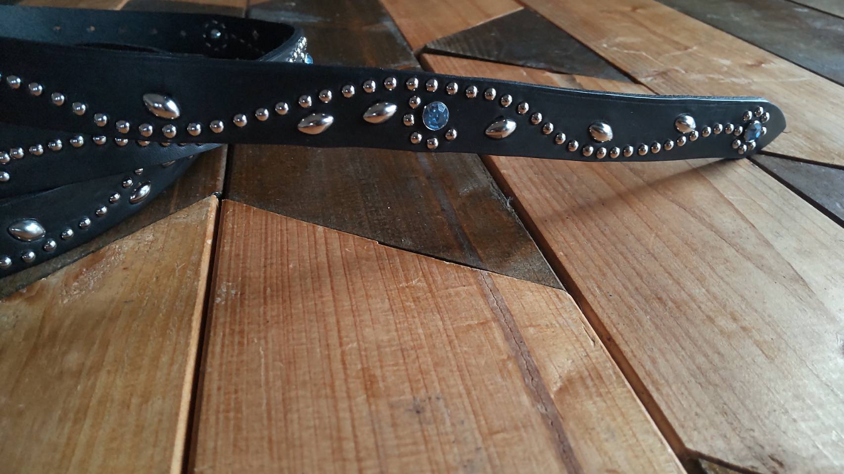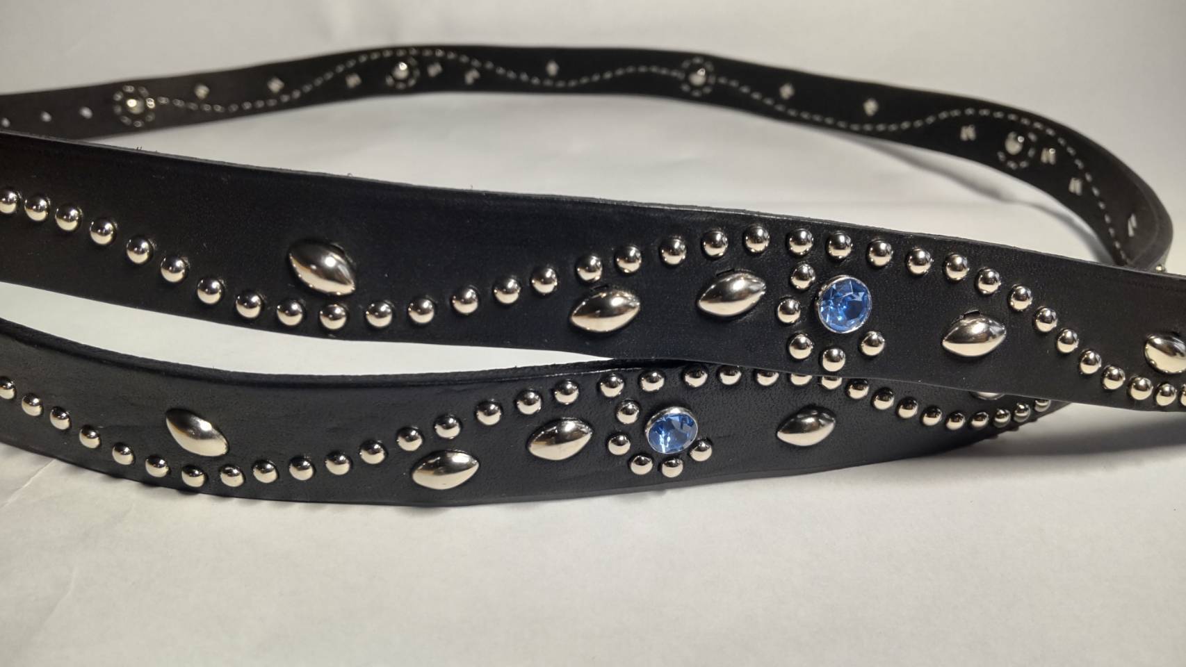 ベルト全面の360度にスタッズを施したナローベルト。クリスタルブルースタッズを使用。多面的なカットのクリスタルアクリルストーンは光が当たると美しい輝きを放ちます。ホワイトバック写真は先端スクエア、それ以外の写真は先端シャープです。