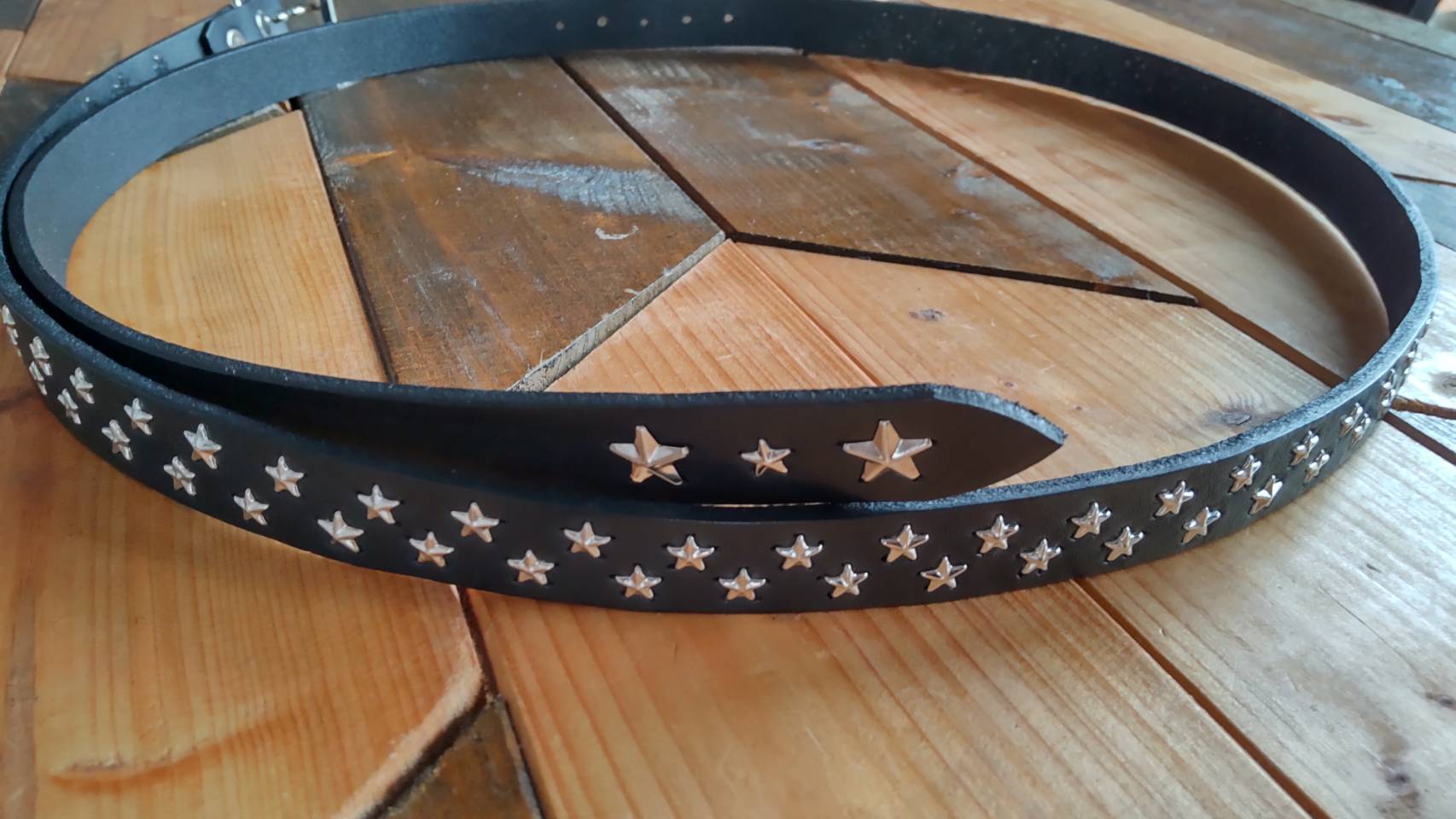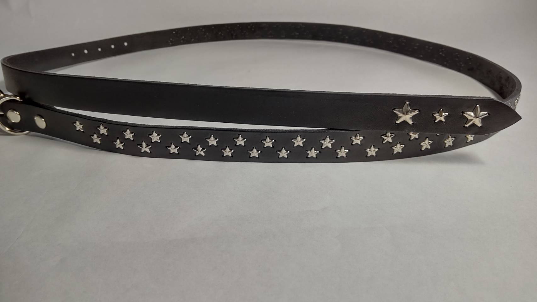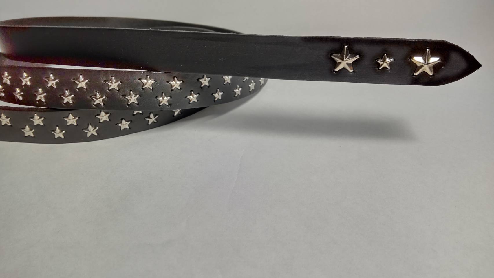 胴回りにスモールスター、ケンサキの一つに大きなスタースタッズを施したナローベルト。バックルを留める金具がスナップボタン式ですのでバックルの取り外しが可能となります。