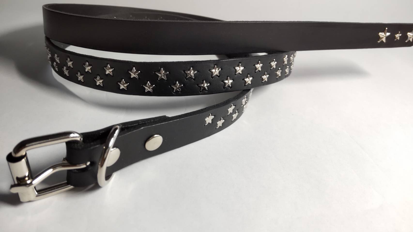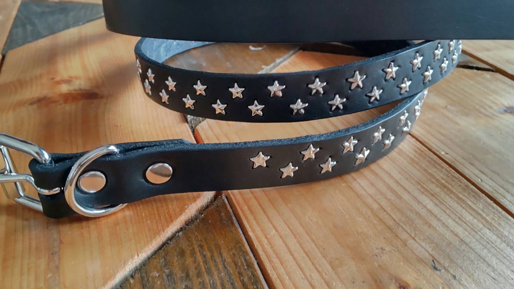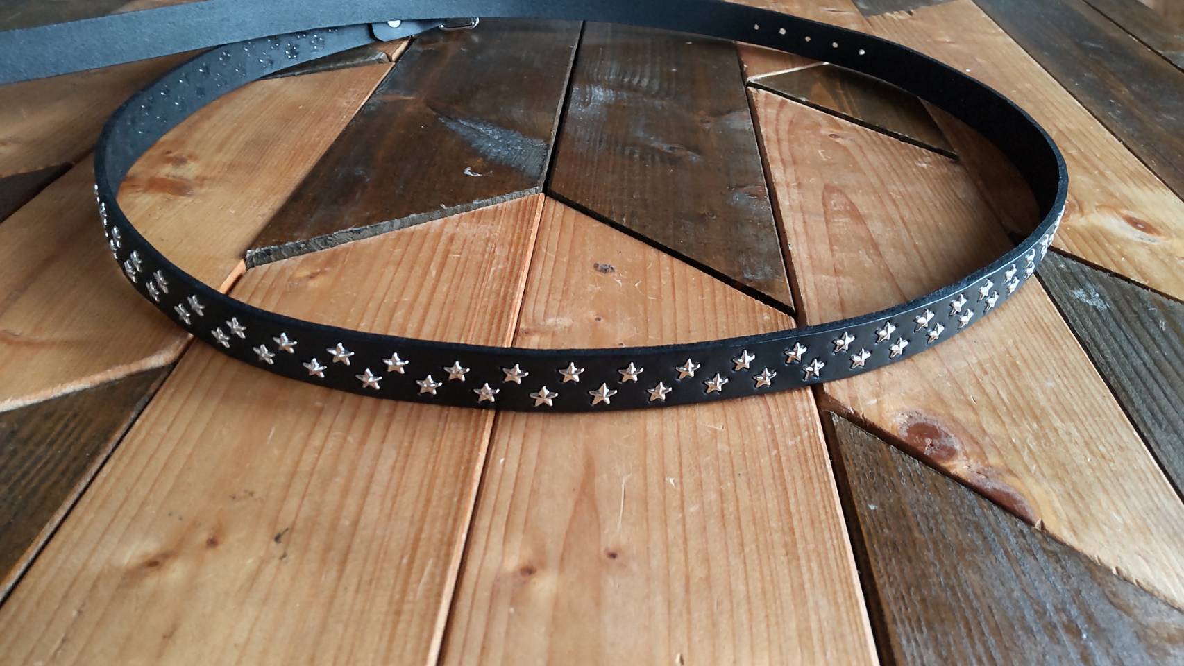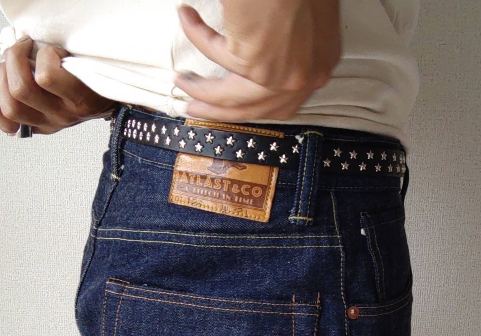 胴回りにスモールスター、ケンサキの一つに大きなスタースタッズを施したナローベルト。バックルを留める金具がスナップボタン式ですのでバックルの取り外しが可能となります。
