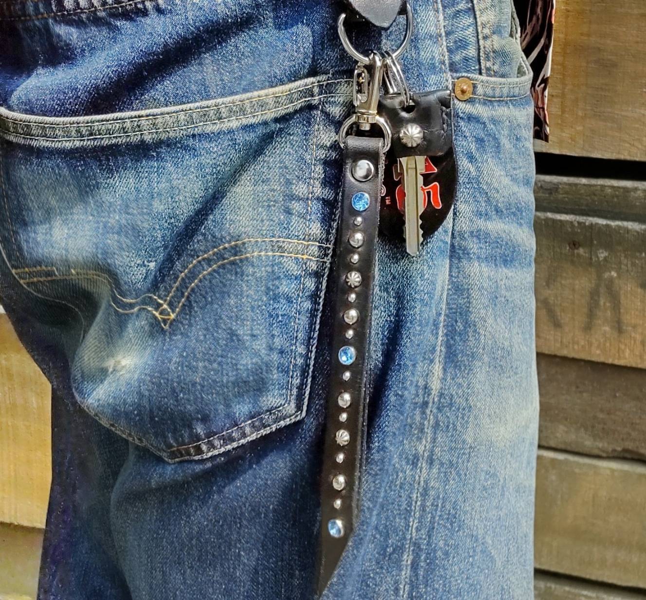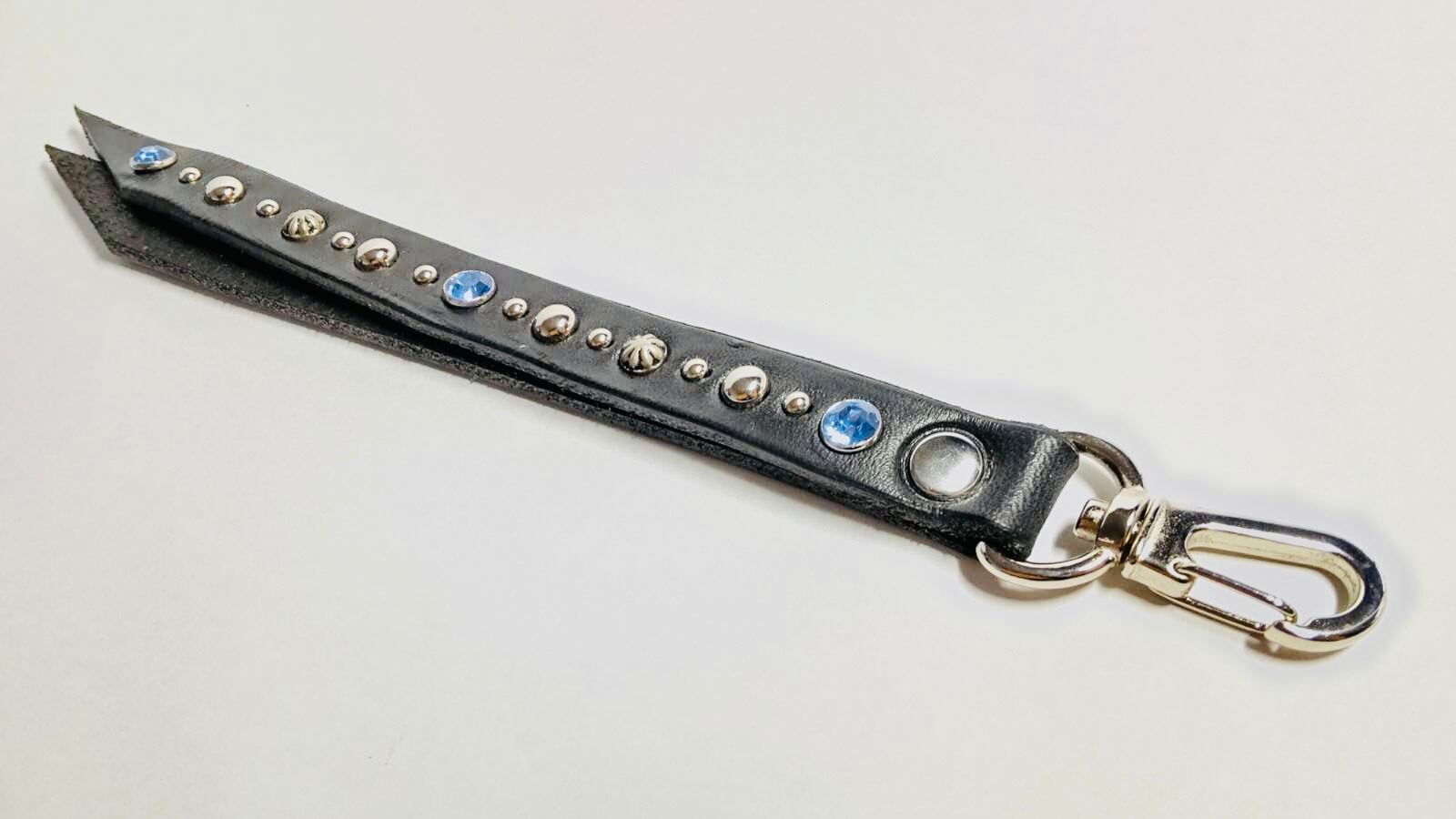 クリスタルブルーストーン、スモールアポロスタッズを片面に施したキーリング。多面的なカットのクリスタルアクリルストーンは光が当たると美しい輝きを放ちます。