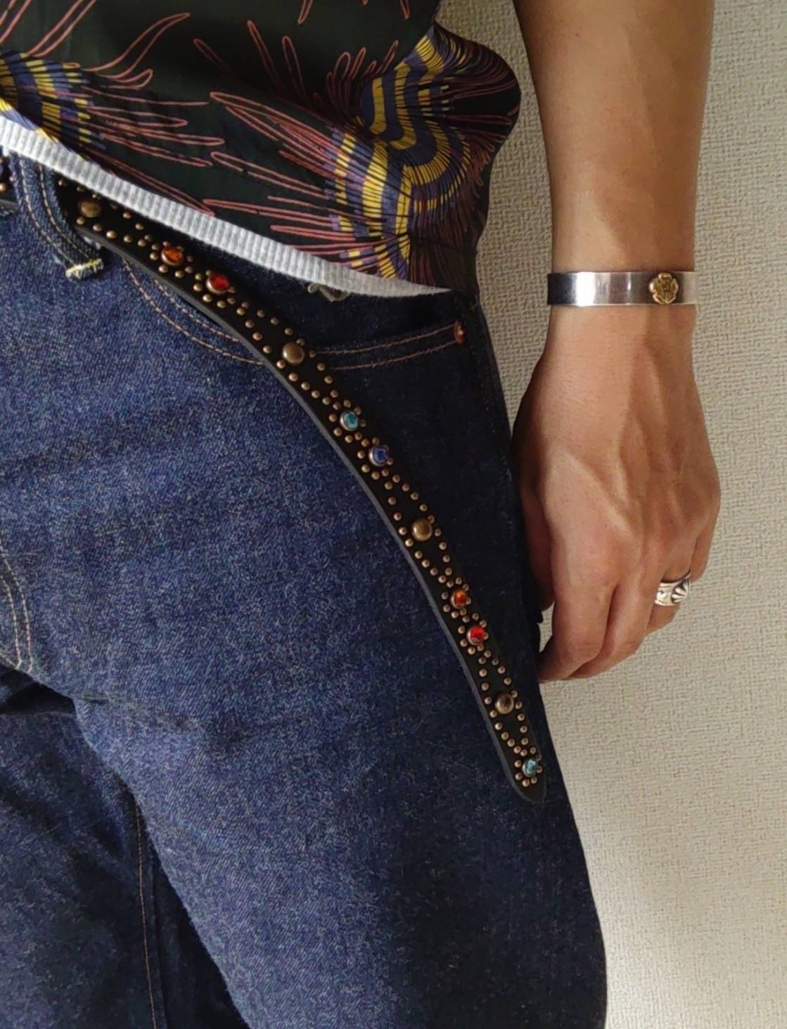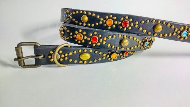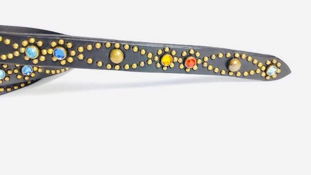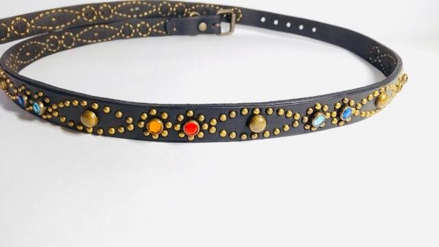 ベルト全面の360度にバタフライパターンをアンティークブラススタッズを使用し表現したナローベルト。アンティークブラスバックルを使用したALLBRASSのモデル。