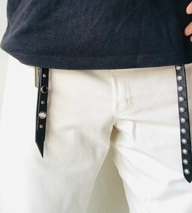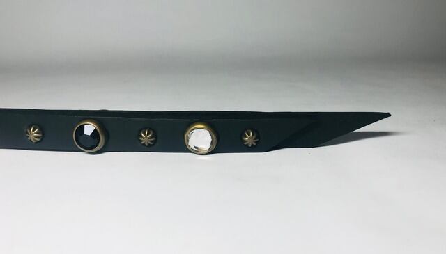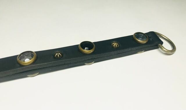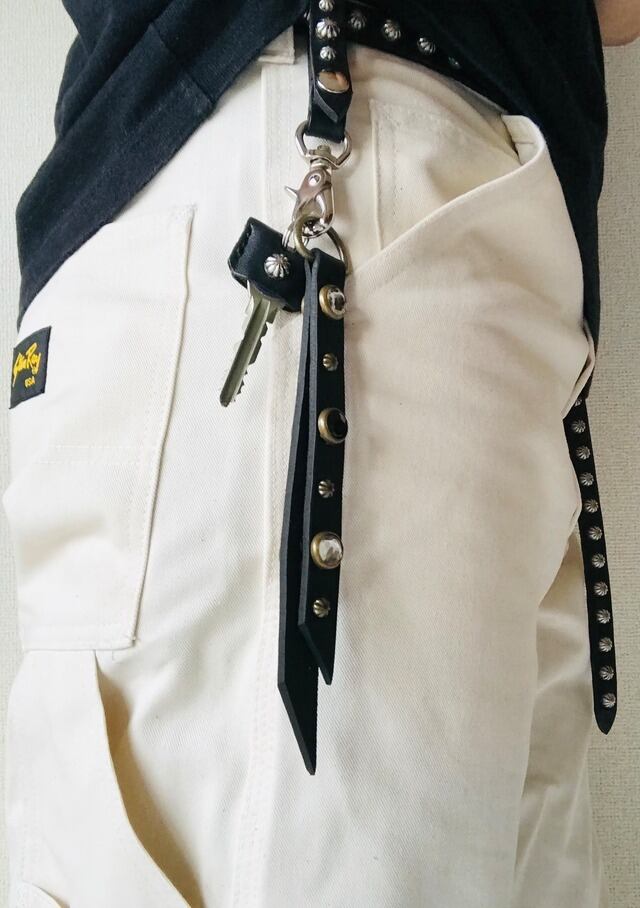 12ミリカラーストーンと6mmスモールアポロを両面に施したリバーシブルスタッズのキーリング。表裏で長さが異なるアシンメトリー。スタッズ、金具は全てアンティークブラスを使用。