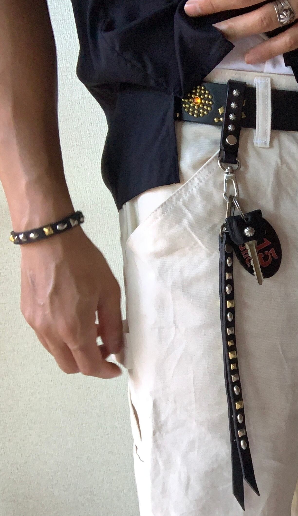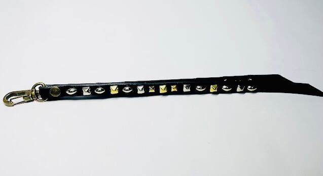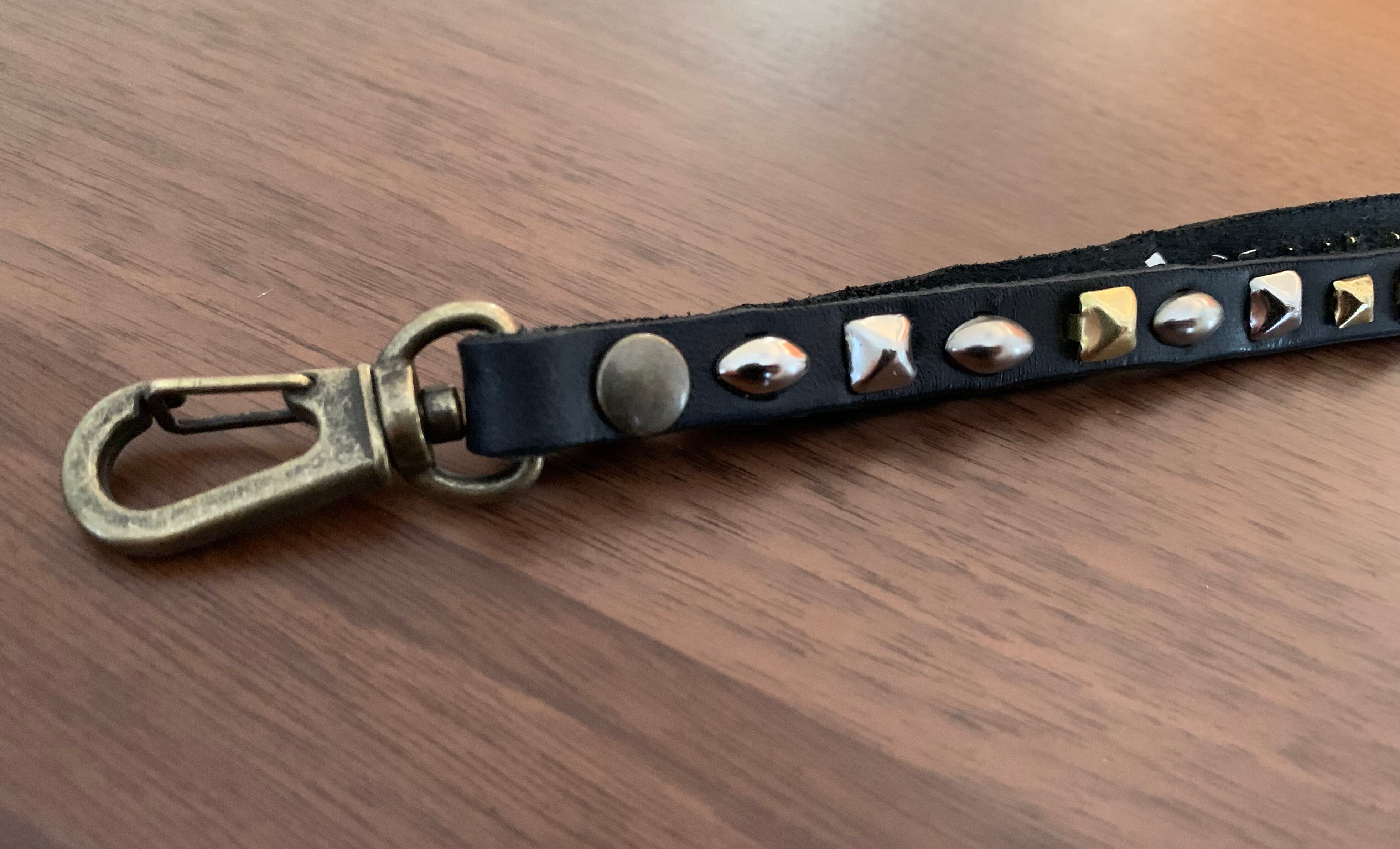 スタッズを両面に施したリバーシブルスタッズのキーリング。裏表で長さが異なるアシンメトリー、金具に回転ナスカンを使用する事で裏表が自由に動き簡単に取り外す事が可能です。