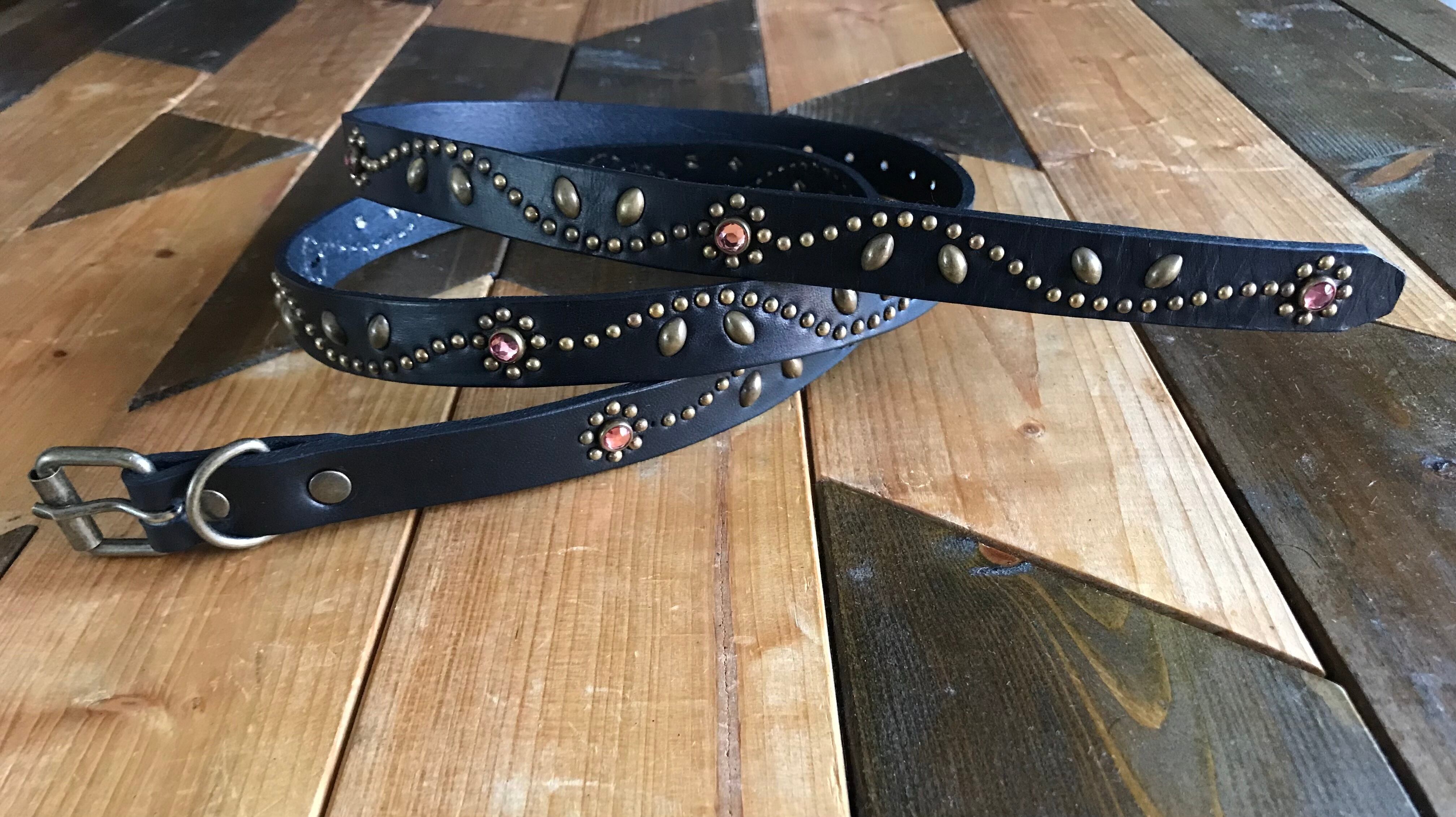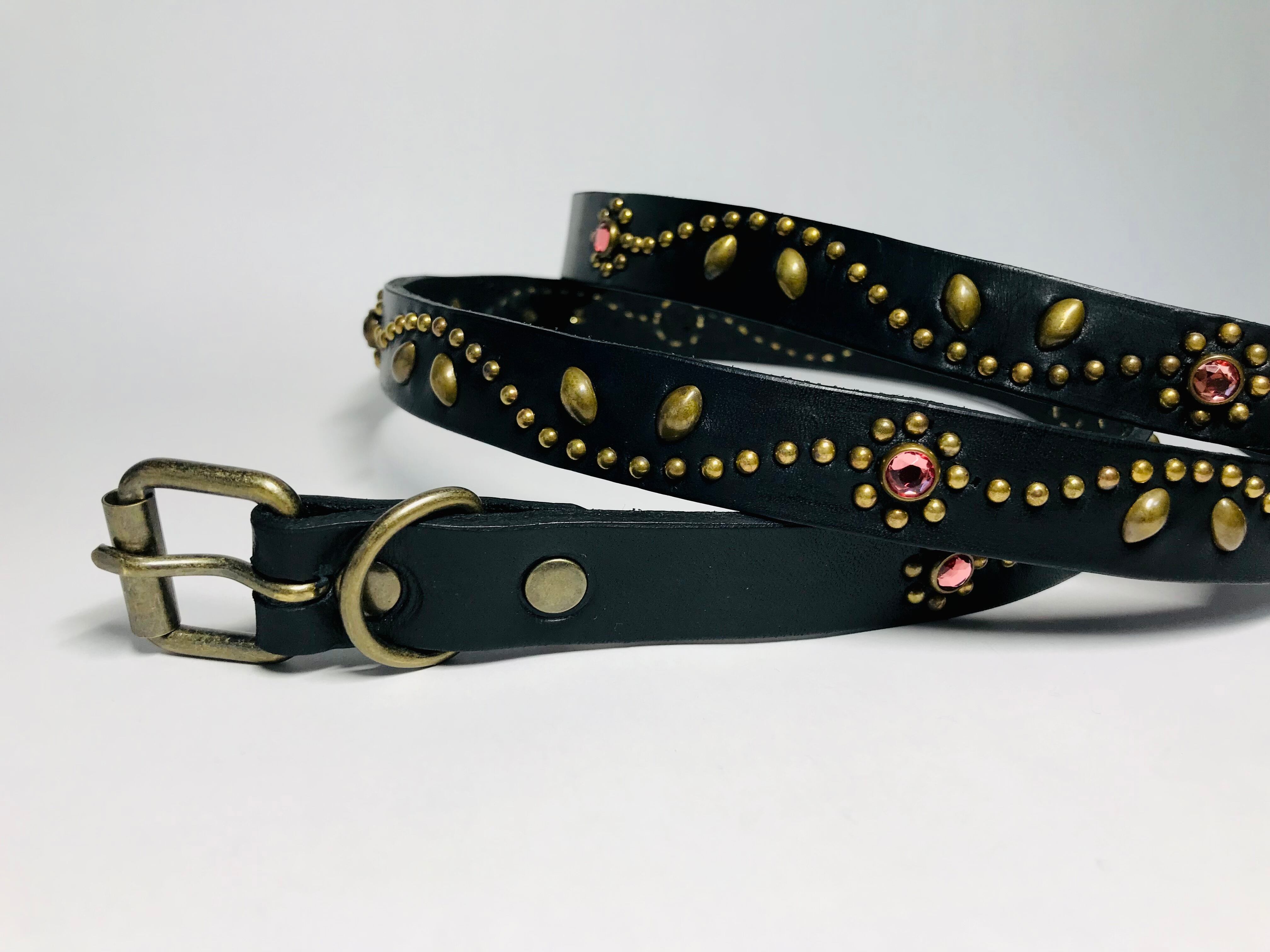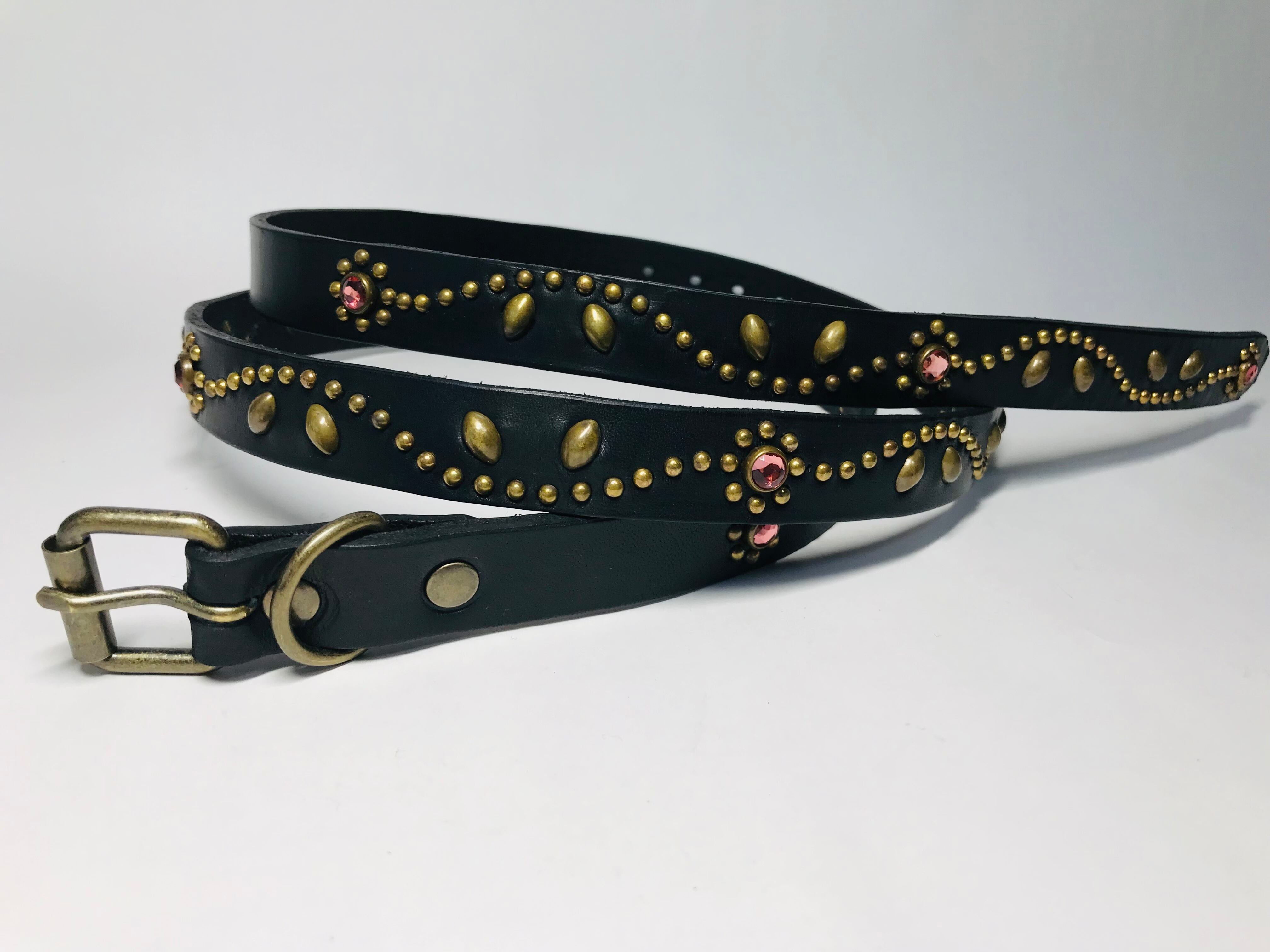 ベルト全面の360度にチューリップフラワーパターンを施したナローベルト。スタッズ、バックル金具、全てアンティークブラスを使用したALLBRASSモデル。ピンクストーンを使用、バックルの留め具がスナップボタン式ですのでバックルの取り外しが可能です。