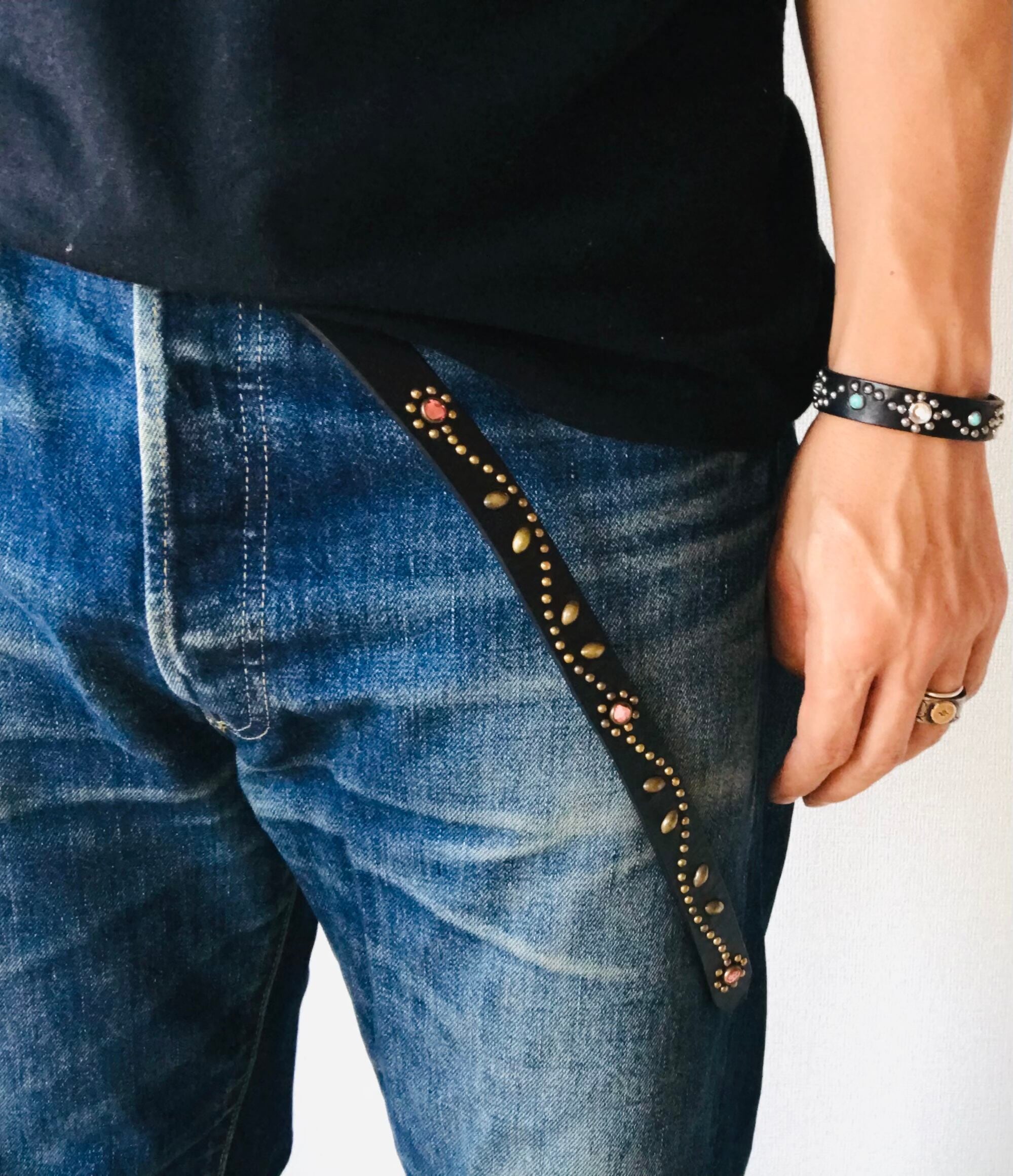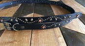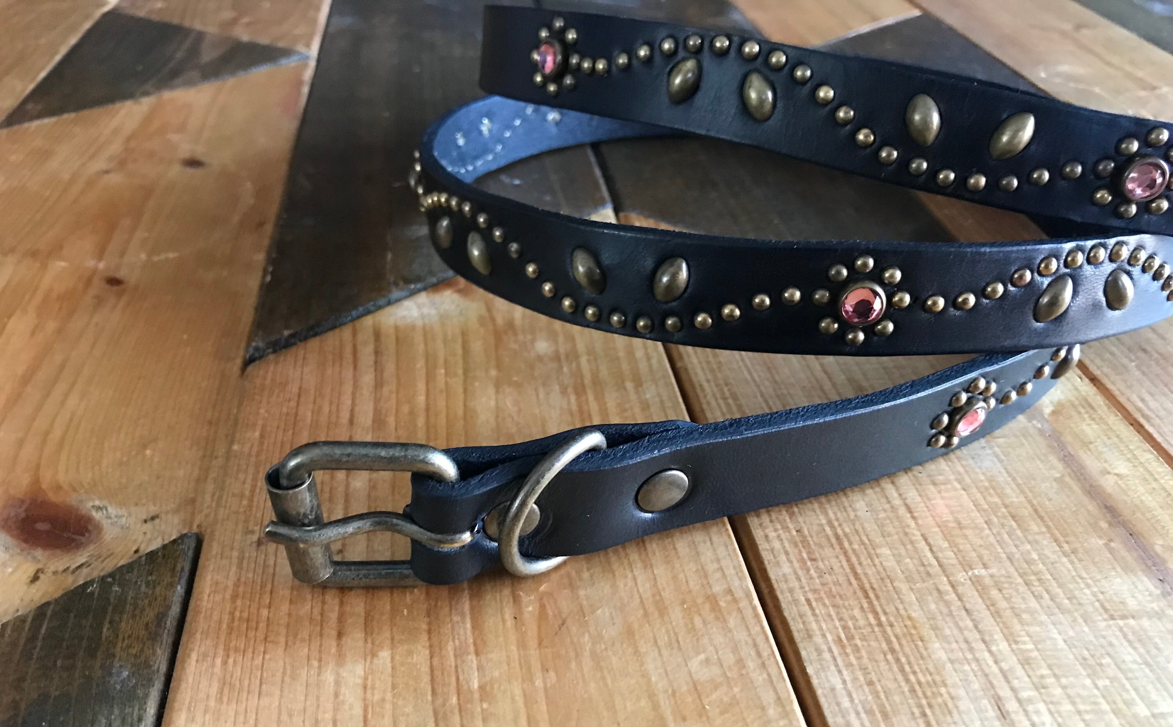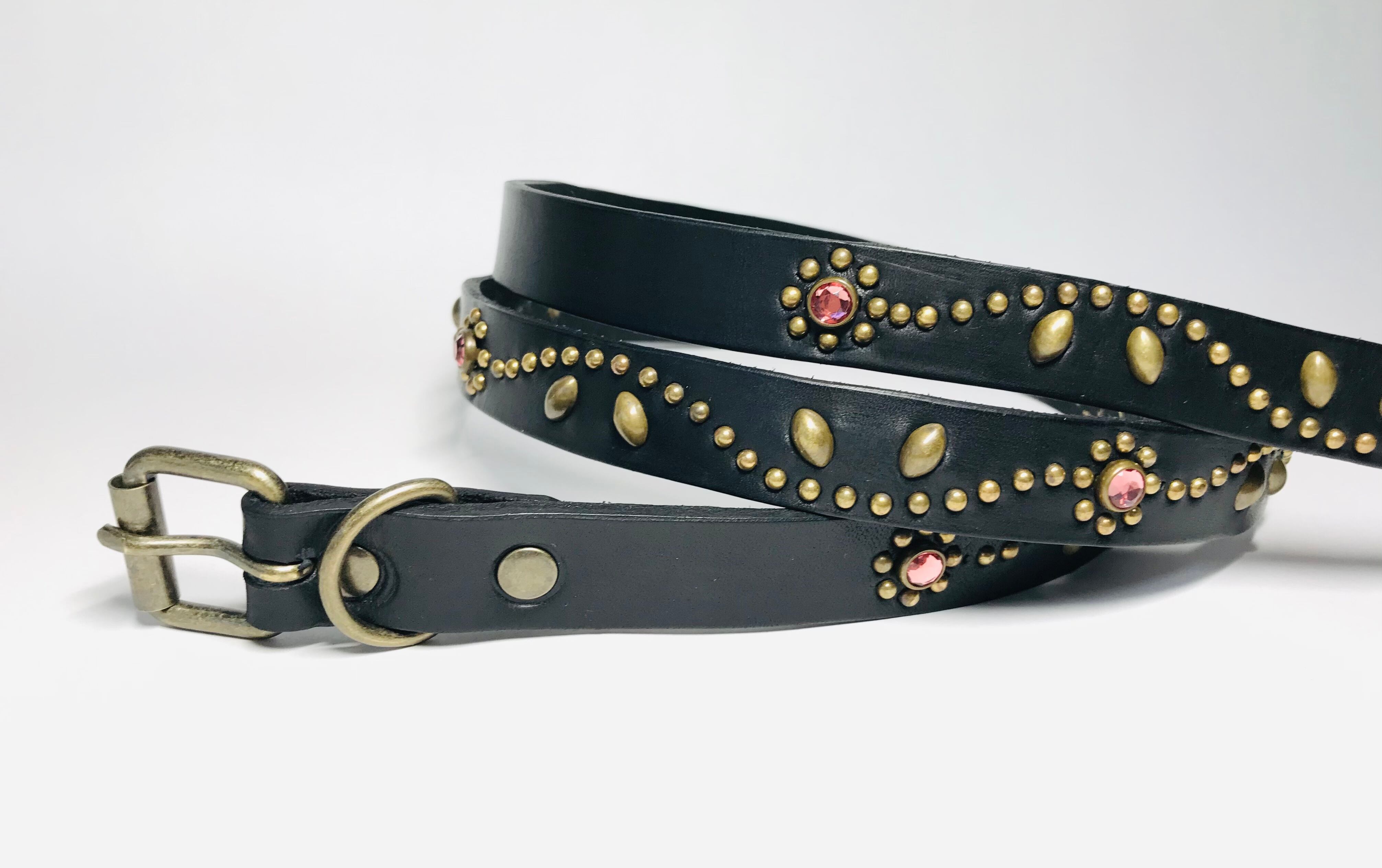 ベルト全面の360度にチューリップフラワーパターンを施したナローベルト。スタッズ、バックル金具、全てアンティークブラスを使用したALLBRASSモデル。ピンクストーンを使用、バックルの留め具がスナップボタン式ですのでバックルの取り外しが可能です。